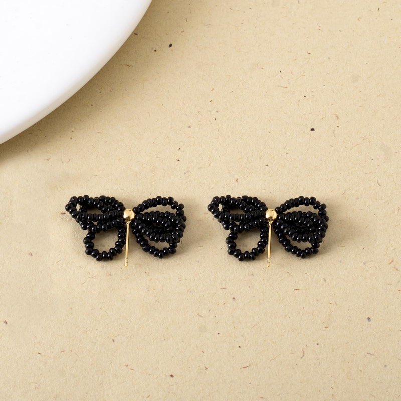 Cute, chic, and effortlessly stylish, these clustered stud earrings feature a unique bow design crafted from tiny black PVC beads. Each bead is carefully linked together, forming a thread-like structure that gives the bow a delicate, intricate feel. At the center, a single gold metal bead adds a touch of refinement.