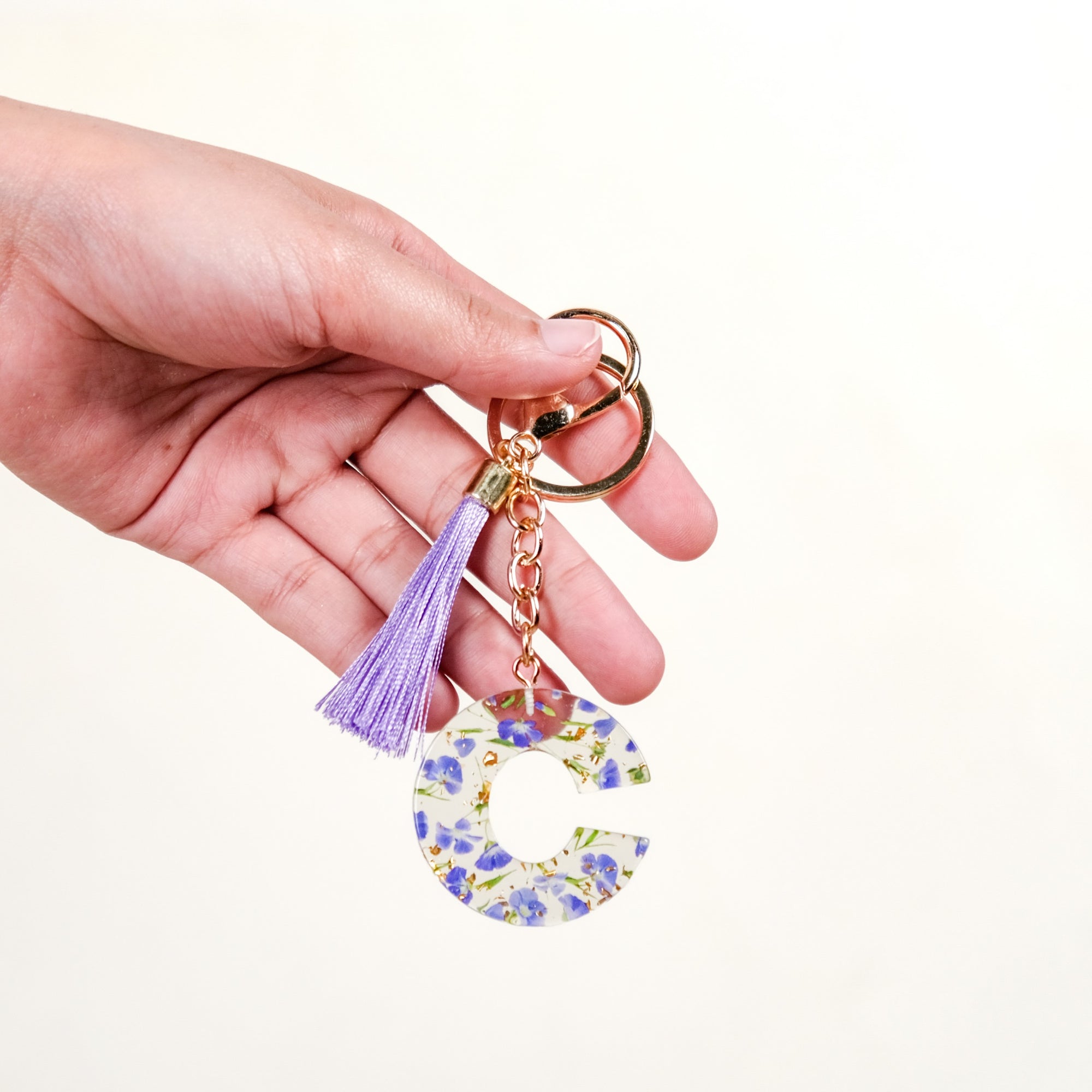 The resin keyring with the initial “C” brings together style and sentiment. Featuring delicately pressed lavender forget-me-not flowers (Myosotis) encased in the transparent resin base, the keychain symbolises precious memories. The lavender hue of the flowers blends harmoniously with golden flecks and creates a radiant yet subtle design.