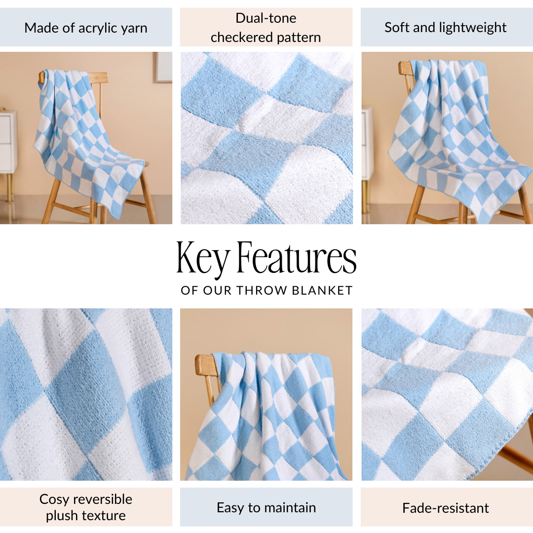 Design: This reversible acrylic yarn throw blanket features a soothing blue and white checkered pattern arranged in evenly spaced squares. The soft, plush surface features a gently textured finish with neatly woven edges, making it inviting and perfect for layering over sofas, beds, or accent chairs.