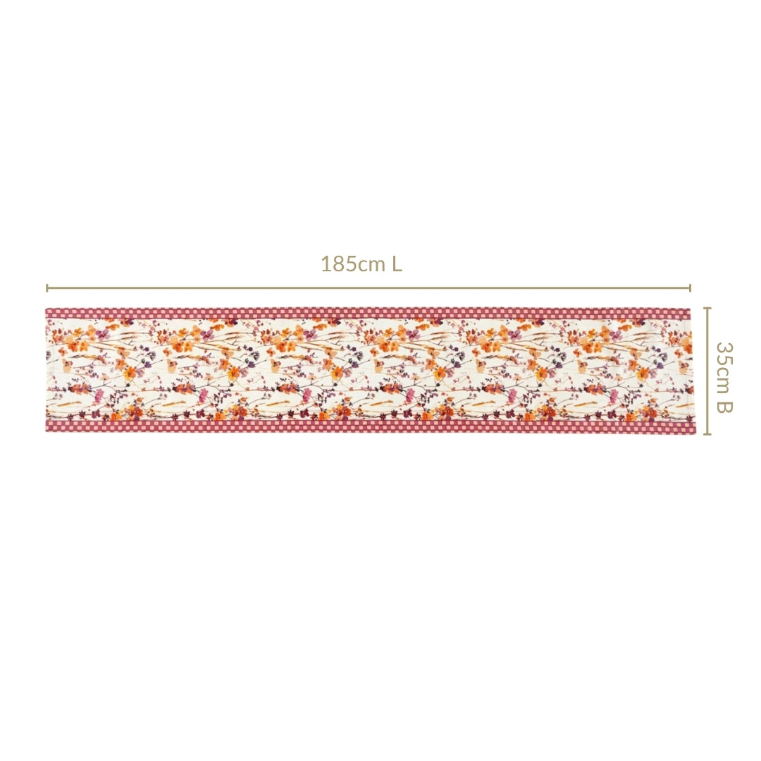 Add a burst of seasonal charm to your dining space with this delightful floral table runner. Perfectly sized for a 6-seater table, it showcases warm autumn colours and an appealing design. An acrylic coating makes this fabric water and stain-resistant.