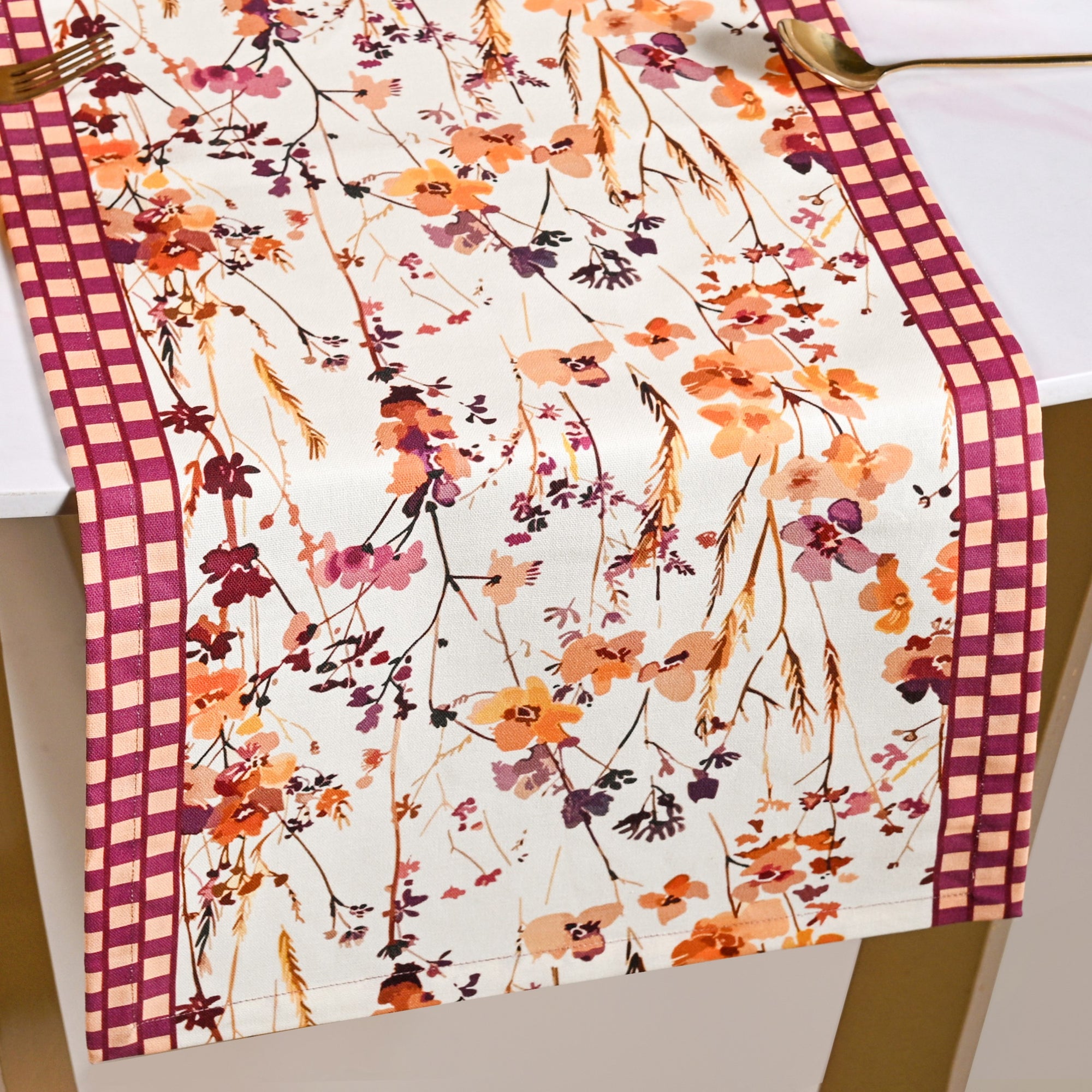Design: Bring the beauty of nature to your table with this sophisticated piece of table linen. The main fabric features a stunning, watercolour-style wildflower print in warm autumnal tones of burnt orange and deep purple. This delicate scene is expertly framed by a bold purple gingham border that runs along the length. Crucially, the woven textile is coated with an innovative acrylic polymer coating that provides excellent water repellency, offering significant protection to your table surface. The runner boasts finished hems that prevent fraying, and its long, narrow rectangular shape is perfectly suited for a larger dining setting.
