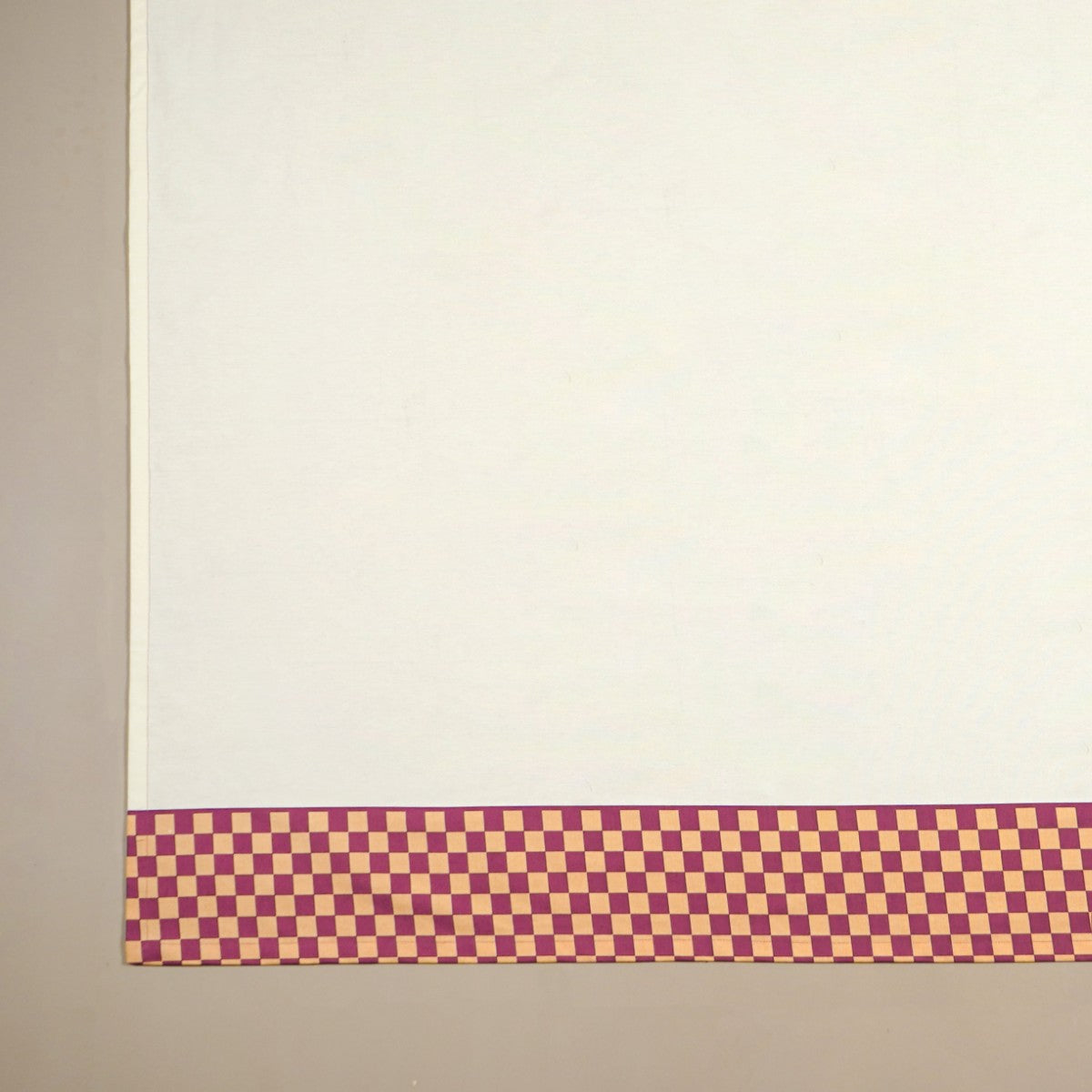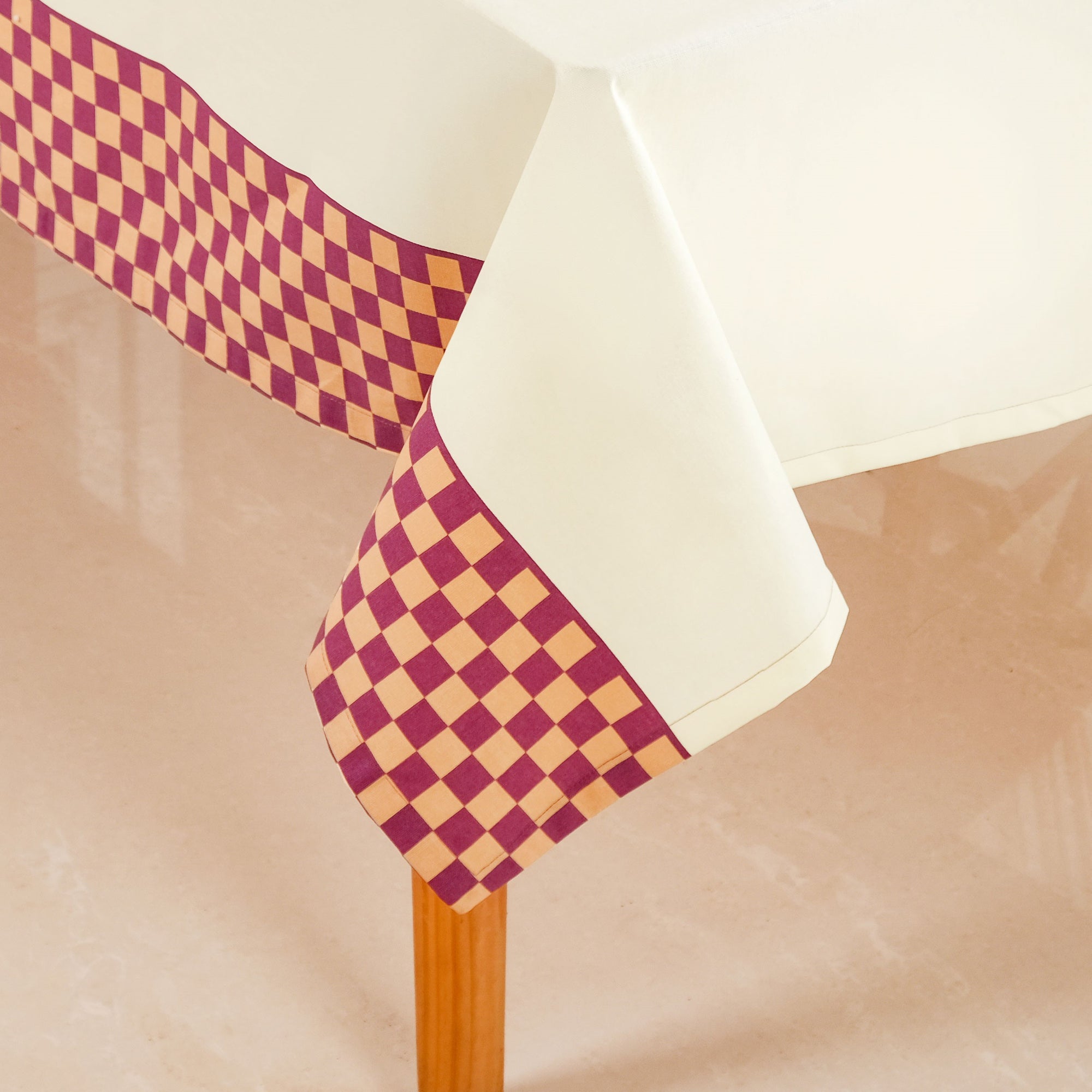 Design: Crafted from 100% pure cotton with a blend of acrylic polymer coating, this elegant tablecloth features a soothing off-white base that instantly adds a minimalist look to any tablescape. The border is adorned with a neatly aligned checkered pattern in warm mulberry and peach hues, creating a beautiful balance of subtle contrast and charm. The soft cotton weave adds texture and a touch of understated sophistication, making it a versatile piece for both everyday and festive dining.