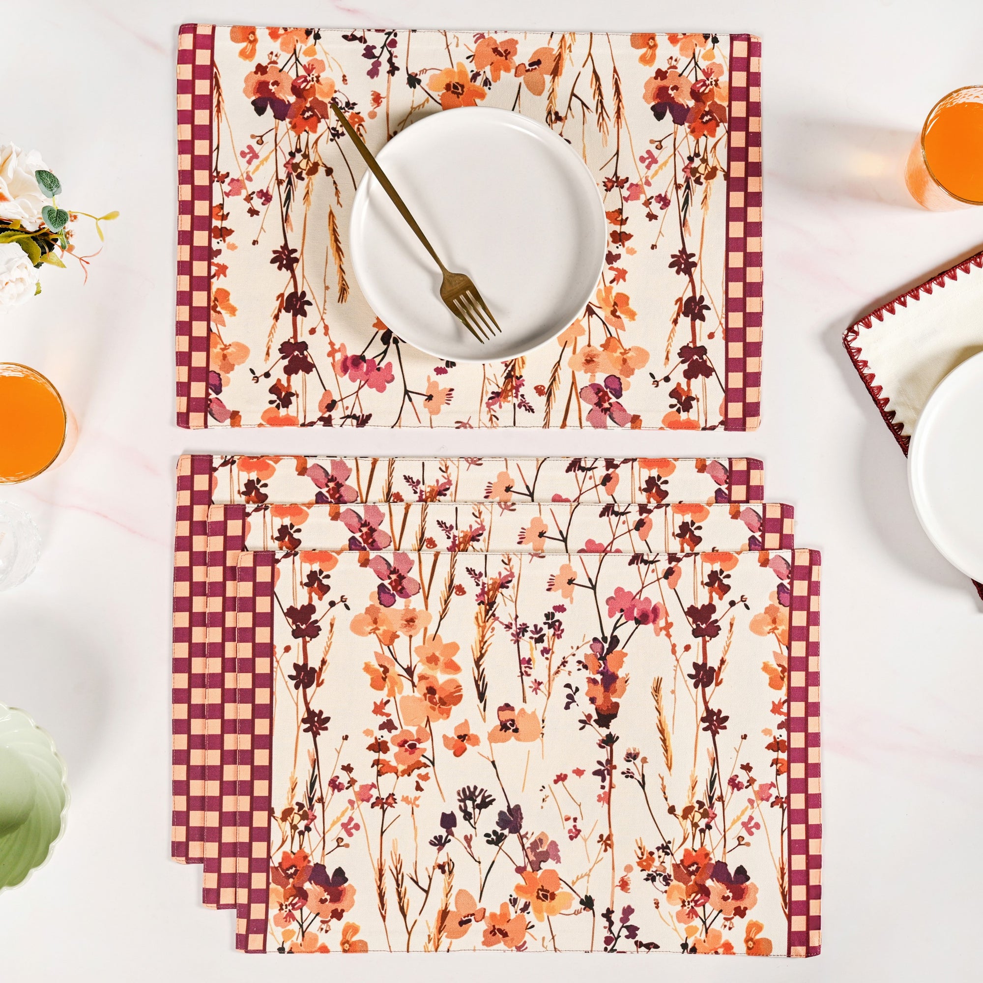 Design: This set of four reversible table mats showcases a stunning floral design featuring delicate sprigs and blossoms in shades of ochre, mauve, lavender, and plum against a soft cream background. The borders are adorned with a contrasting checkered pattern in warm purple and beige tones, adding a rustic yet elegant charm. Made from pure cotton, the mats exude a handcrafted aesthetic that beautifully balances vib/rancy and subtlety, perfect for both everyday meals and festive dining.