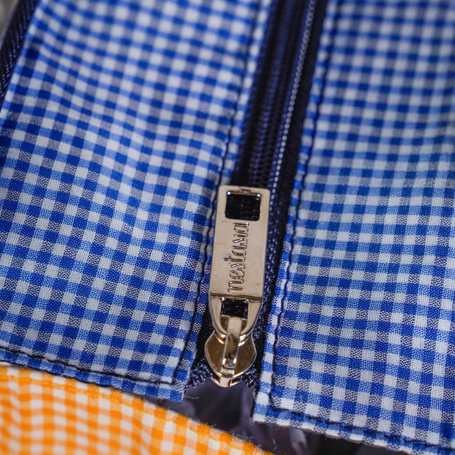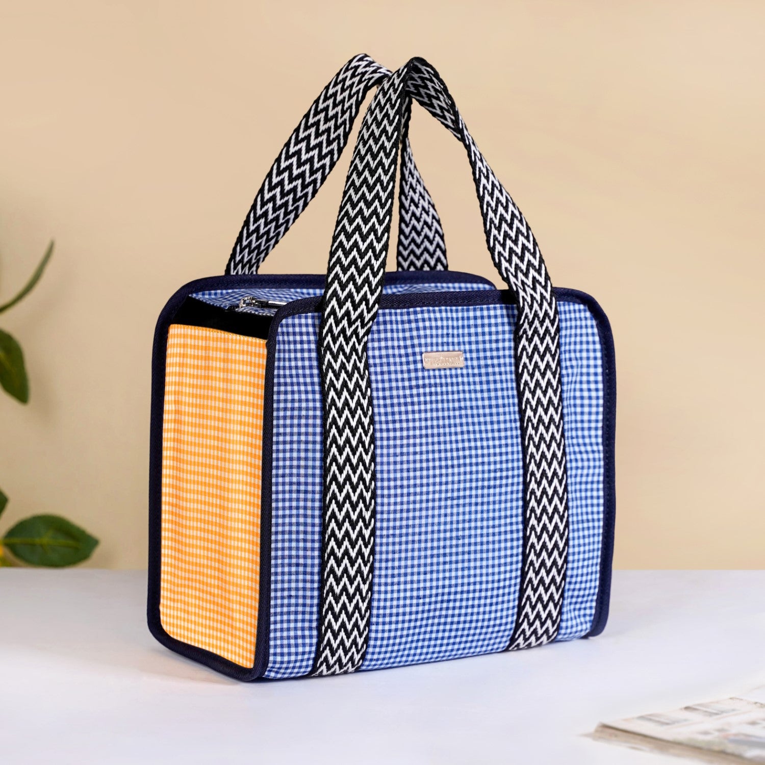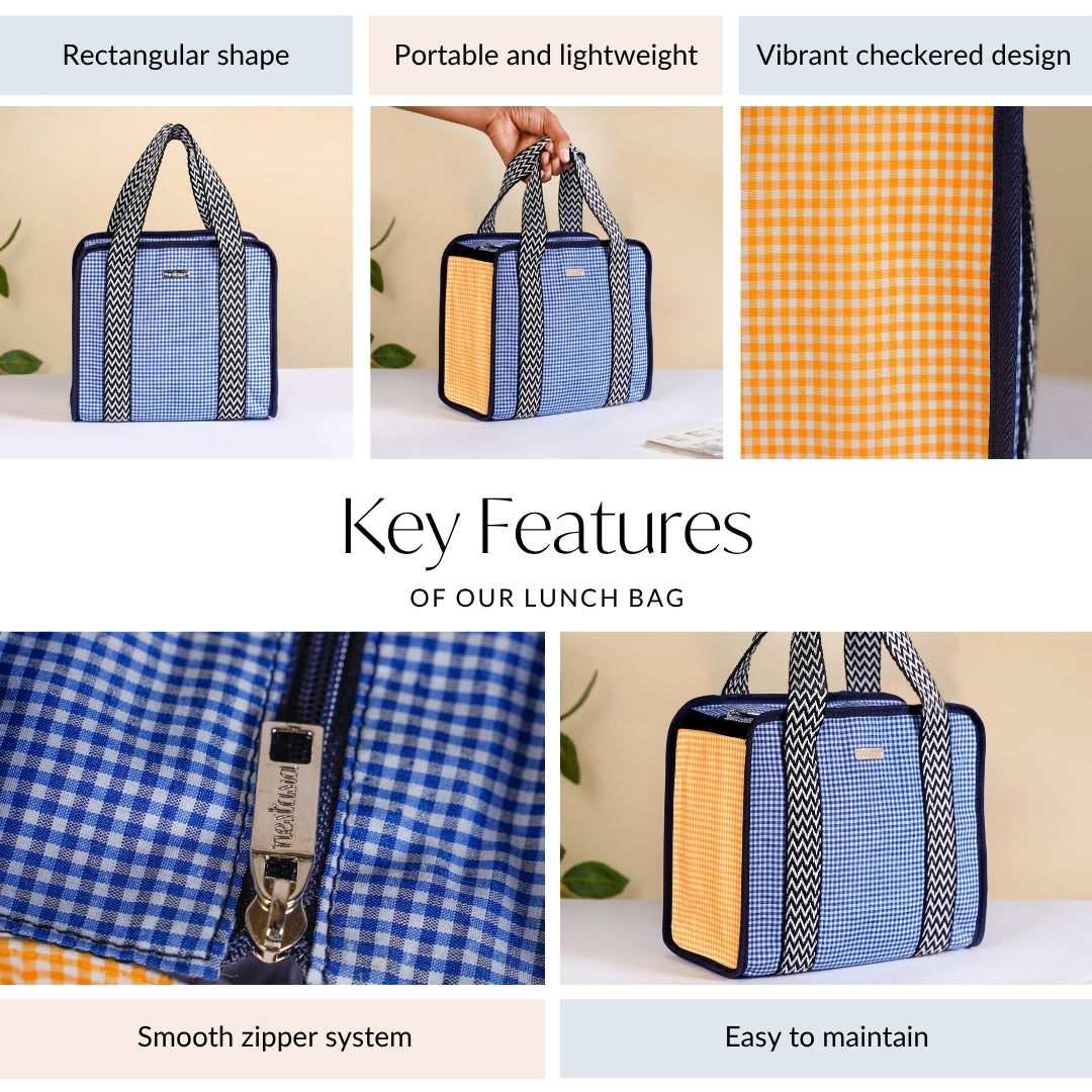 Design: This chic rectangular lunch bag features a timeless blue and white checkered pattern on the main body, elegantly contrasted with a lively yellow checkered pattern on the sides. The two sturdy handles, with a bold black and white zig-zag design, provide a secure and comfortable grip. A smooth zipper system keeps your meals safely enclosed, while a convenient outer mesh pocket is perfectly sized for a water bottle. Inside, the black interior offers smart organisation with an inner strap to secure cutlery and a separate inner pocket for storing smaller essentials.