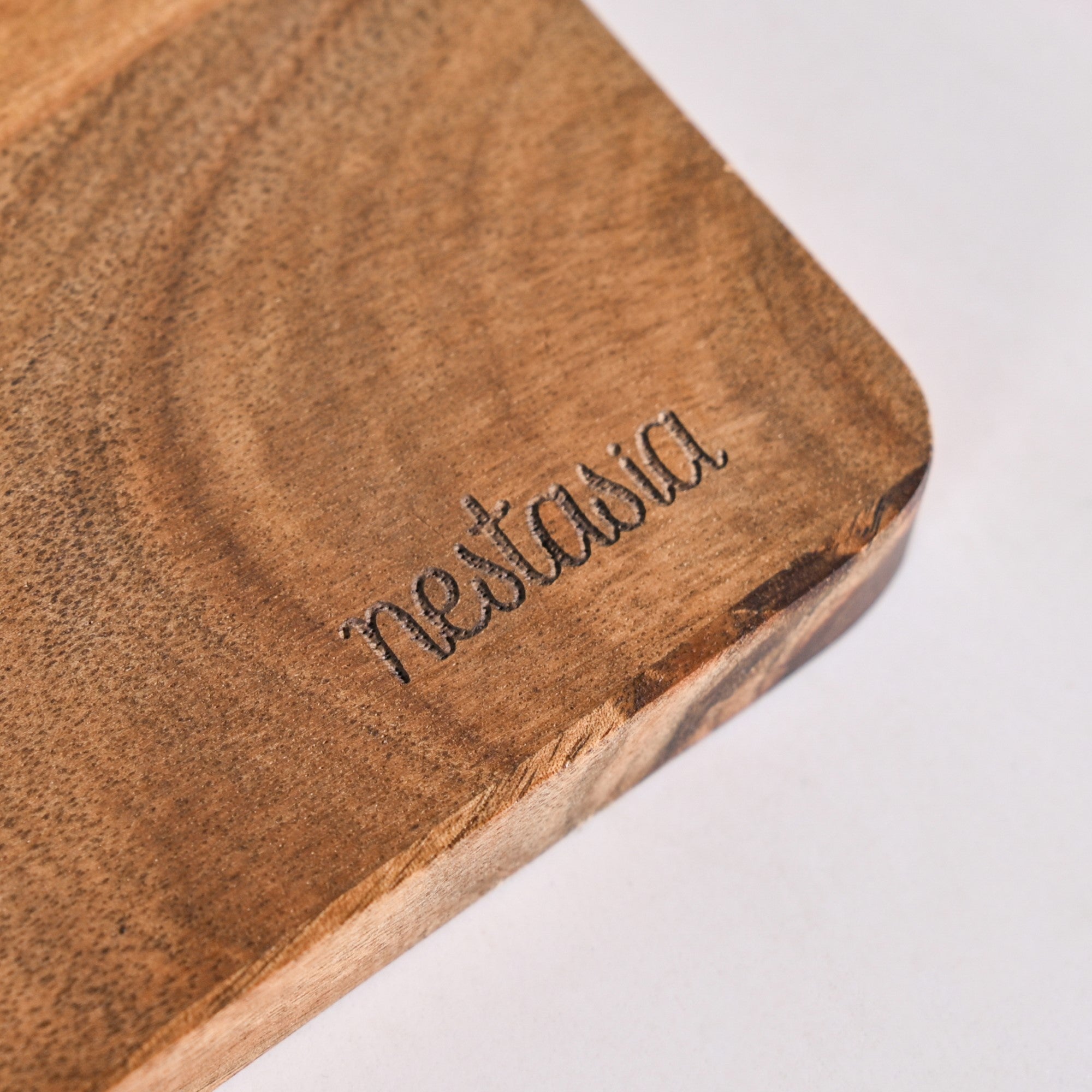 Design: This cheeseboard is beautifully crafted from premium acacia wood, showcasing natural grain patterns in varying warm tones of honey and deep brown. Its rectangular shape is enhanced with smooth, rounded corners for a refined finish. The board features built-in grooves that are perfectly fitted to hold a stainless steel cheese fork and a pointed cheese knife. Both of these come with sturdy wooden handles for a cohesive look. The minimalist yet functional design combines rustic charm with elegance, making it an ideal piece for stylish serving. Made from 100% acacia wood, use a damp cloth to wipe and let it air dry for long-lasting use.
