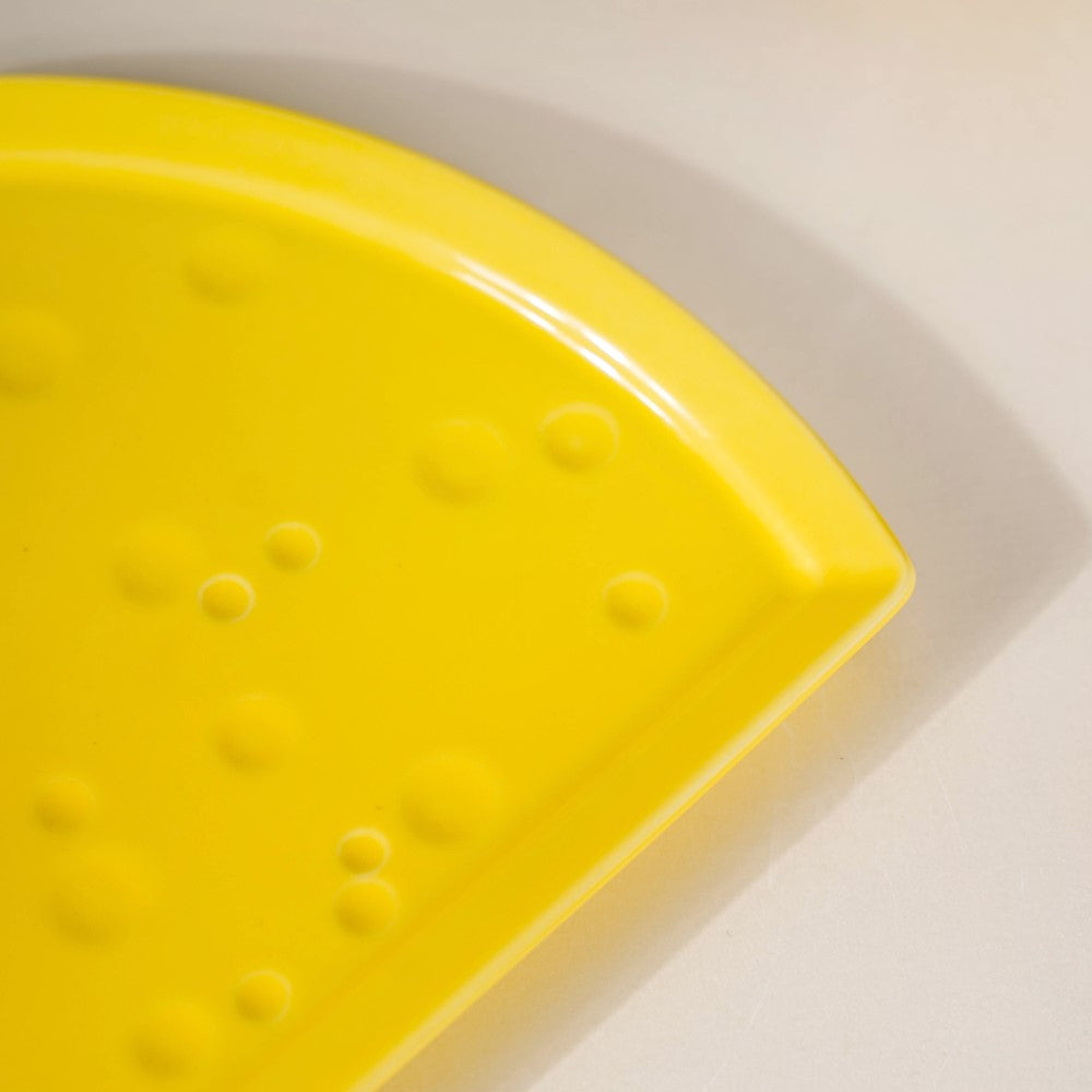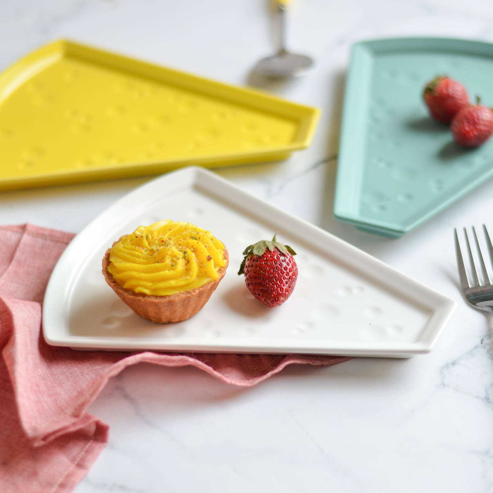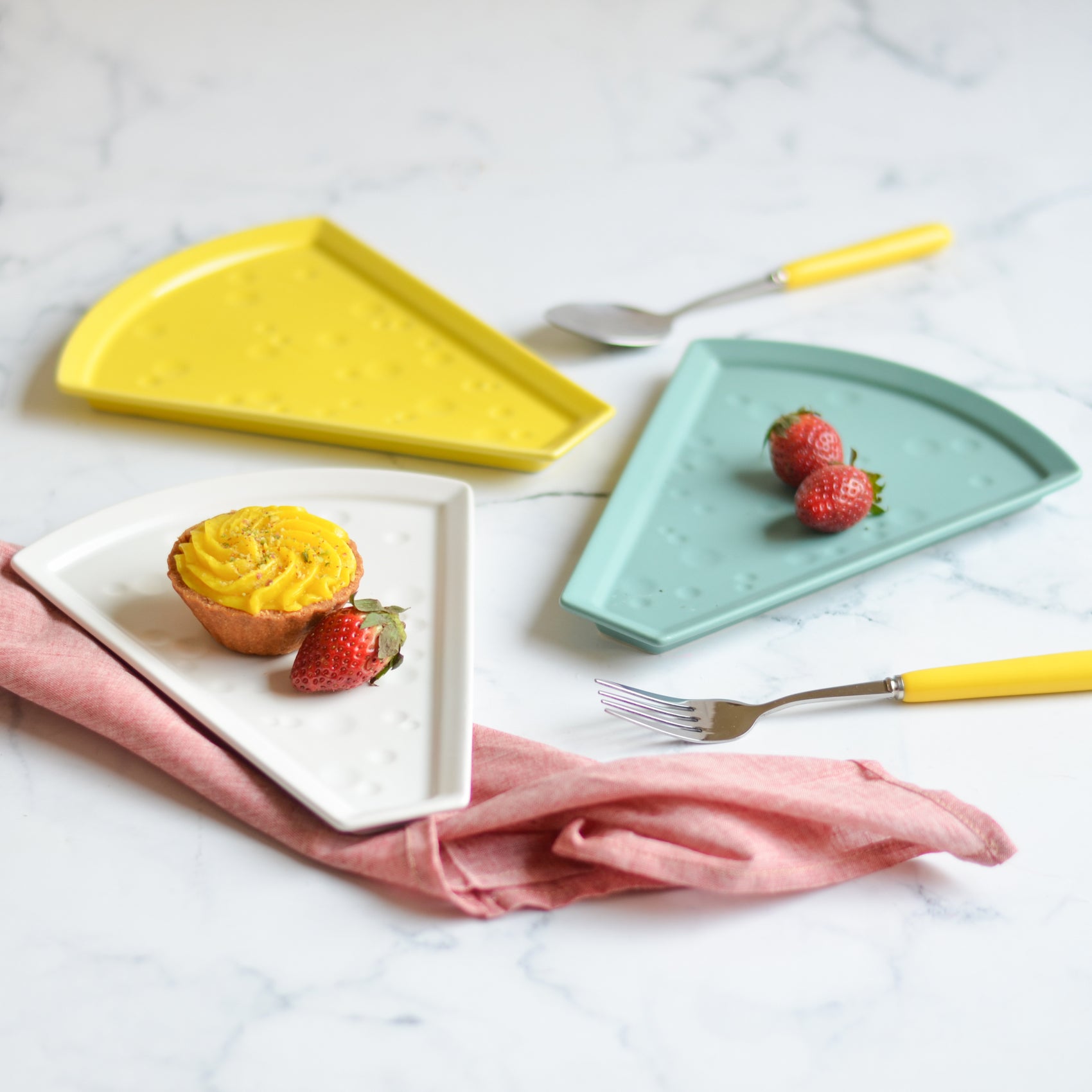 Cheese plates in 3 shades that are apt for serving cheesy starters. The snack plates can also be used as dessert plates or salad plates that will make the dish look as tempting as the plates. One will not get enough of eating when served on the bright looking cheese plates. The plates are easy to serve, stack and store.