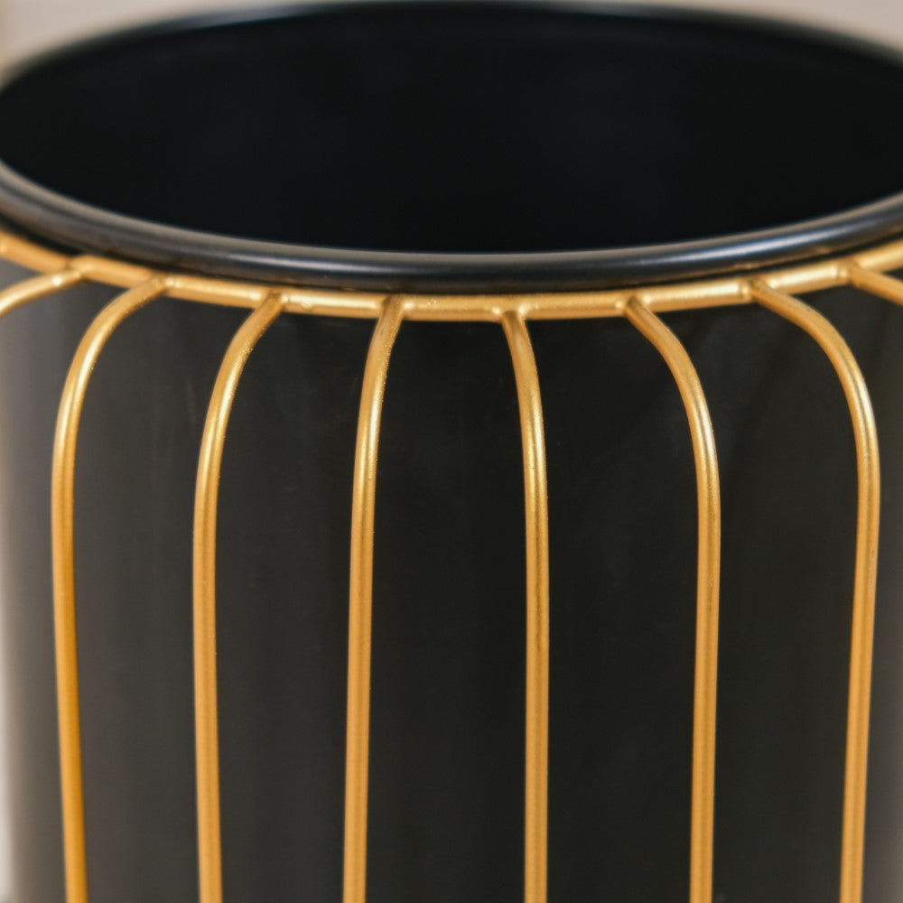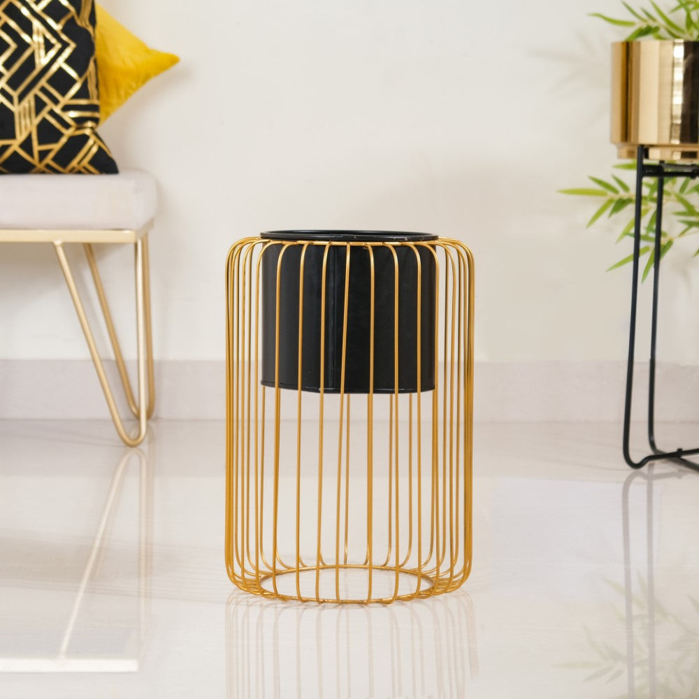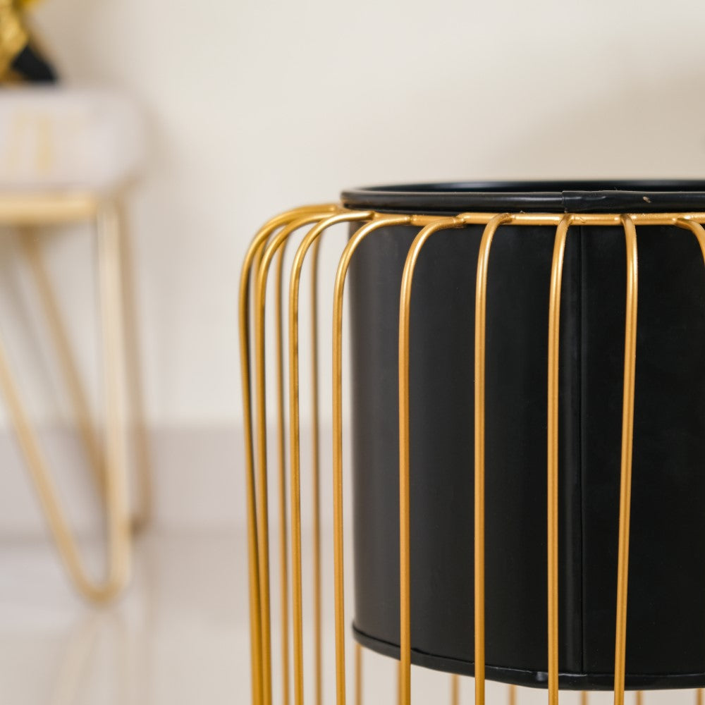 The elegant and contemporary floor metal planter features a black pot in a wired gold coloured stand that is sure to enhance the look of your house or indoor space. The modern and sophisticated design of this planter will make your flowers or plants stand out with the indoor or outdoor plant stand’s elevated form. This beautiful planter is versatile and perfect to house natural plants, or even artificial greenery. The combination of the black pot and the wired gold stand adds a touch of elegance to your space and will accentuate any room in your home. The durable metal material of the pot and stand makes it ideal for use outdoors, as it is durable and lighter than other materials. Whether you're looking to enhance the look of your living room or add sophistication to your garden, the modern planter is the perfect choice.