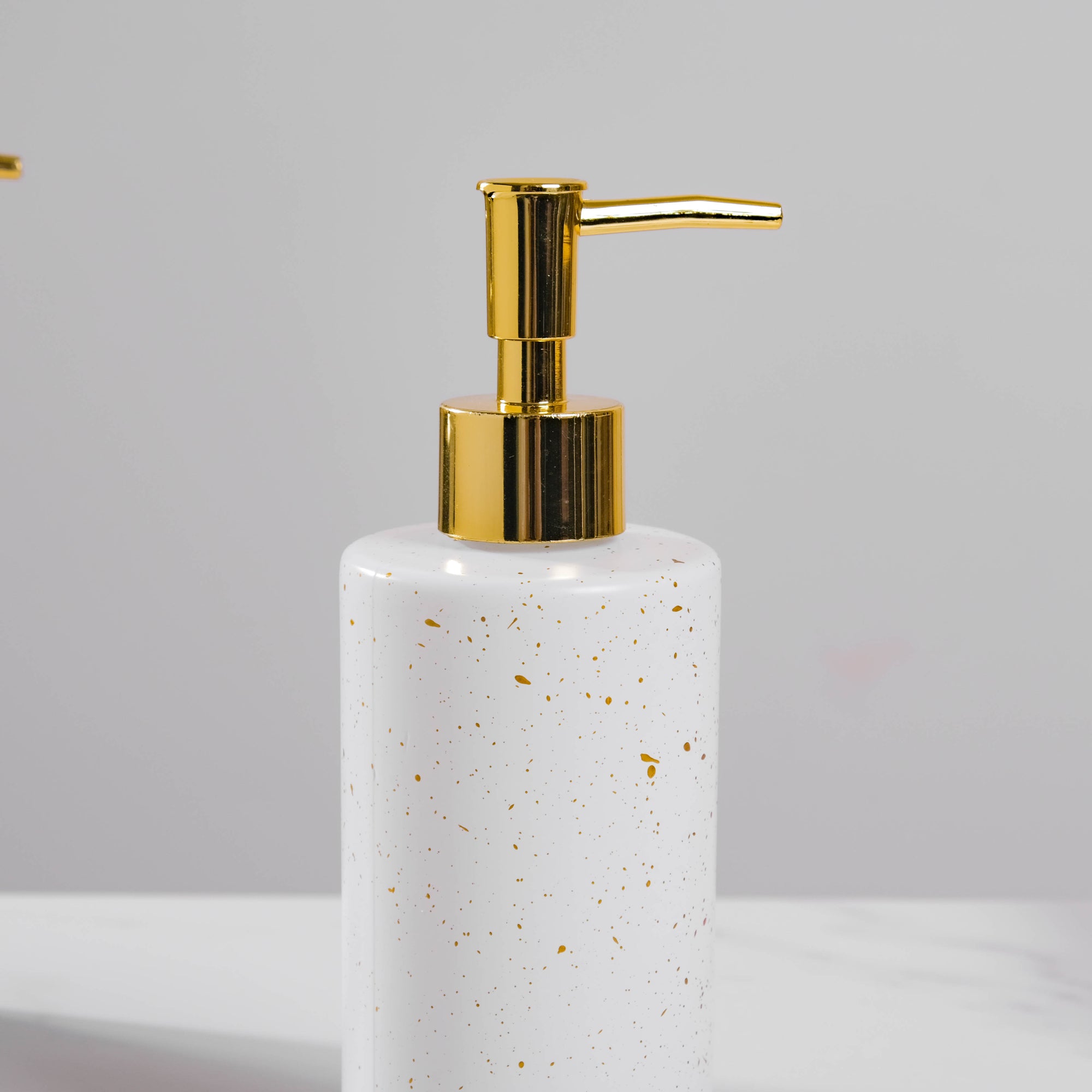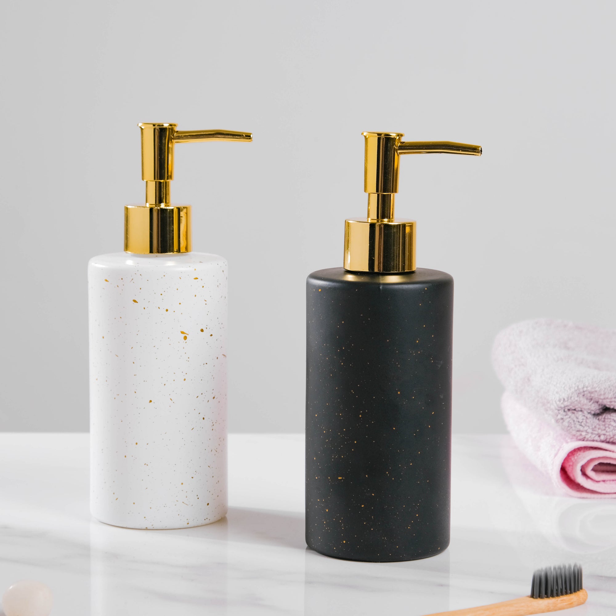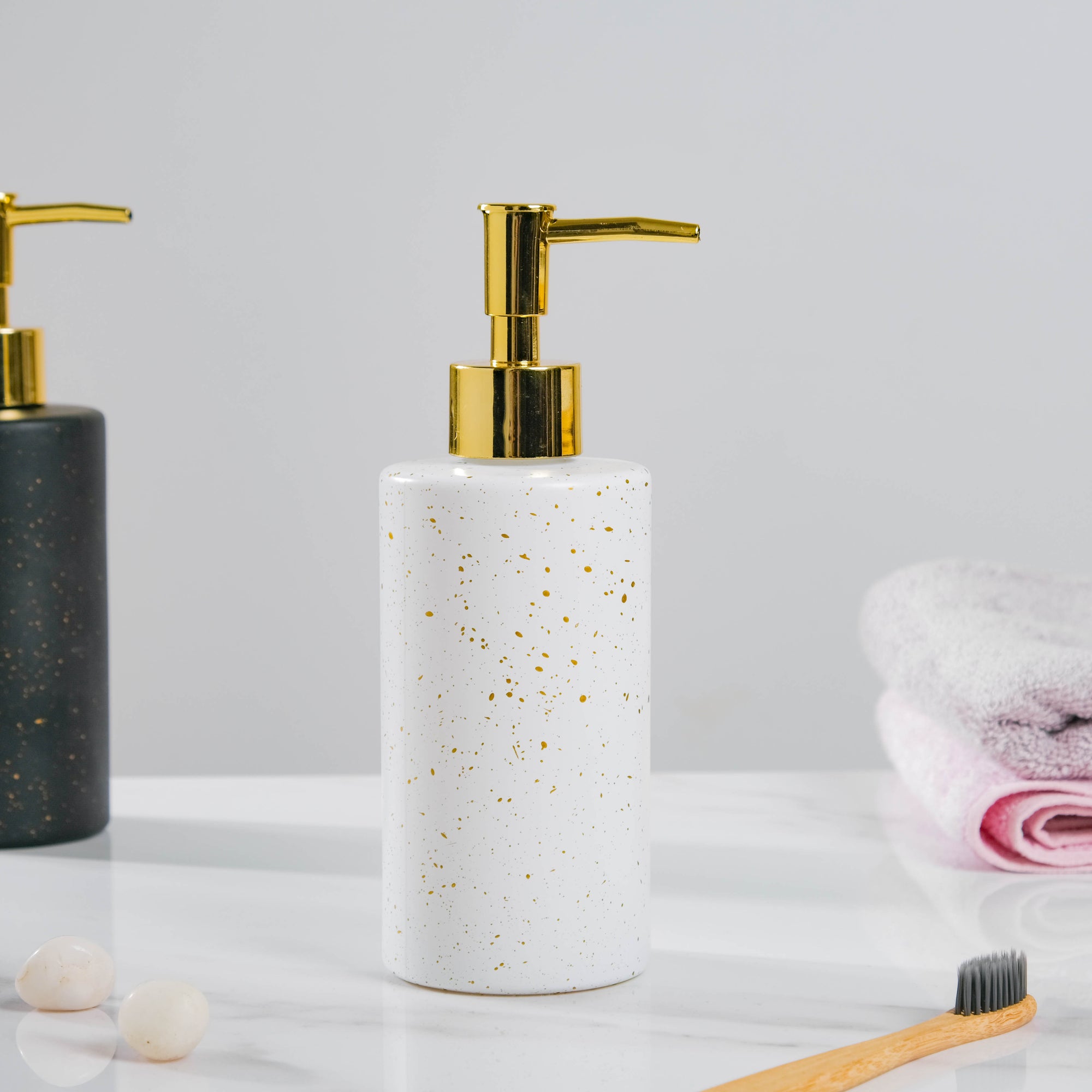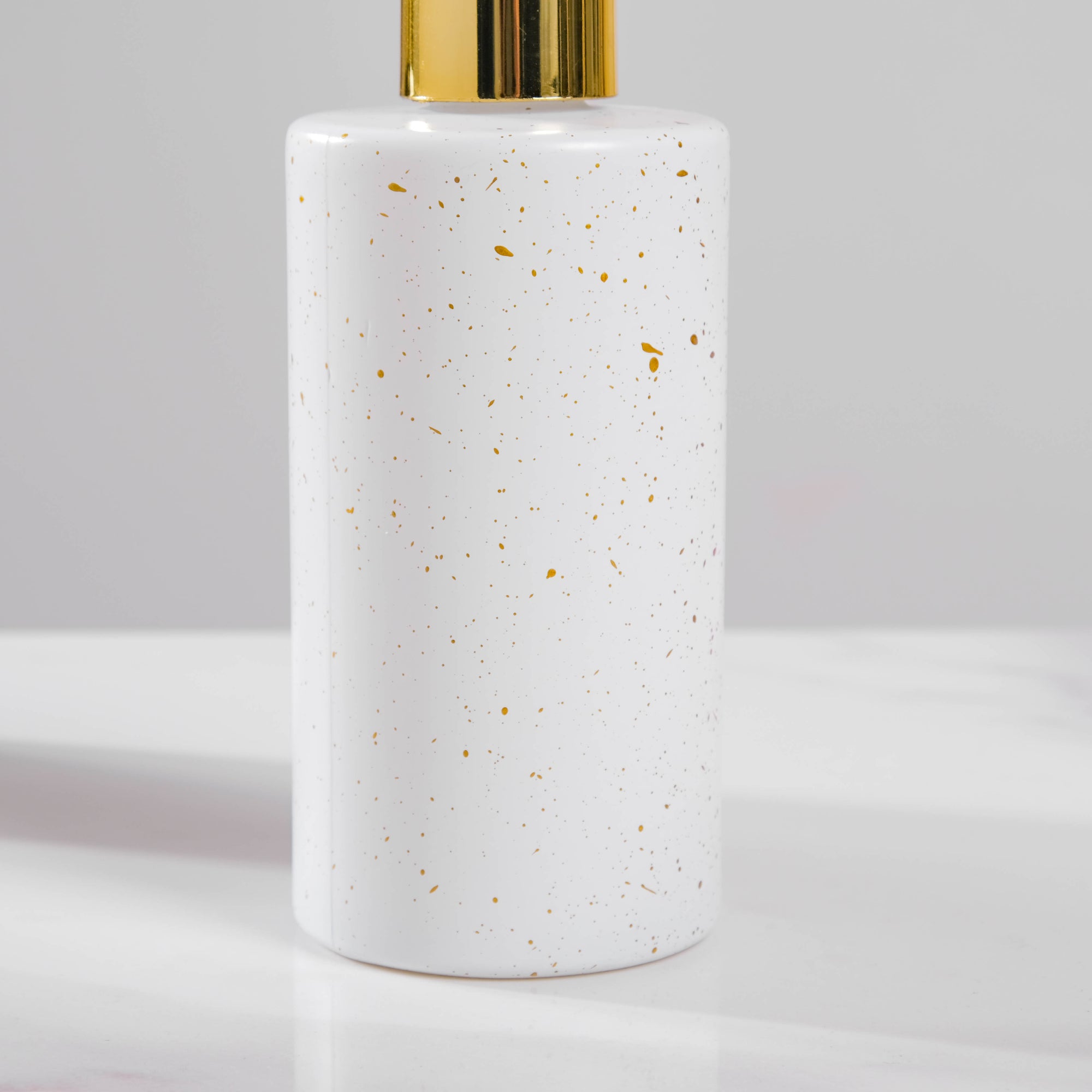 The white bathroom dispenser with a golden nozzle adds a beautiful charm to any space. The use of trendy soap dispensers can enhance the bathroom's décor. In the front parlor, the dispenser is excellent for keeping hand sanitizer. It can also be used as a lotion bottle for your vanity. The dispenser can provide a wonderful touch of shimmer and glitter to any setting, as well as make the bathroom counter appear neat, transforming the mood into something even more pleasant.