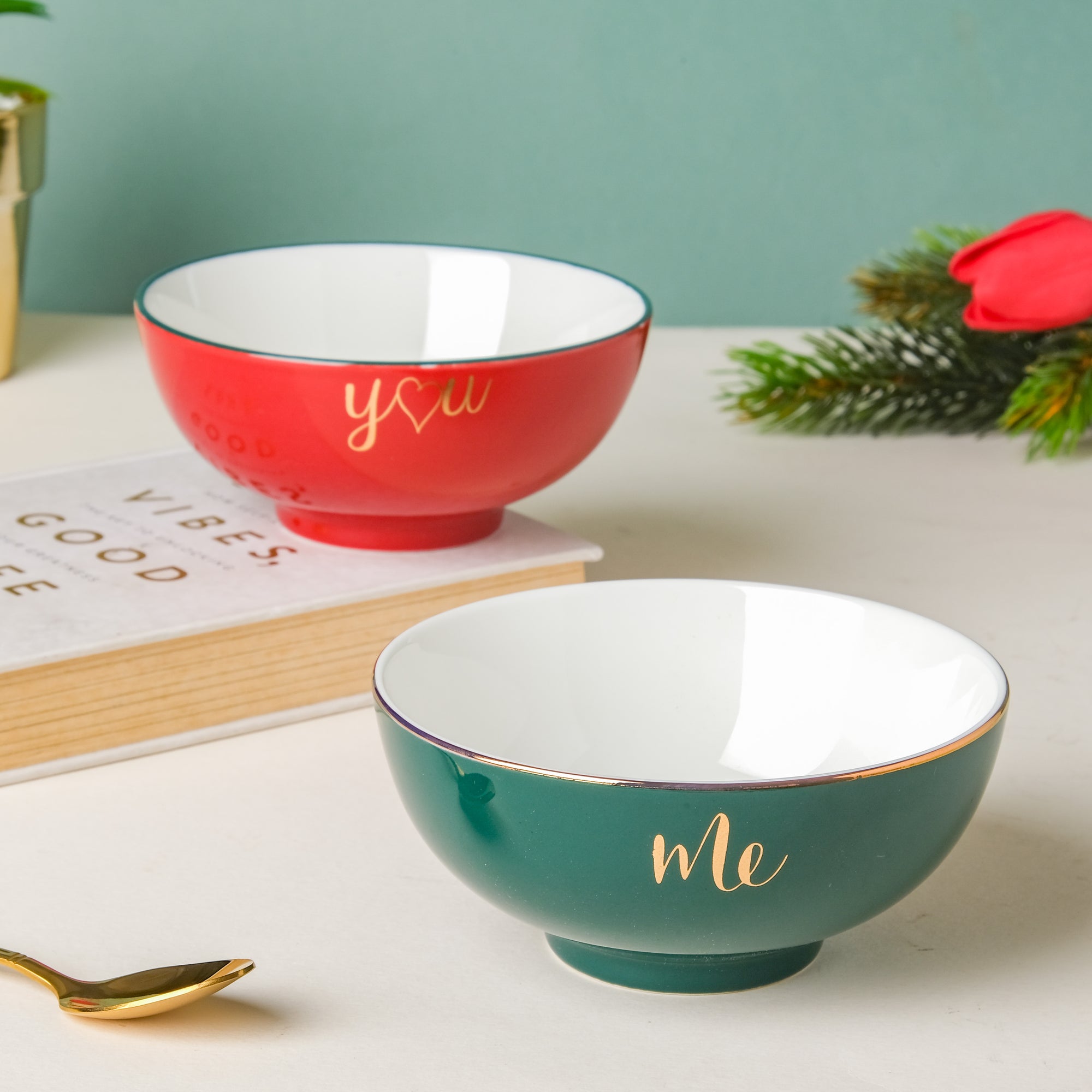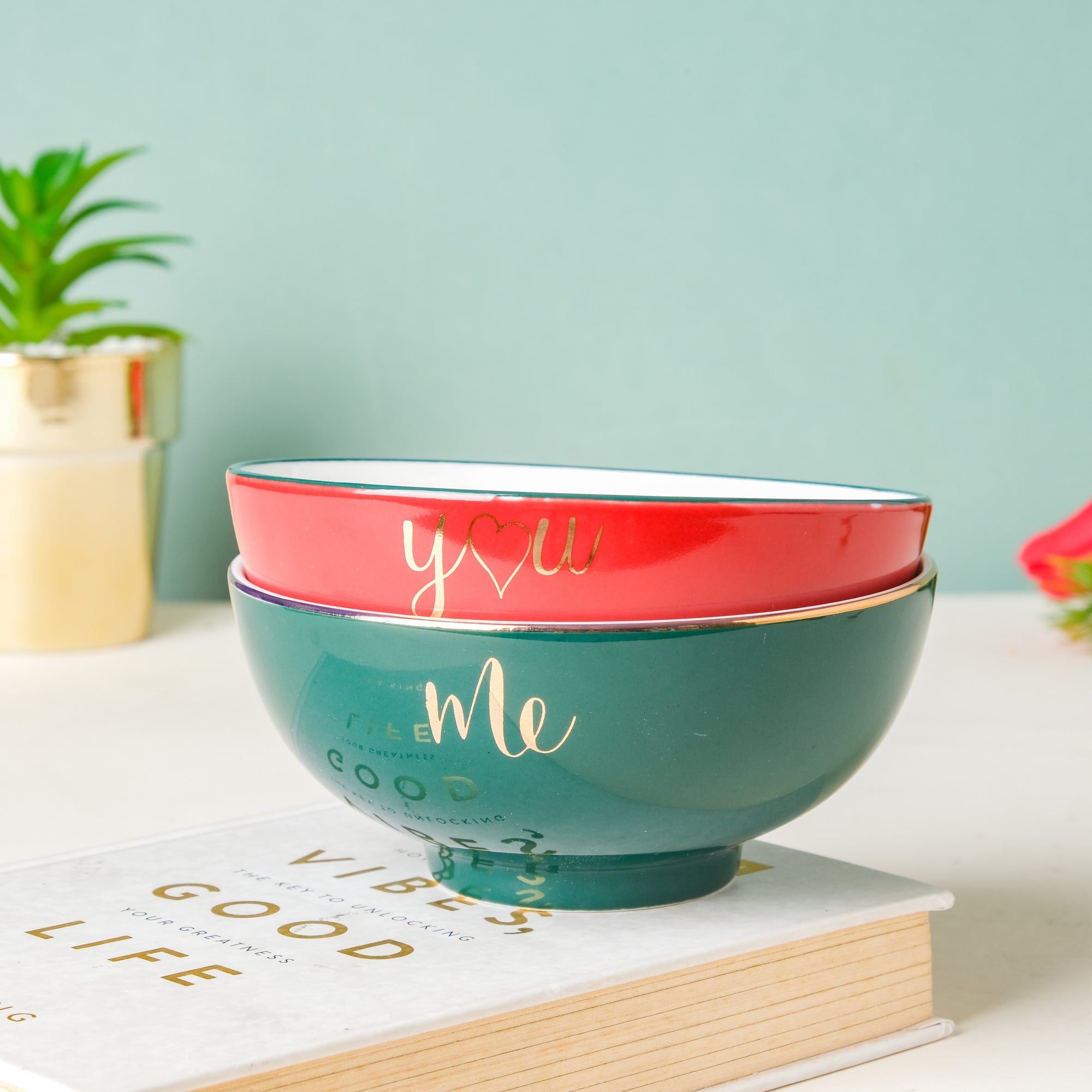Ceramic curry bowl in vibrant red and green shades with simple written prints in gold, ideal for presenting snacks at gatherings. The ceramic bowl can be used as a rice bowl, a pasta bowl, or even as a noodle bowl. The deep bowl has an elevated bottom with a golden rim and the color scheme makes it ideal for being used to serve food at dinner parties.