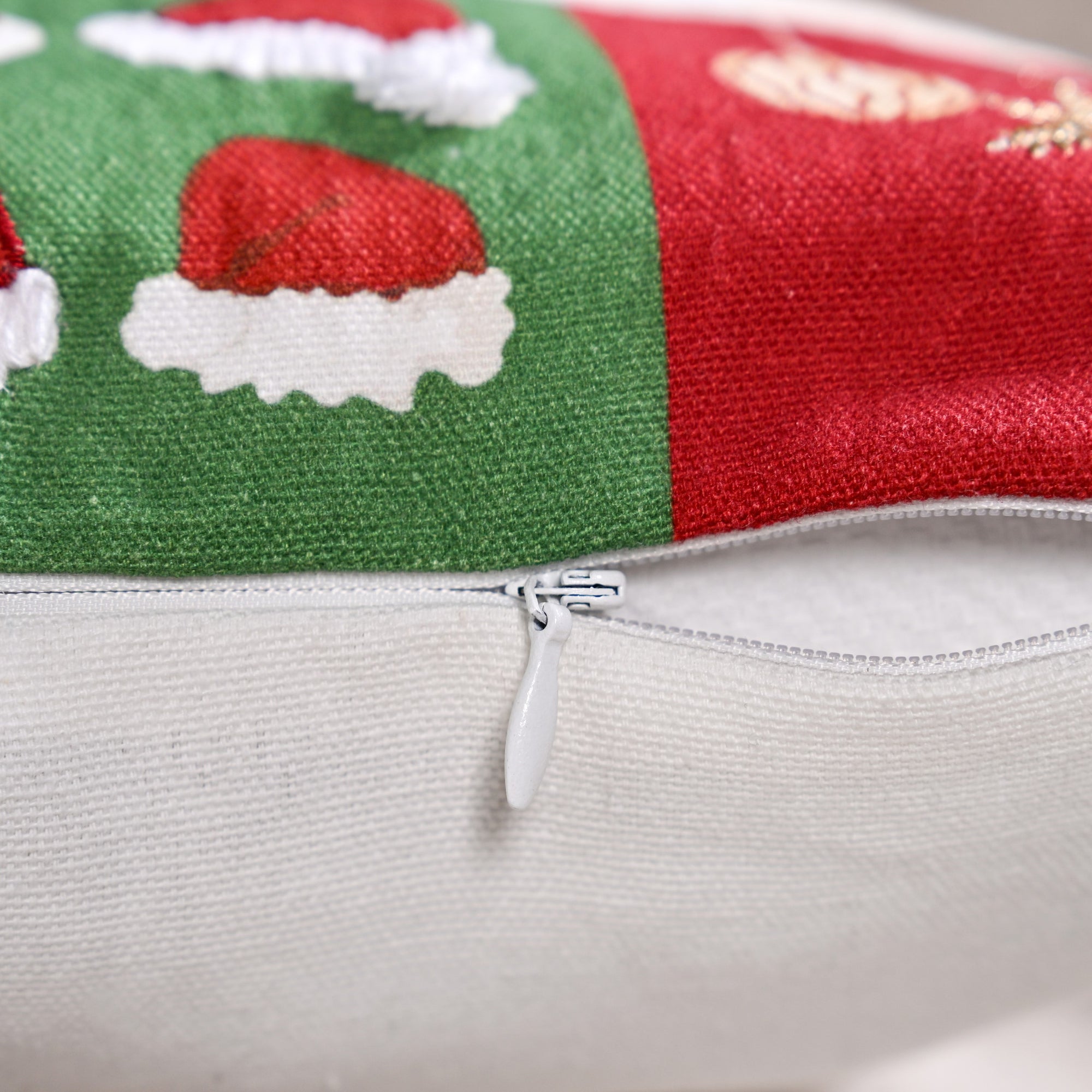 Design: Crafted from 100% cotton slub fabric, this square patchwork cushion cover showcases sixteen festive panels featuring classic Christmas icons such as a snowman, Christmas tree, gingerbread man, candy cane, wreath, toy train, bell, and bulbs. Designed in a cheerful mix of red, green, and gold with a textured woven finish, it brings a handcrafted and vibrant touch to traditional holiday décor.