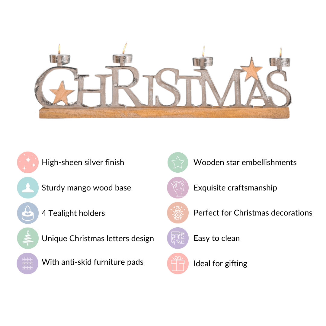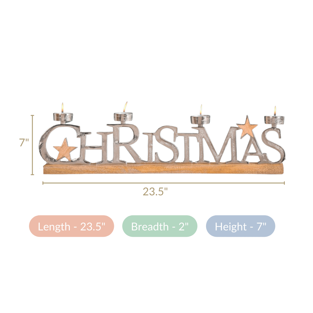This decor piece exudes a festive vibe through its unique design and thoughtful details. The sophisticated lettering of the word "Christmas," coupled with wooden star embellishments on selected letters, instantly sets a holiday mood. The four tea light holders atop certain letters further enhance the ambiance by offering the perfect spots for gentle illumination, adding warmth and cheer to your living space during the winter holiday season.