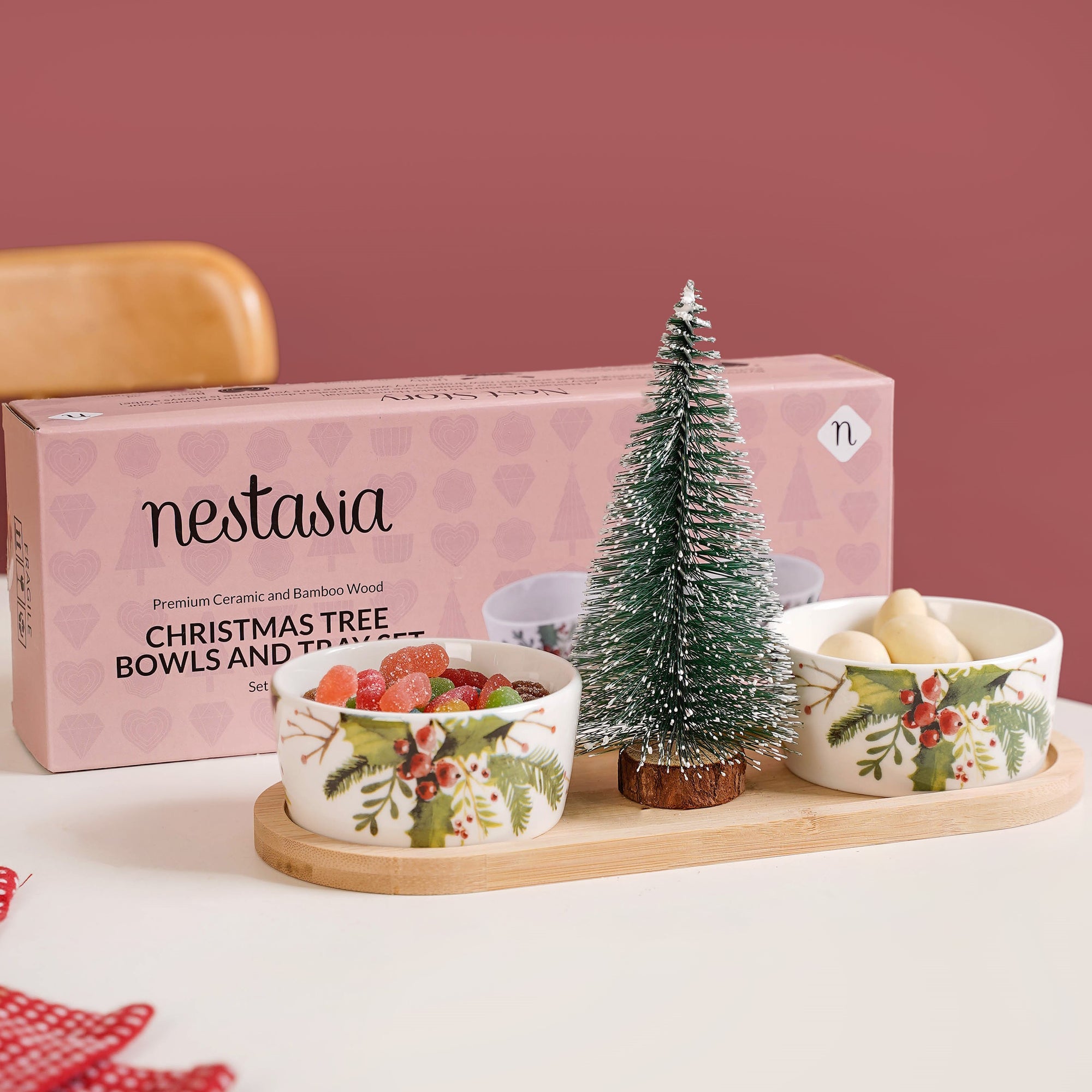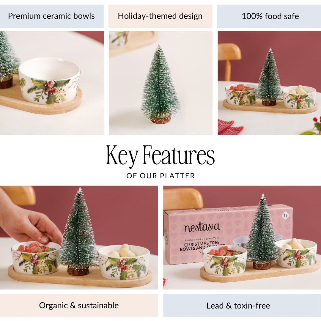 Design: This delightful set features two holly berry ceramic bowls resting on a smooth, rectangular bamboo tray. A miniature bristle bottle brush Christmas tree with a rustic log base nestles between the bowls, creating a charming centerpiece. The bowls are removable for easy cleaning, and the tray is reusable year-round. White ceramic contrasts beautifully with natural bamboo, and the set is wrapped in clear plastic film for neat presentation and easy storage.