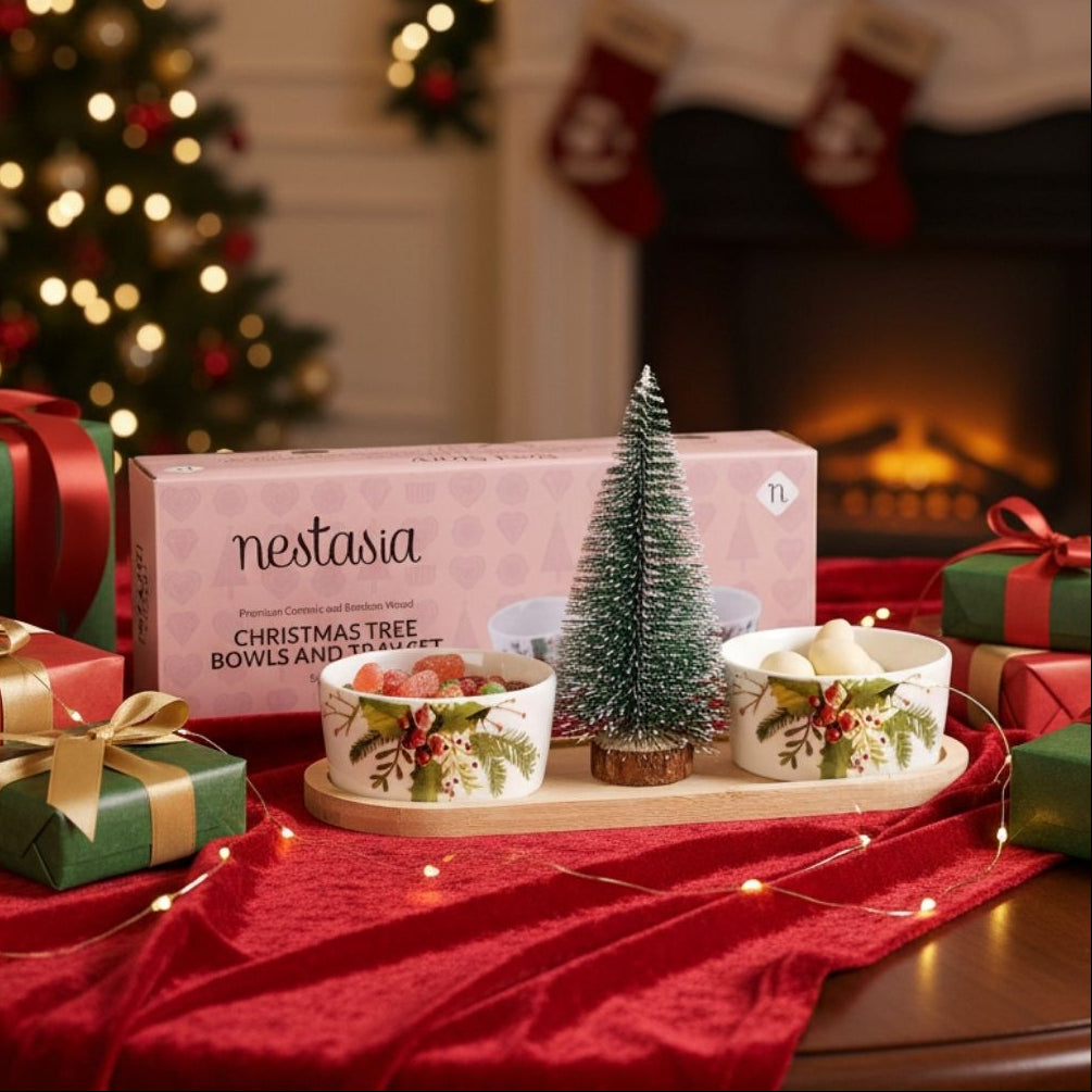 Add festive charm to your holiday table with this three-piece Christmas serving set, featuring holly berry ceramic bowls and a natural bamboo tray. Presented in a giftable box, it is perfect for hosts, teachers, or loved ones, offering seasonal cheer while making entertaining simple, stylish, and ready to give straight from the packaging without any extra wrapping effort.