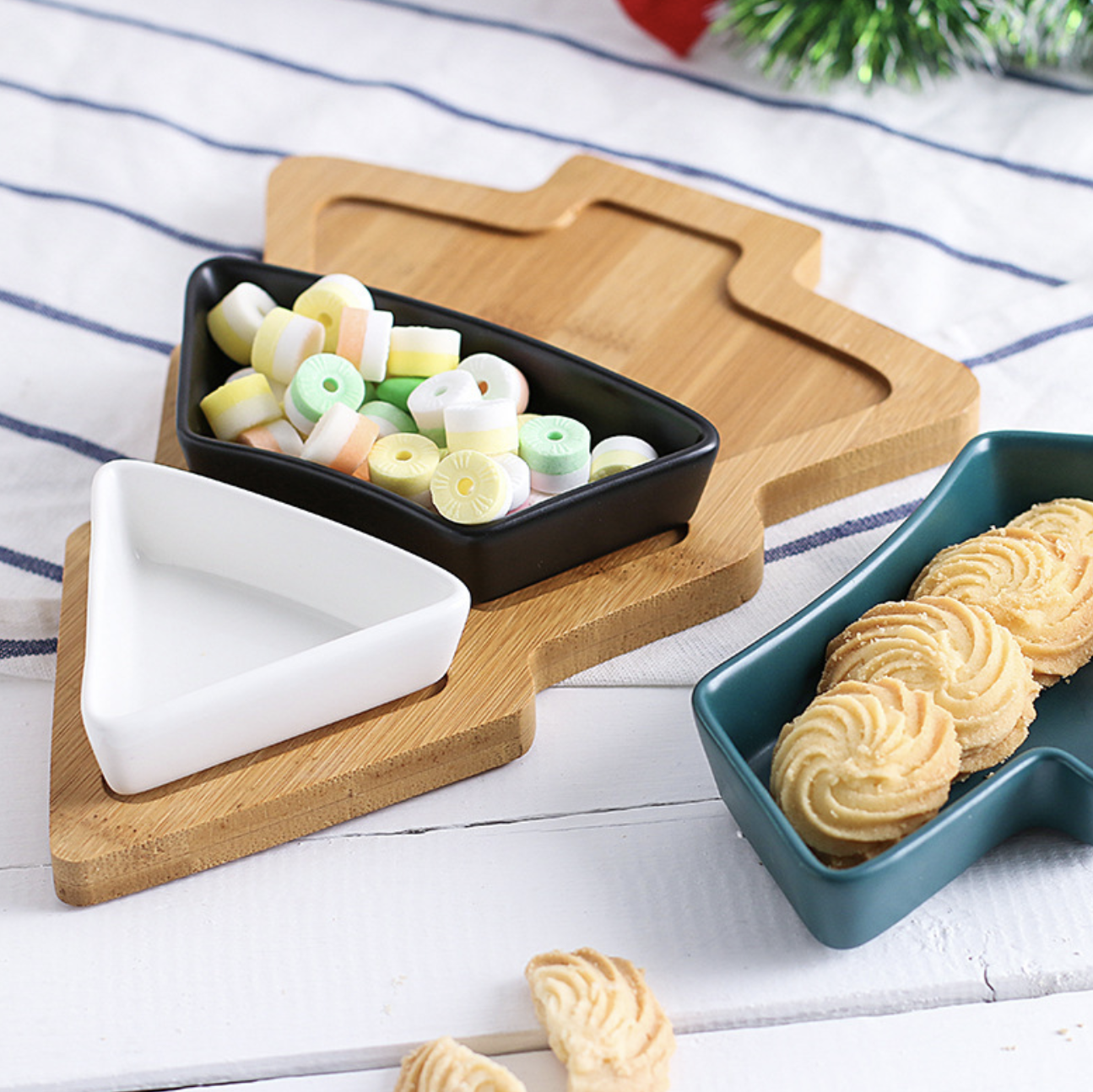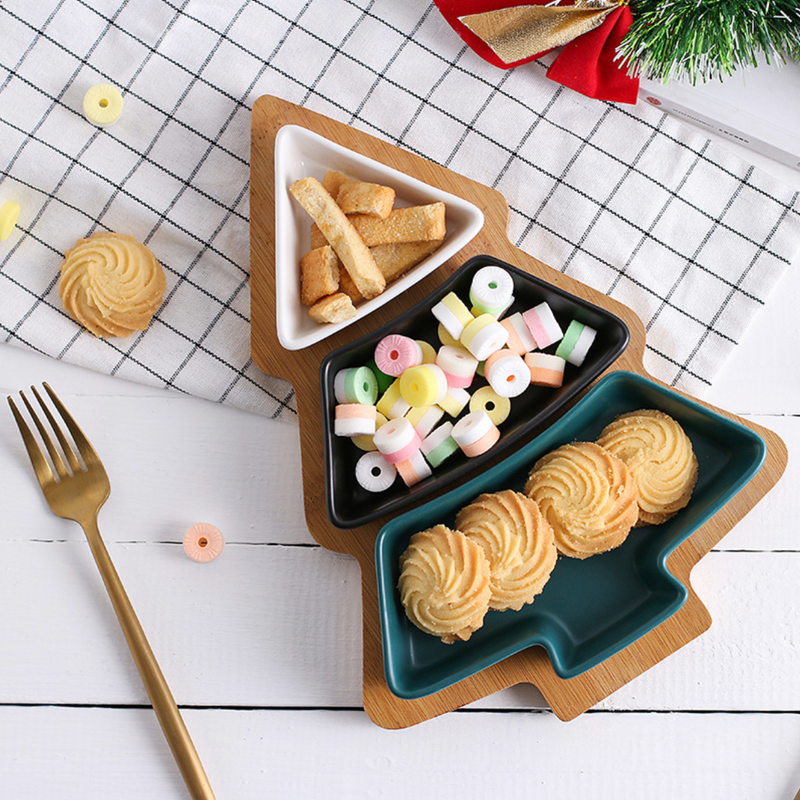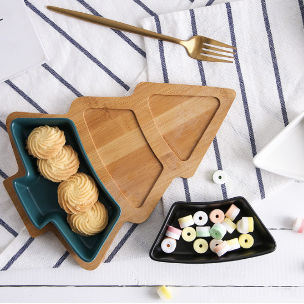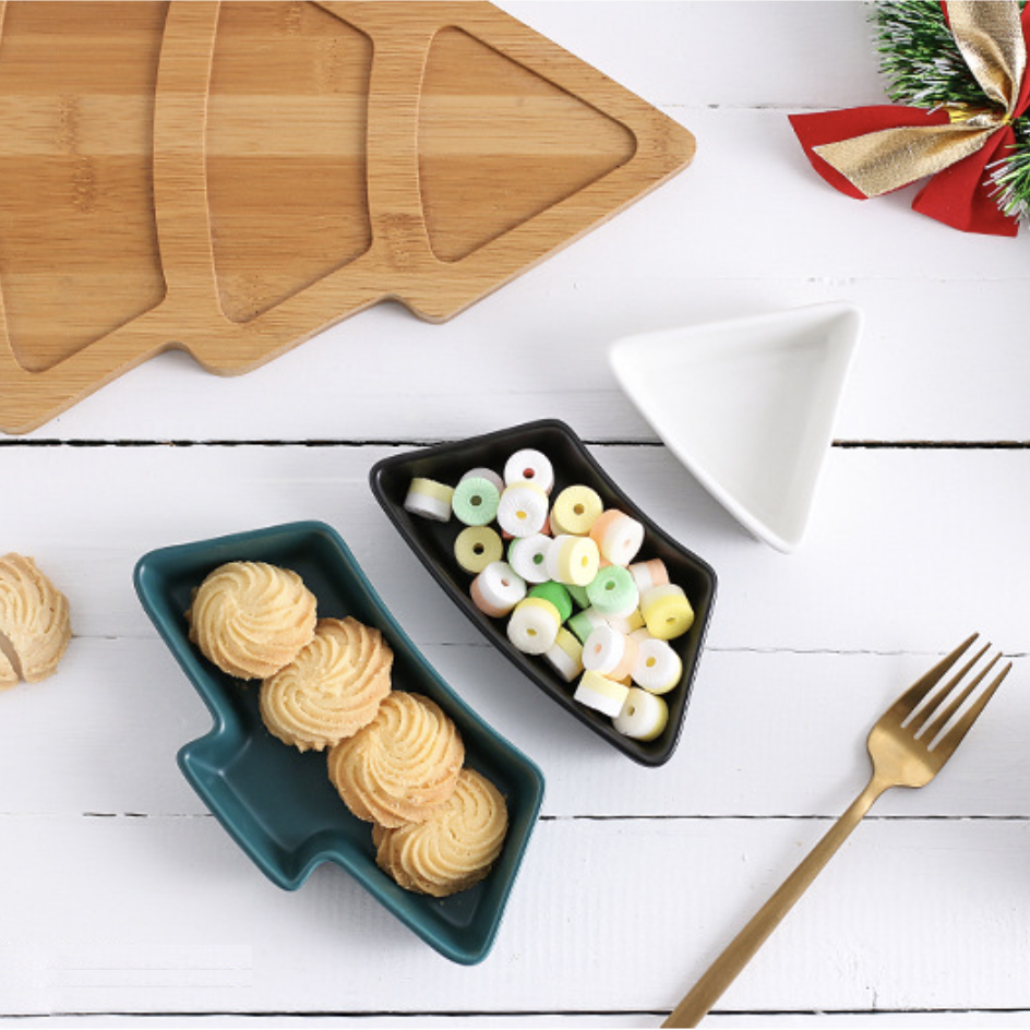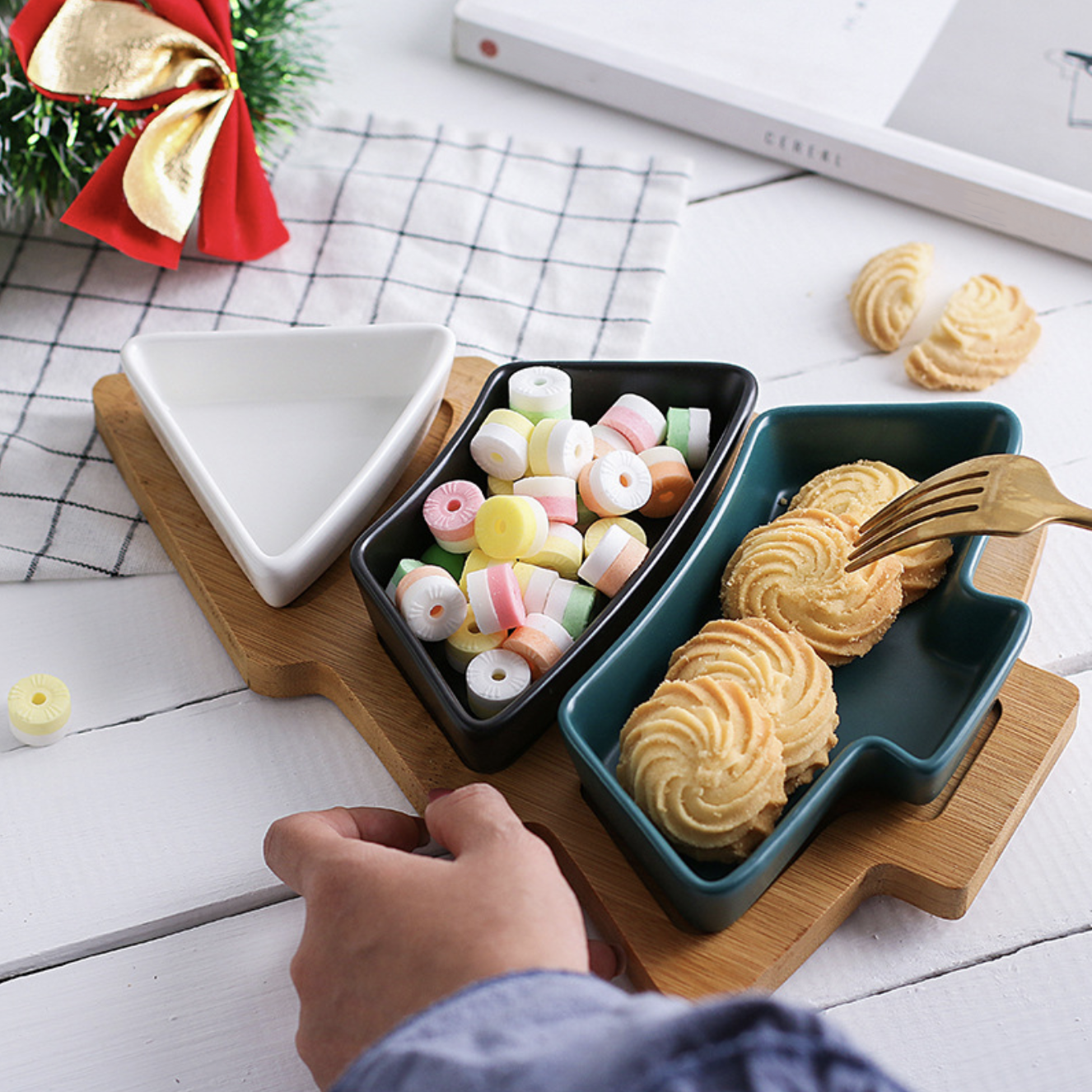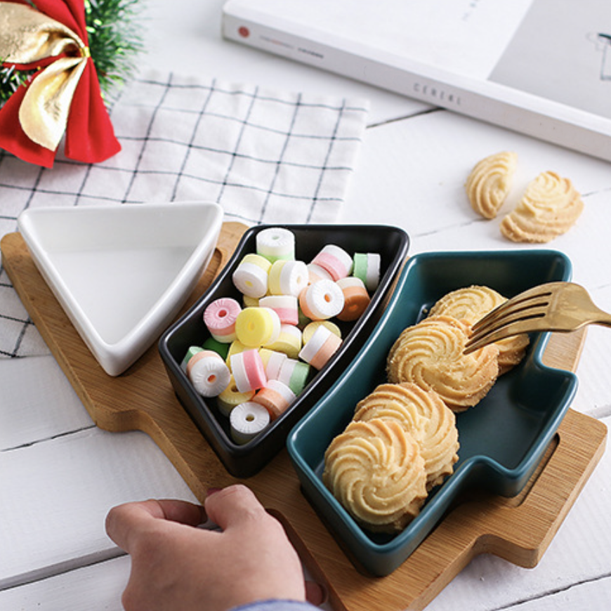 A nature-inspired wooden and ceramic platter that clearly justifies the quote ‘Freshly cut Christmas trees smelling of stars and snow and pine resin'. A sculpted pine tree platter consisting of three different colors and shape plates. The top being the snow is white in color, the middle is black and the base green accordingly. The platter is deeper on the inside and has a raised rim for the convenience of carrying food with ease while serving guests or family. The quirky plates placed over a textured wooden tray cut out in the shape of a Christmas tree add so much of class to the Christmas Celebration. Use the platter to serve cookies, marshmallows, candies, or some dry snacks with mayonnaise or other dips. Added on to any table it notches up the sophistication.