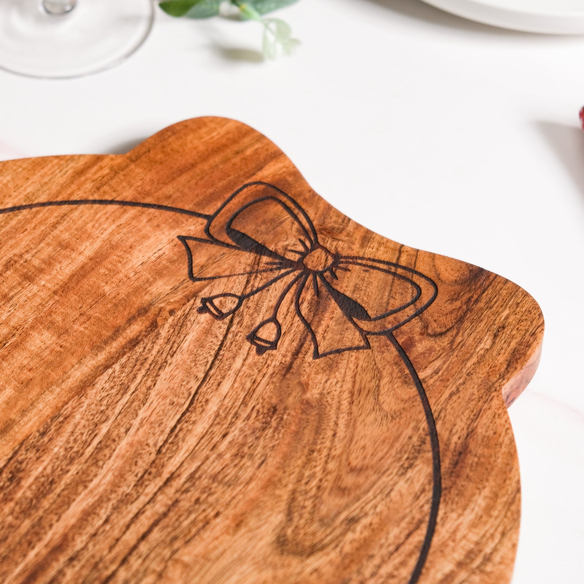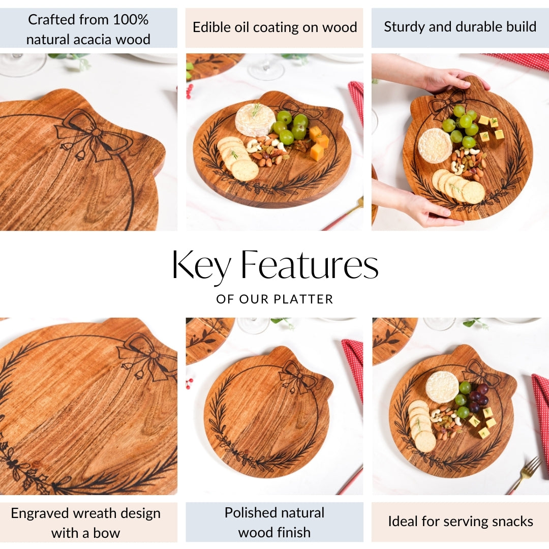 Design: Our stunning wooden platter is a masterpiece of design, crafted from rich acacia wood whose warm tones provide the perfect canvas for its festive art. A beautifully detailed Christmas wreath is delicately engraved across its surface, featuring intricate sprigs of evergreen and holly. The entire design is elegantly crowned with a classic, flowing bow, creating a look that is both rustic and sophisticated, making it the perfect centrepiece for your holiday table. Made from 100% acacia wood, use a damp cloth to wipe and let it air dry for long-lasting use.