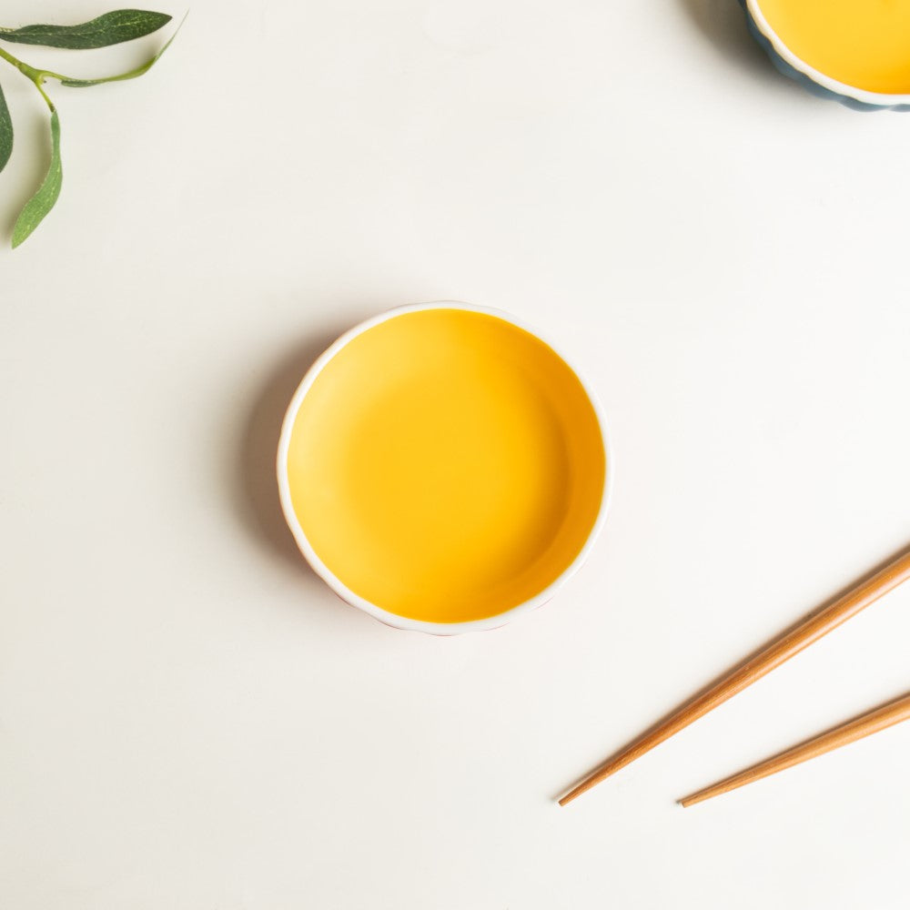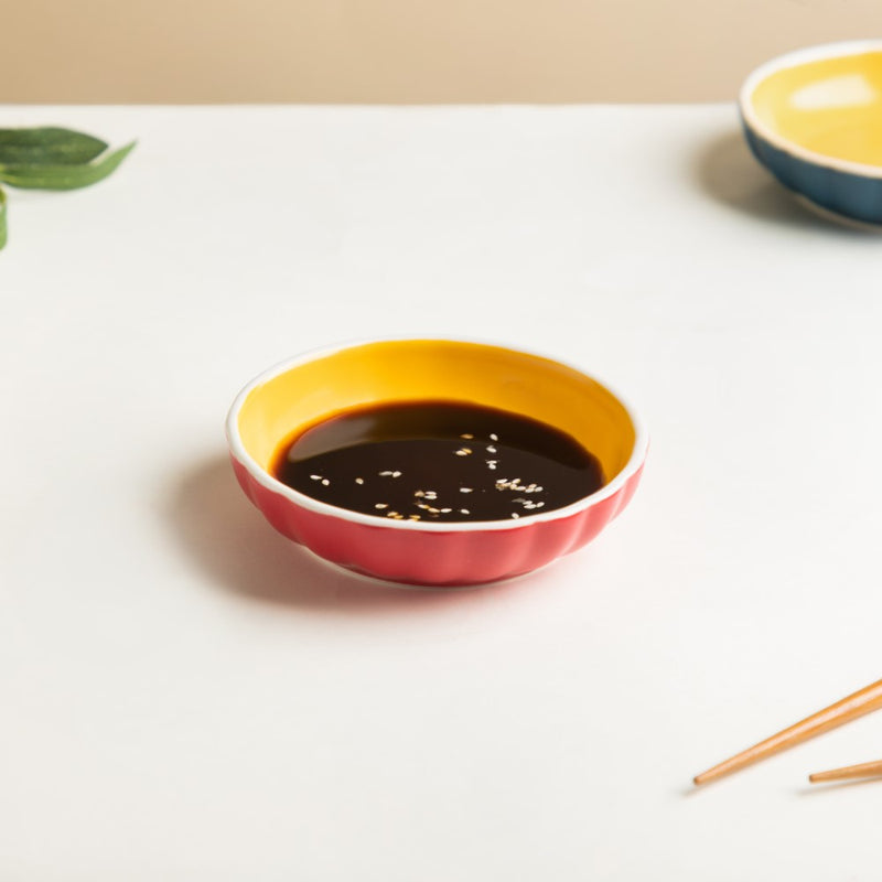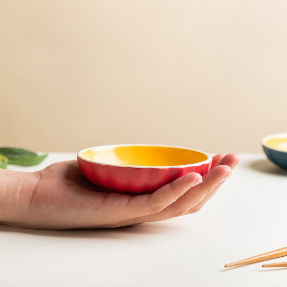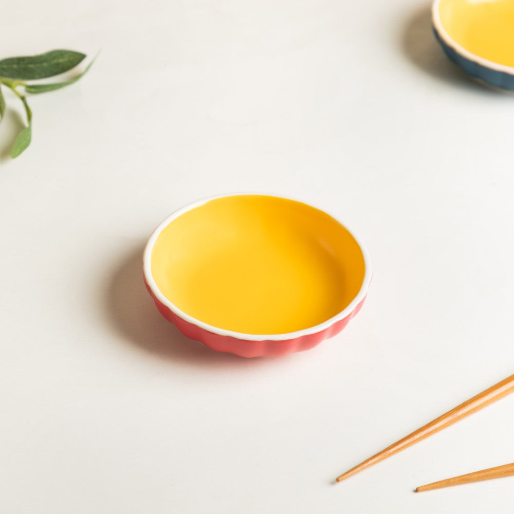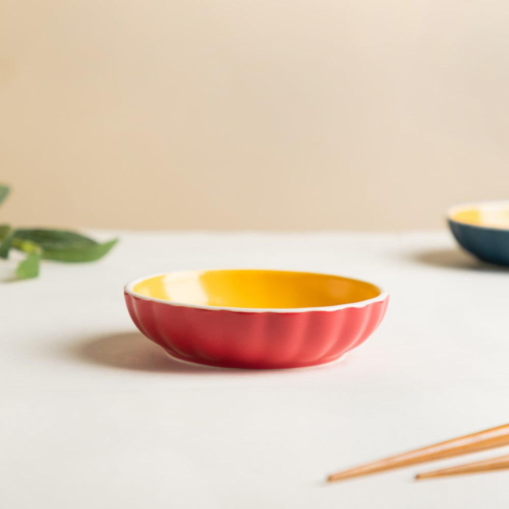 The dessert plate with a scalloped surface can be used as a dip bowl or a dessert plate. Serve a slice of pastry, brownie, cheesecake, or ice cream on the plate along with a dessert spoon. The small plate can also be used to serve after-meal refreshments or mouth fresheners to the guests at the dinner table. Featuring a red exterior and yellow interior, the small plate will add a pop of colour to the table spread.