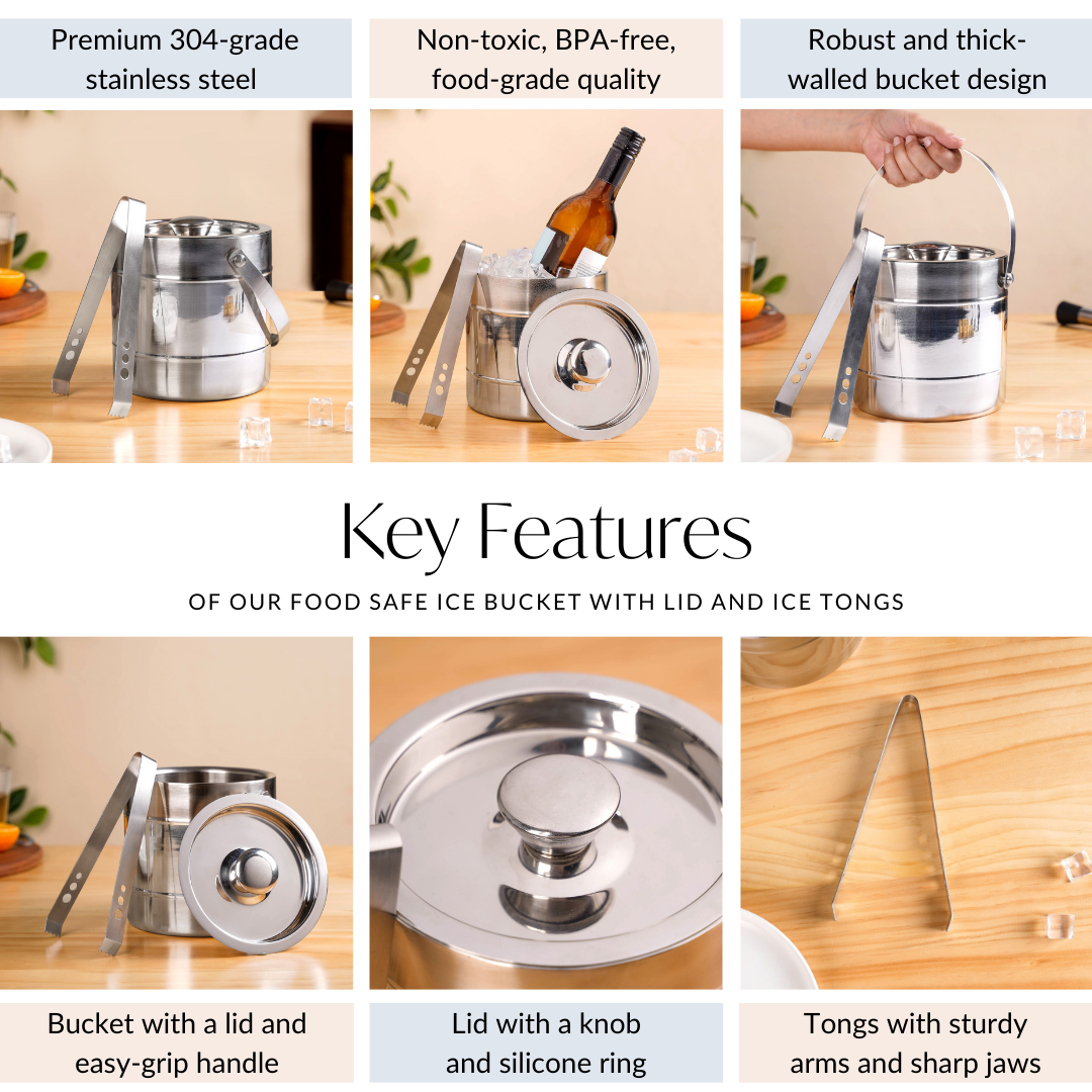 Benefits: Crafted from 304 stainless steel, this ice bucket set is non-toxic, BPA-free, and food-grade, making it safe for prolonged contact with ice. Its thick-walled, durable construction offers excellent insulation while being resistant to rust and tarnish, ensuring long-lasting use and maintaining its stylish appearance over time.