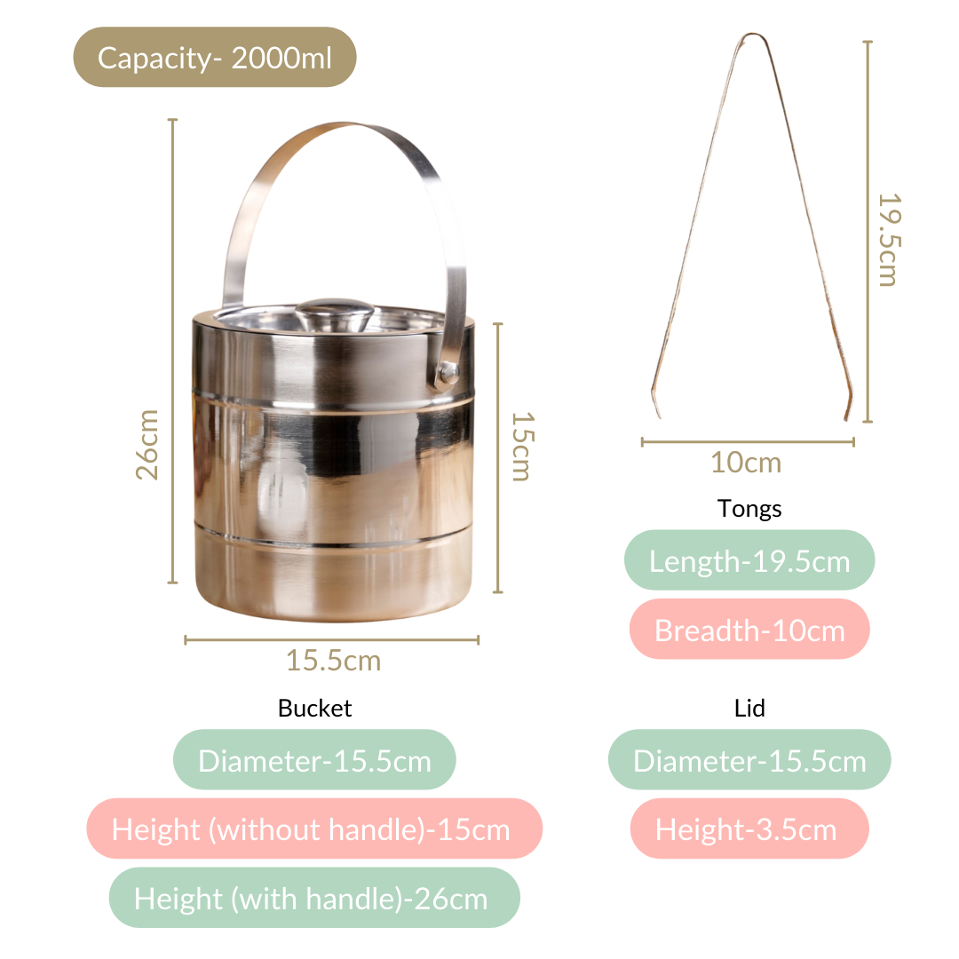 Bucket- 15.5cm D x 15cm H (without handle) x 26cm H (with handle), Capacity- 2000ml