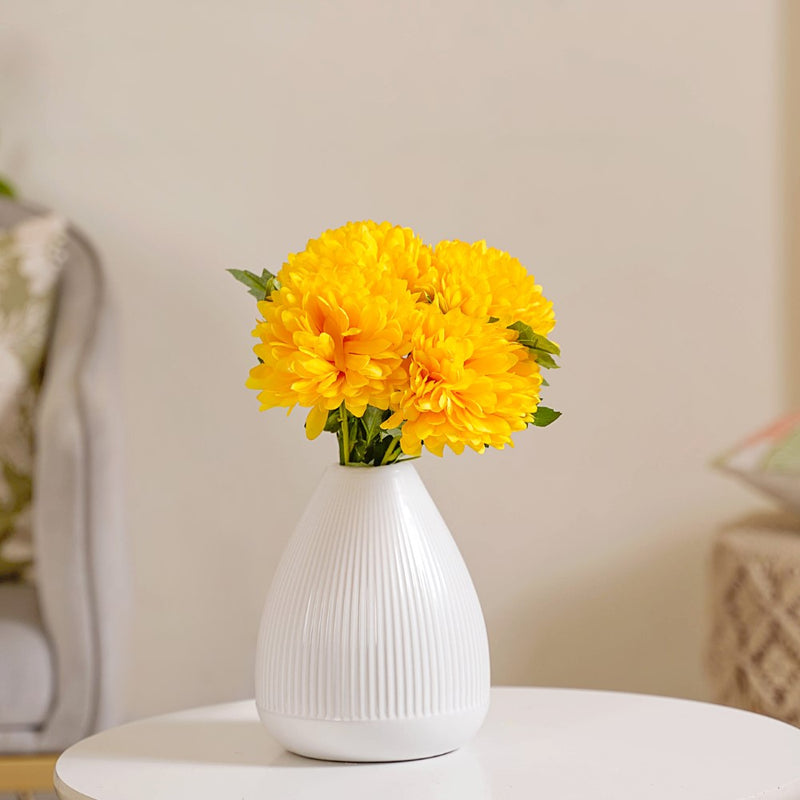 Chrysanthemum flowers in bright yellow colour come as a bunch of five flowers on a stem. The flowers also have leaves which give them the look of fresh flowers. Bright colours of the flowers add vibrance and brightness to the ambience of any house or workspace. Spraying the flowers with aromatic oils can make them smell natural and will add a dash of fragrance to them as well.Nestip: Large chrysanthemum flowers can be coupled with smaller ones to create a colourful bouquetSize: 50cm LMaterial: PU silkColour: Yellow, greenProducts Included: 5 chrysanthemum flowers on a stickStyle: GHF53