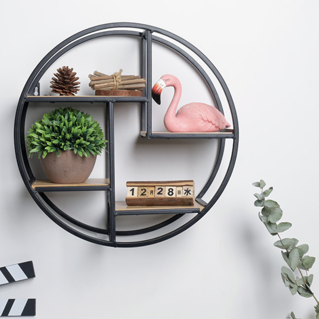 Hanging shelf in a pleasing round shape - with four small racks to place items on. The metal shelf with wooden racks is ideal for saving space while being a decor saviour at the same time. The perfect circular shape with the strategically situated racks creates for a soothing sight when hung on any wall - of a bedroom or a living room. From photo frames and mementos to books, clocks and showpieces - anything can be placed on the sturdy wall shelf.