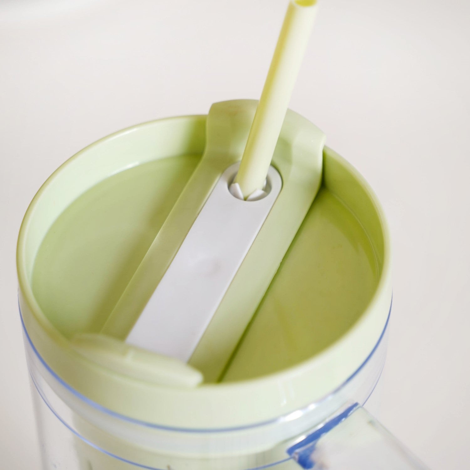 Design: Crafted with an easy-grip ergonomic handle, this gym water bottle is perfect for carrying on the go. The large bottle's smooth, transparent body lets you monitor your hydration levels while adding a modern aesthetic to your routine. The mint green accents on the straw, lid, and infuser bring a refreshing touch to the design, making it visually appealing as well as functional. A screw-on infuser attaches seamlessly to the lid’s base, letting you add fruits or herbs to elevate your water with natural flavours.