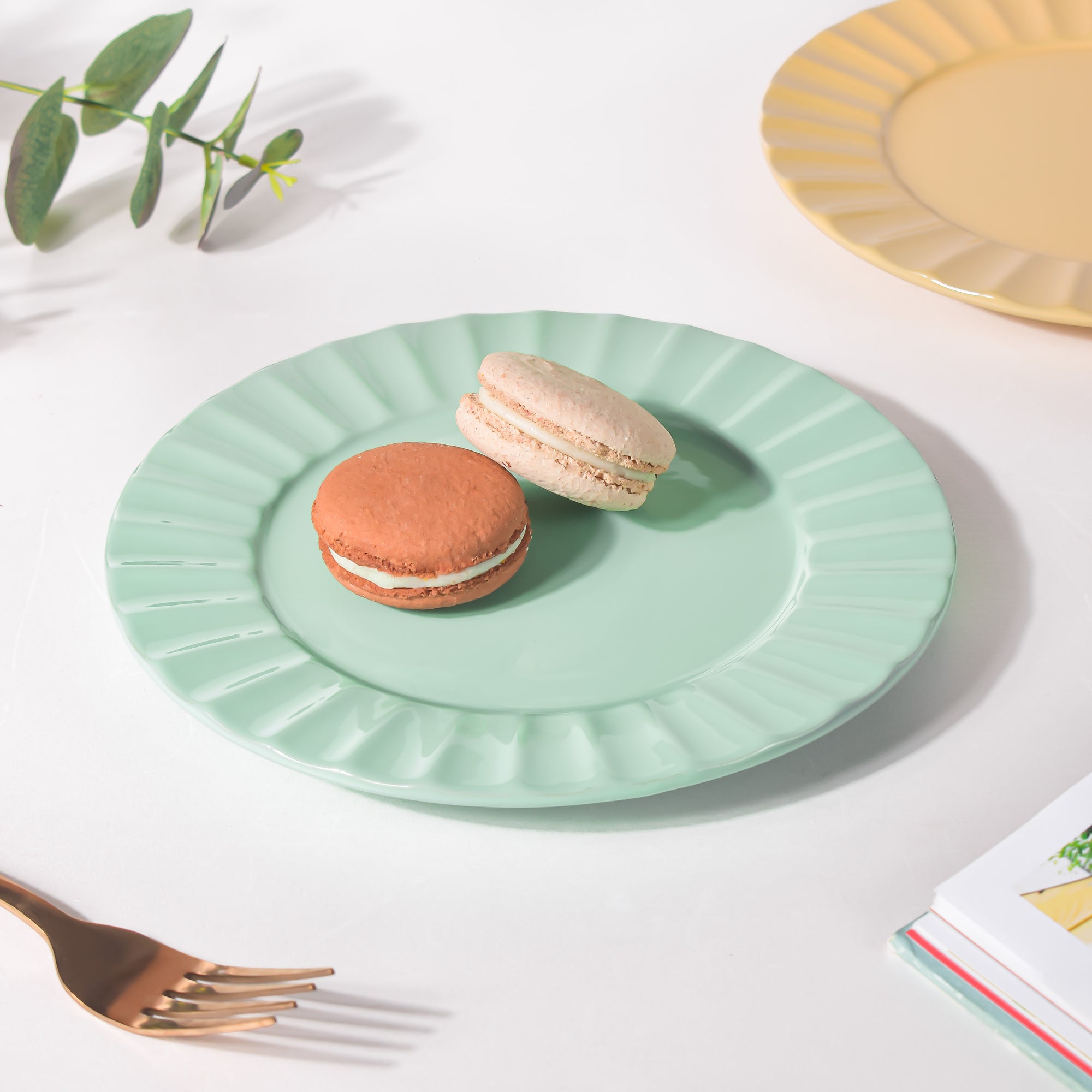 Claramay exhibits the fondness and tenderness that are poured into the recipe and have made the food even tastier. The ribbed ceramic appetizer plate is ideal for enhancing the meal experience. The ceramic plate is painted in a pastel shade of mint green and is marked by a ribbed pattern near the rim. One can offer fritters, fries, and buns on the ceramic 8-inch plate. For breakfast, lunch, or a high tea gathering with friends and family, Claramay patterned mint green ceramic plates is ideal. Pizza slices, sandwiches, noodles, cupcakes, muffins, waffles, and a range of other items can also be housed on the ribbed snack plate. Nestip: Pair the mint green snack plate with other snack plates from Claramay collection. Size: 19cm D x 2cm H Colour: Mint Green Material: Ceramic Products included: 1 appetizer plate Style: LLC71
