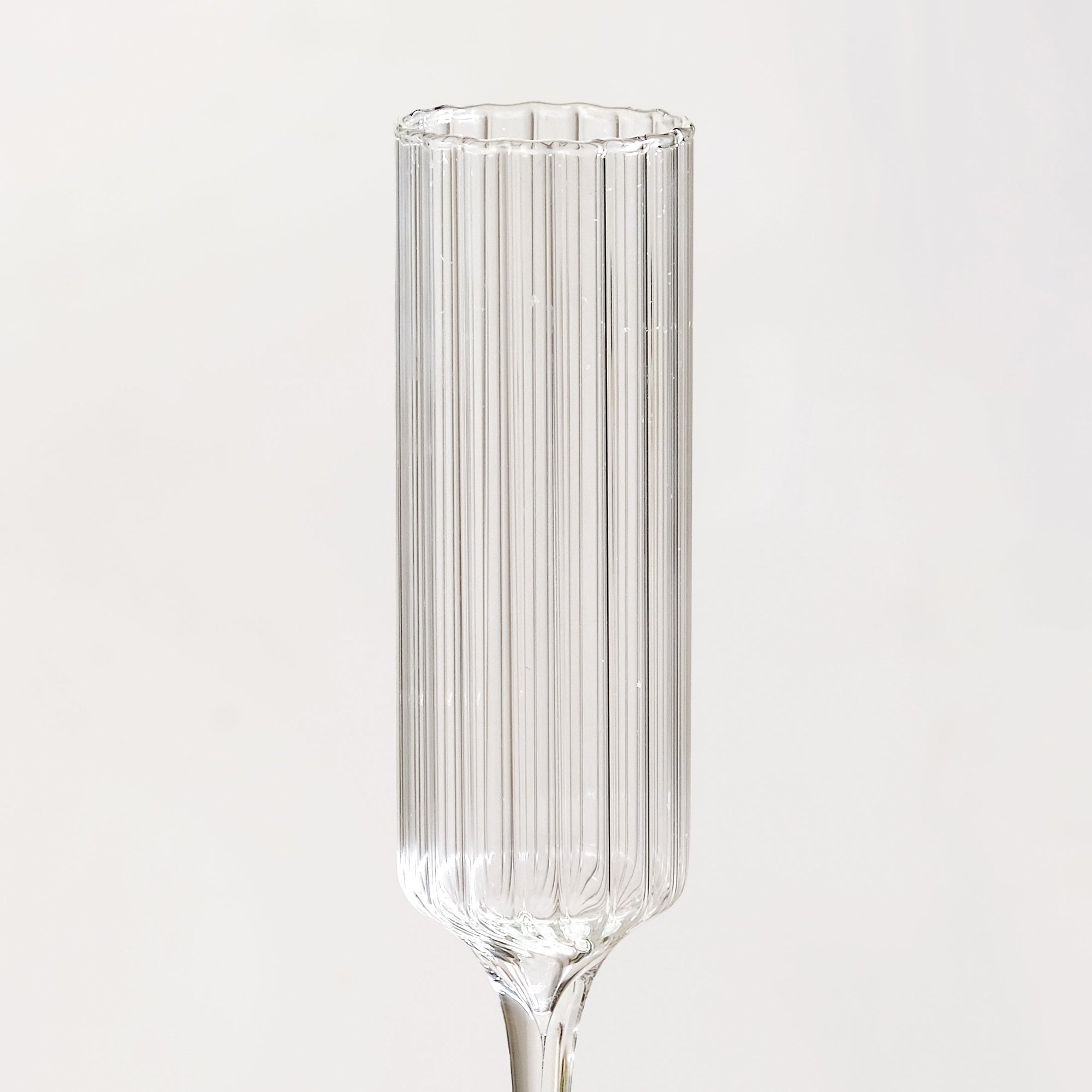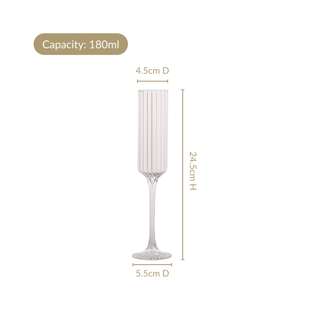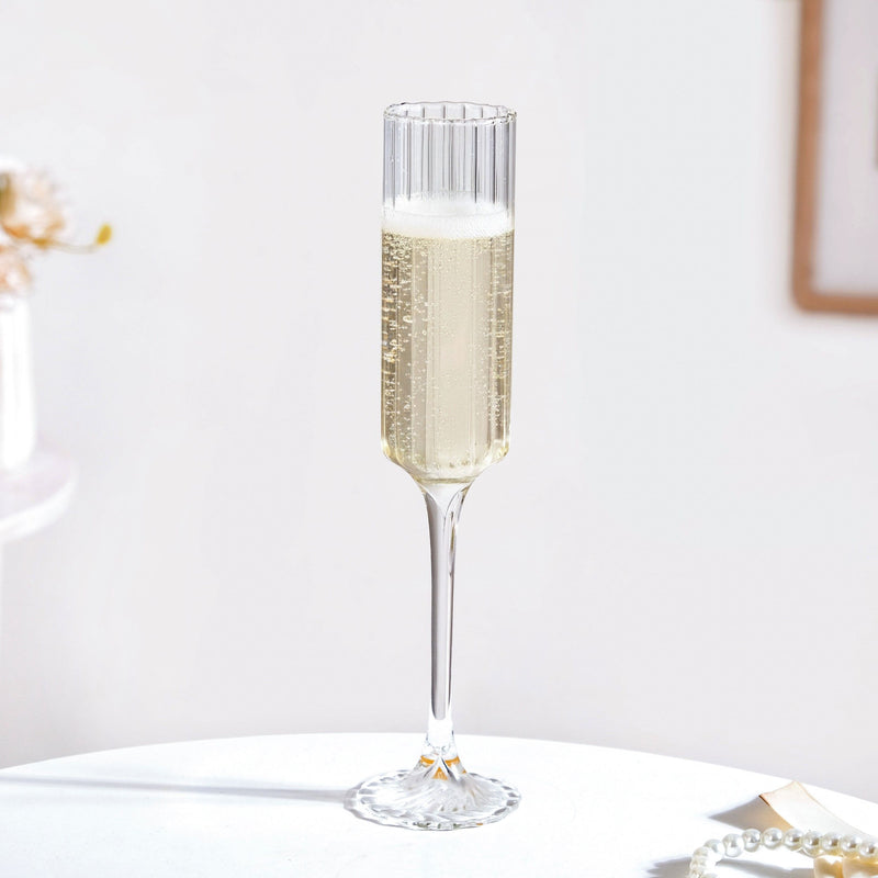 Design: This elegant champagne glass features a stunning elongated bowl with a sophisticated inner ribbed surface, catching the light beautifully. The clear glass design and slender stem add a luxurious, contemporary charm to any celebration. Its unique texture is perfect for formal events or casual hosting, bringing a fresh, warm aesthetic to your bar glass collection.