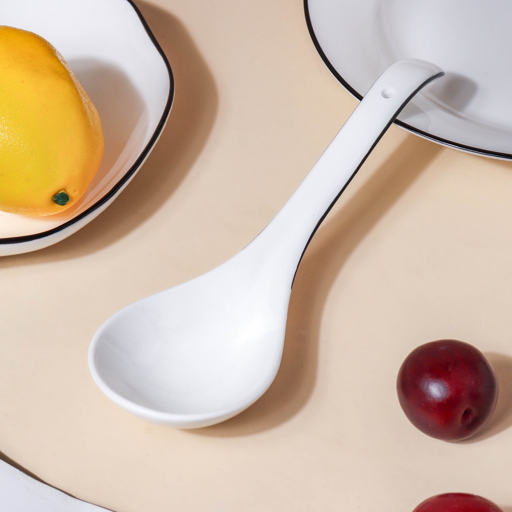 Amp up the fine dining set-up with the Classic White 36 piece dinner set. Perfect for a fine-dining dinner setup, the pristine white crockery set comes with one serving bowl, one serving spoon, eight soup bowls, eight soup spoons, one tray, one serving plate, four side plates, four pasta plates, and eight dip bowls. The premium quality ceramic ware dinner set lends a delightful dining experience to the guests. The monochrome dinner would be great to give as a wedding gift to a loved one.