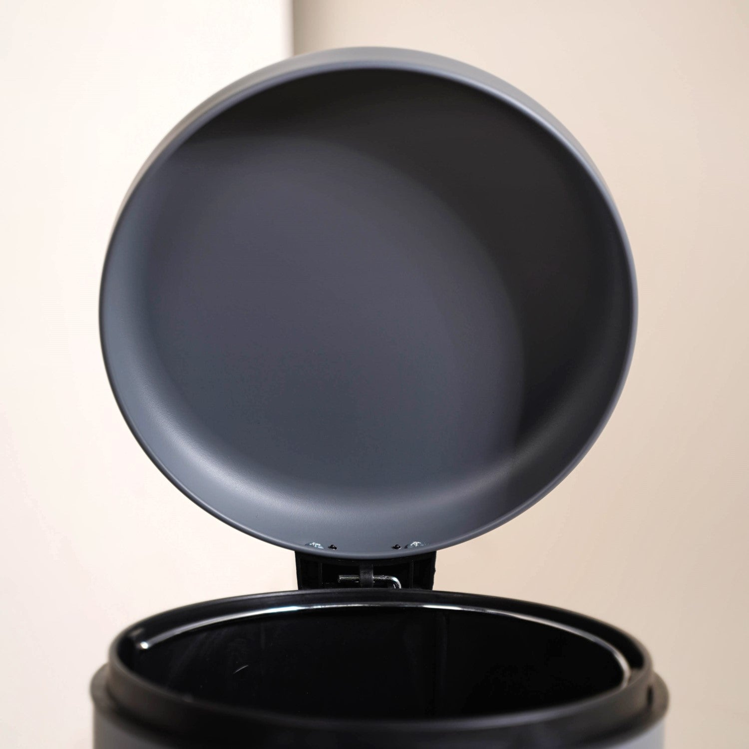 Design: This sleek and modern trash can features a durable metal build with a sophisticated matte grey finish. Its contemporary, rounded, cylindrical shape is space-efficient, making it an ideal dustbin for the home, fitting neatly into various settings like the kitchen, bathroom, or office. The design incorporates a robust cantilever foot pedal mechanism for hands-free operation and an ergonomic back handle for effortless carrying. Inside, a removable black PVC inner bucket, complete with its steel carrying handle. The lid features a force-resistant soft-close mechanism, ensuring quiet and gentle closure. The exterior boasts a fingerprint-resistant coating to maintain its pristine appearance.