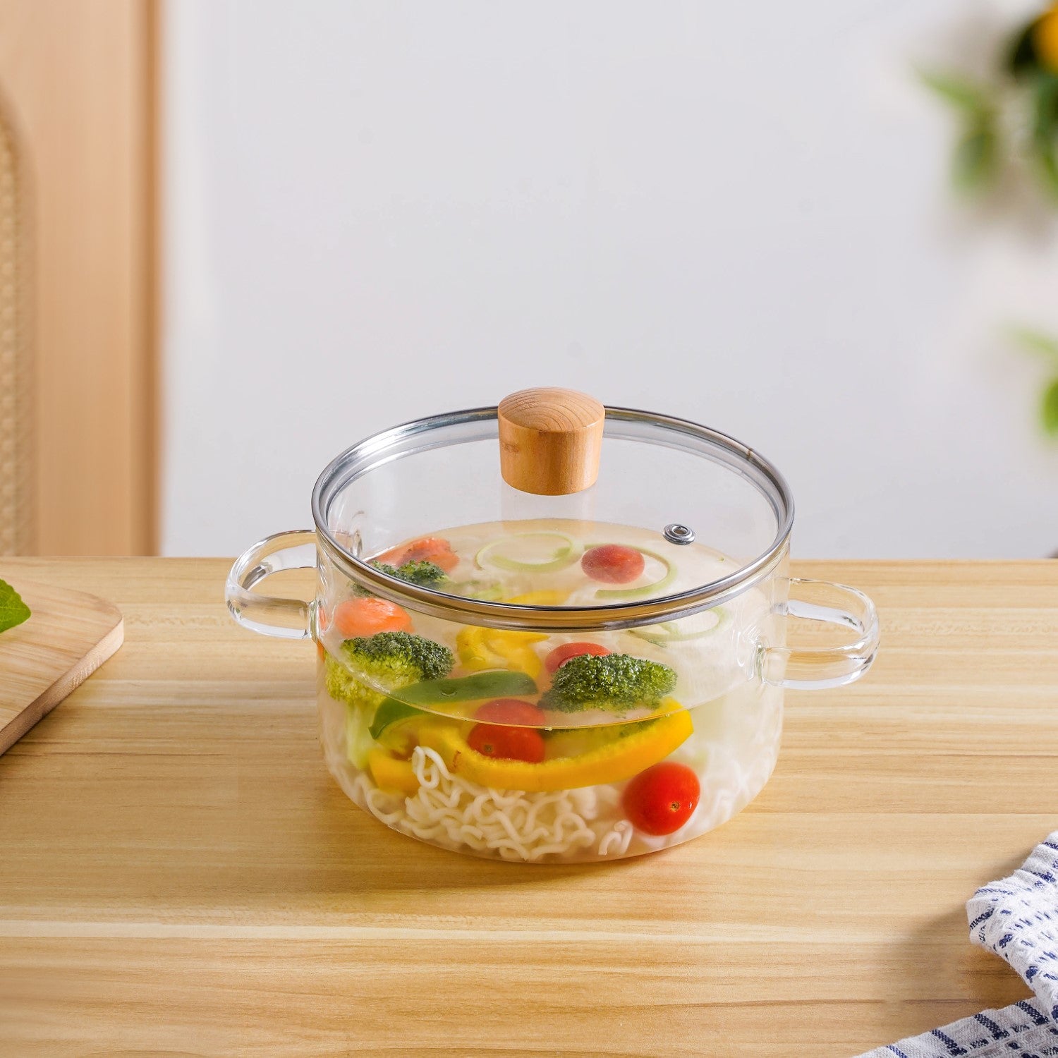 Design: Get ready to fall in love with cooking once again with this glass cooking pot. Its transparent body lets you watch your food bubble and boil to perfection. The smooth, rounded body of the pot lends modern charm, while the clear lid, adorned with a minimal wooden knob, adds a natural touch. The thick yet sleek side handles complement the pot, giving it a polished look.