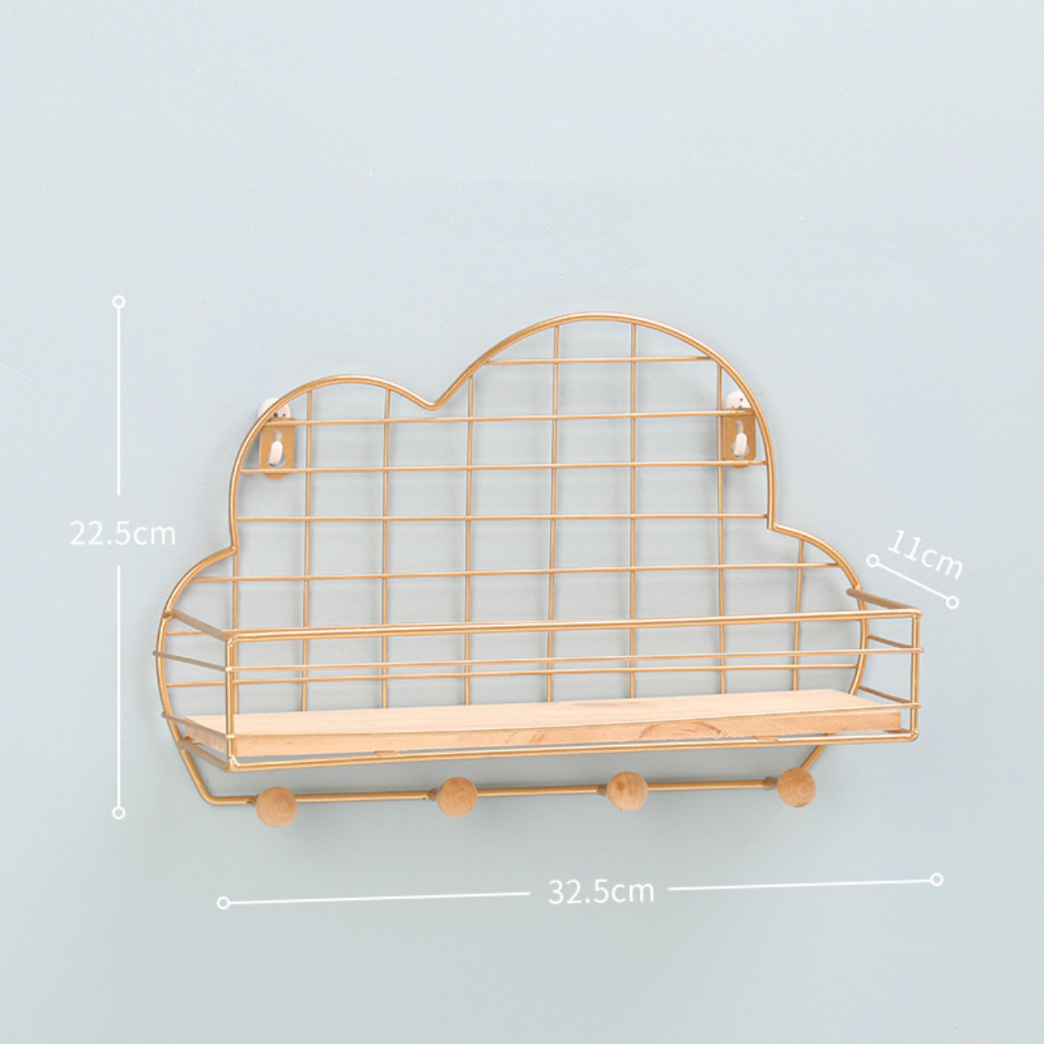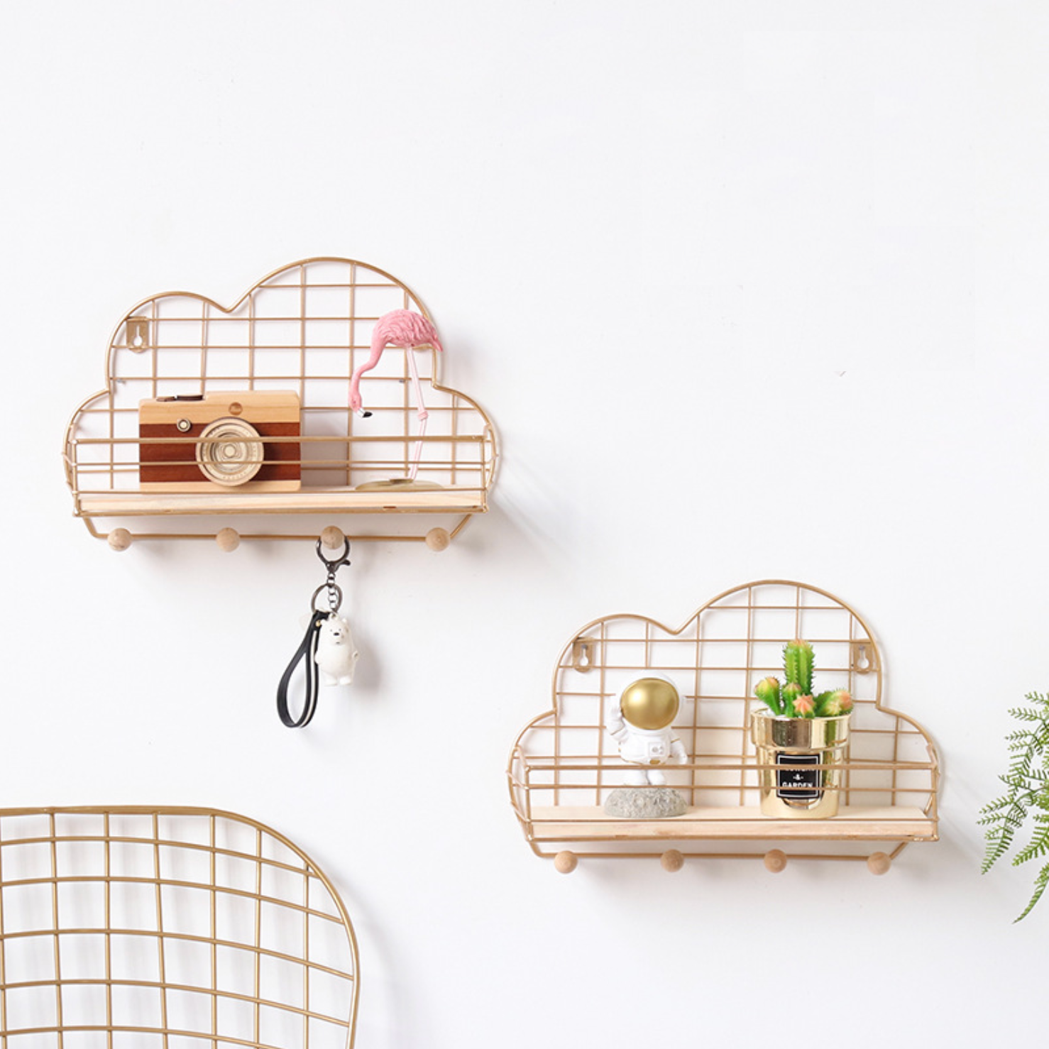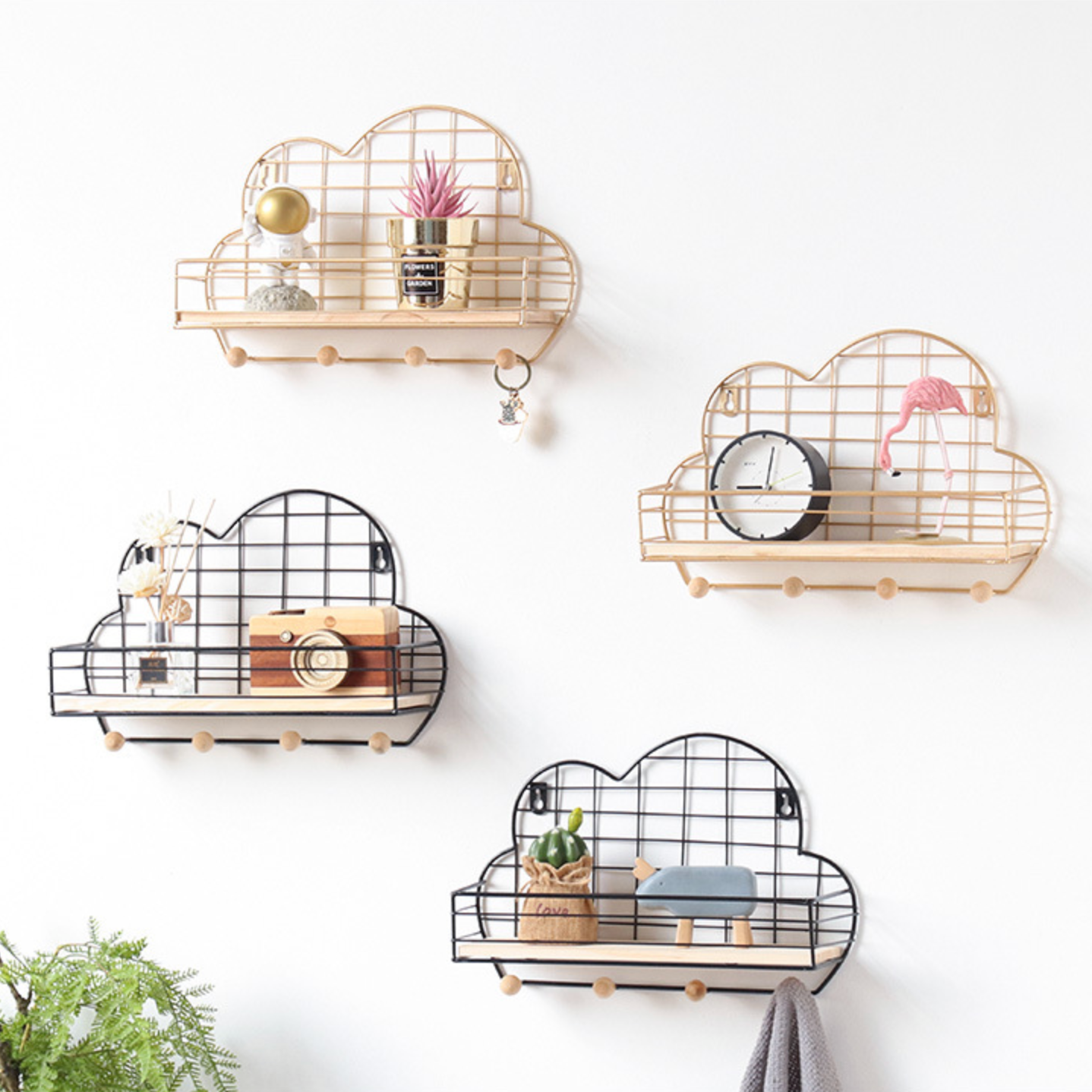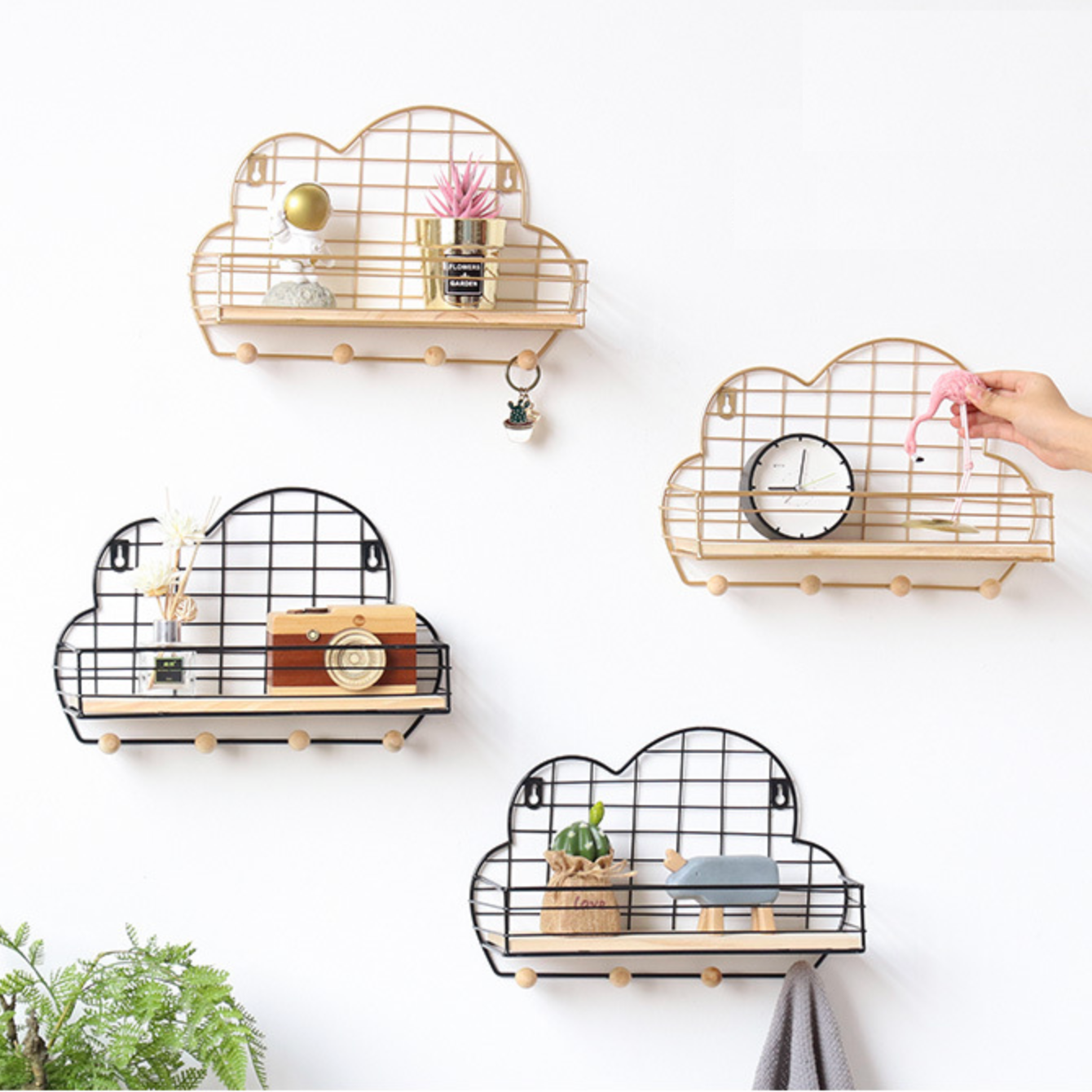 The gold cloud shape wall shelf is a unique addition to plain walls in any home. It is made of metal wire and it has a wooden shelf that complements the gold metal texture. It can placed in various rooms with display pieces, plants and more.