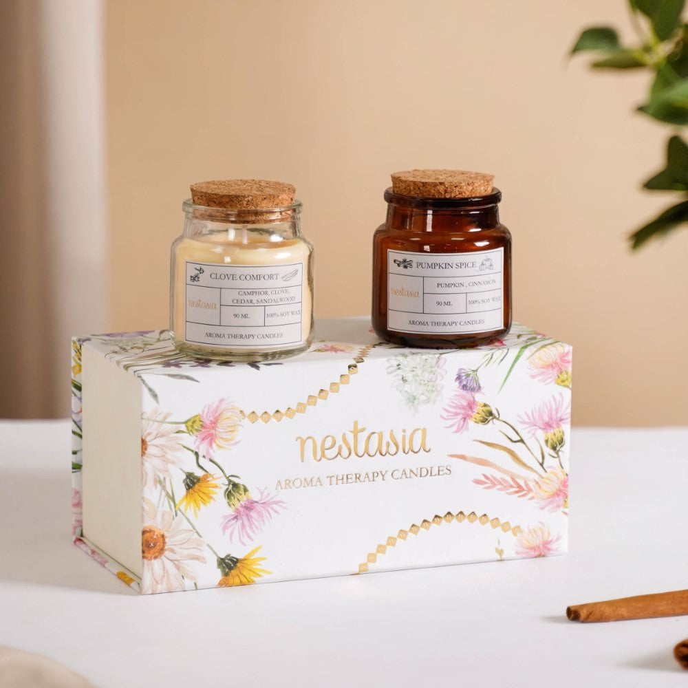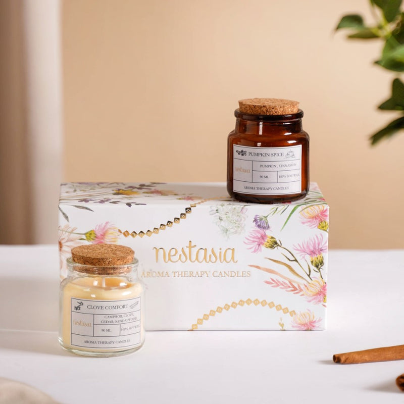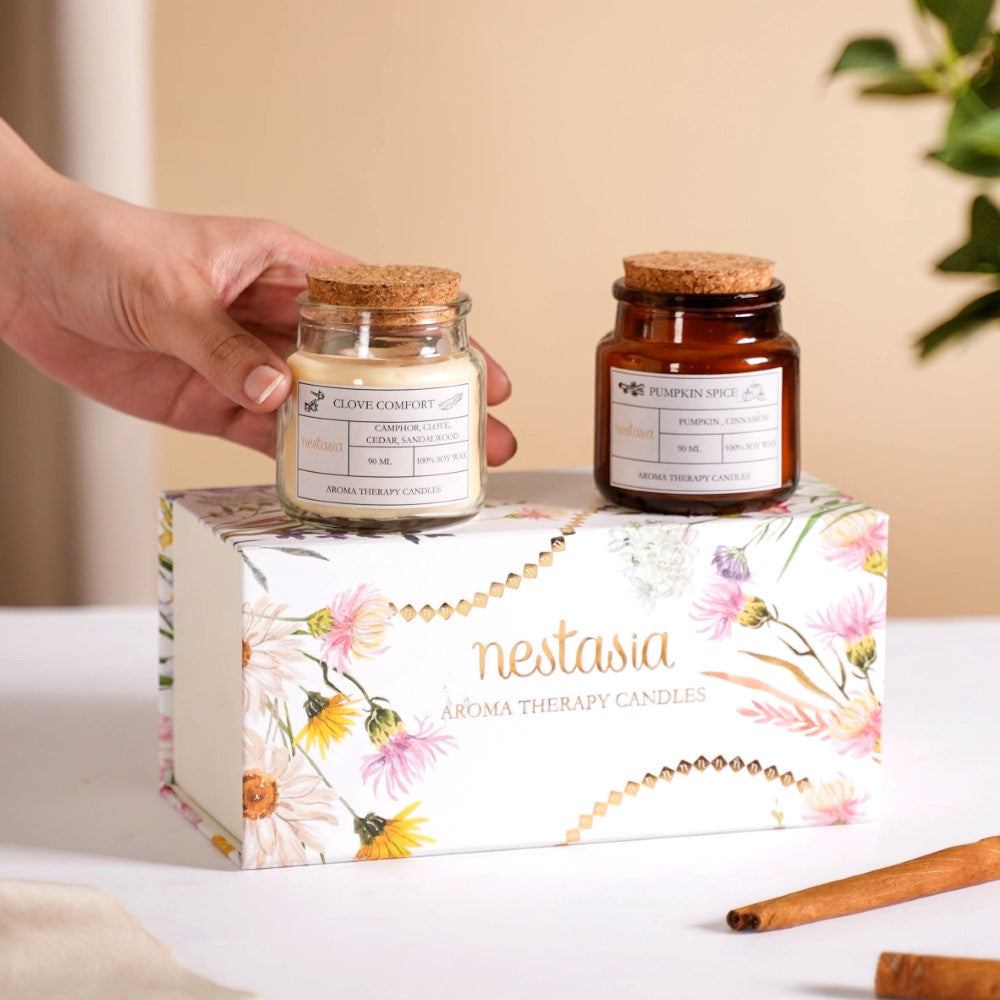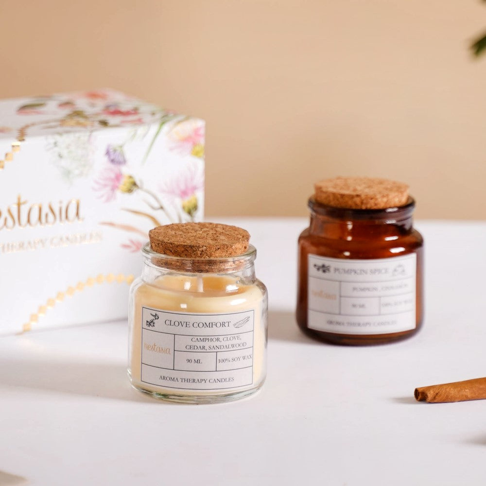 The set of 2 distinctive scented candles has been each crafted to transport you to a world of captivating aromas. The Clove Scented Candle boasts a delightful blend of camphor, clove, cedar, and sandalwood, creating a warm and inviting ambience. Meanwhile, our Pumpkin Spice Soy Wax Candle offers the perfect balance of cinnamon and pumpkin, evoking cosy autumn memories. Encased in elegant glass jars with cork lids, these soy wax candles provide a clean and eco-friendly burn.