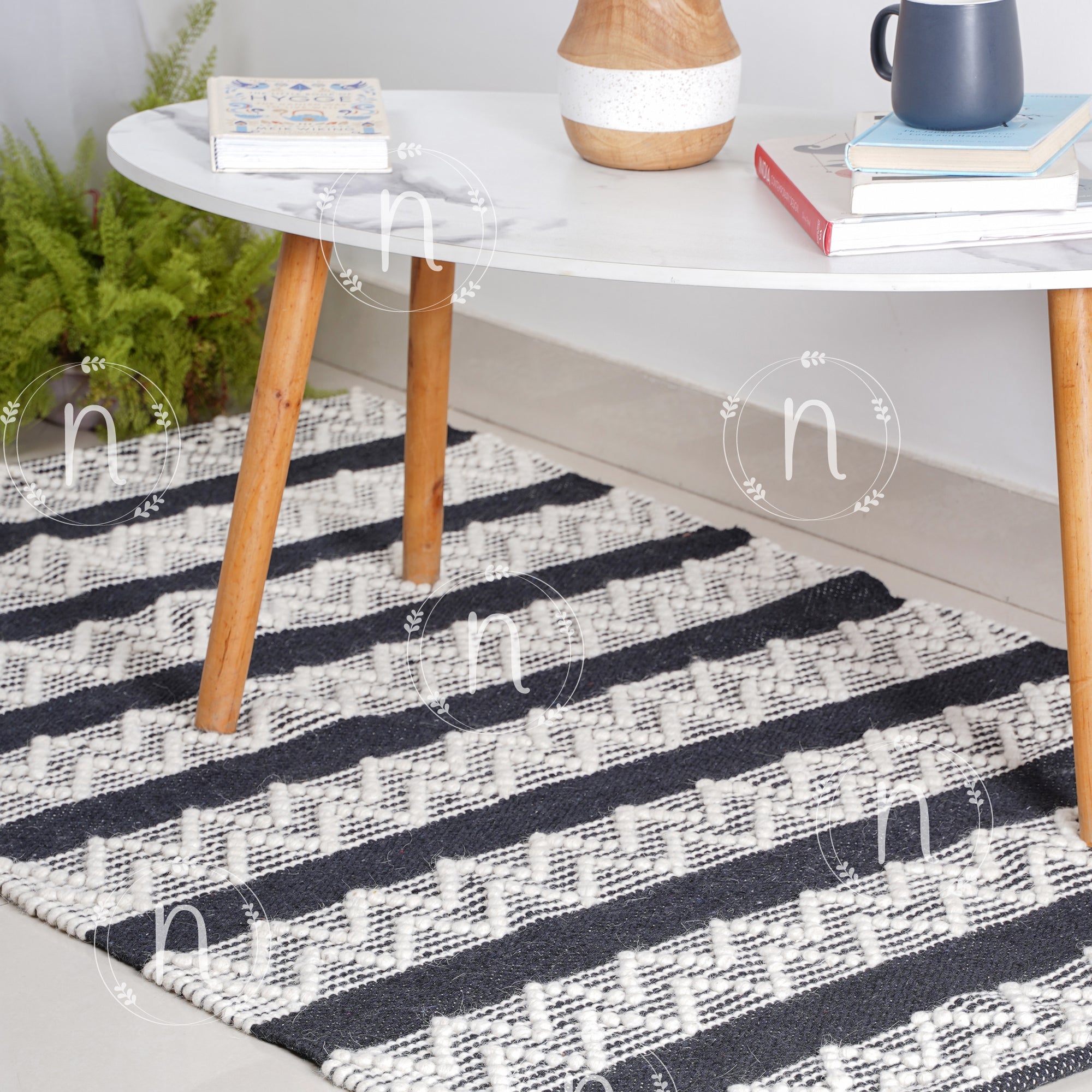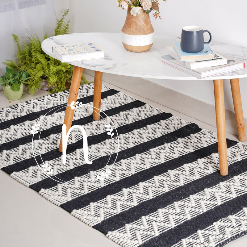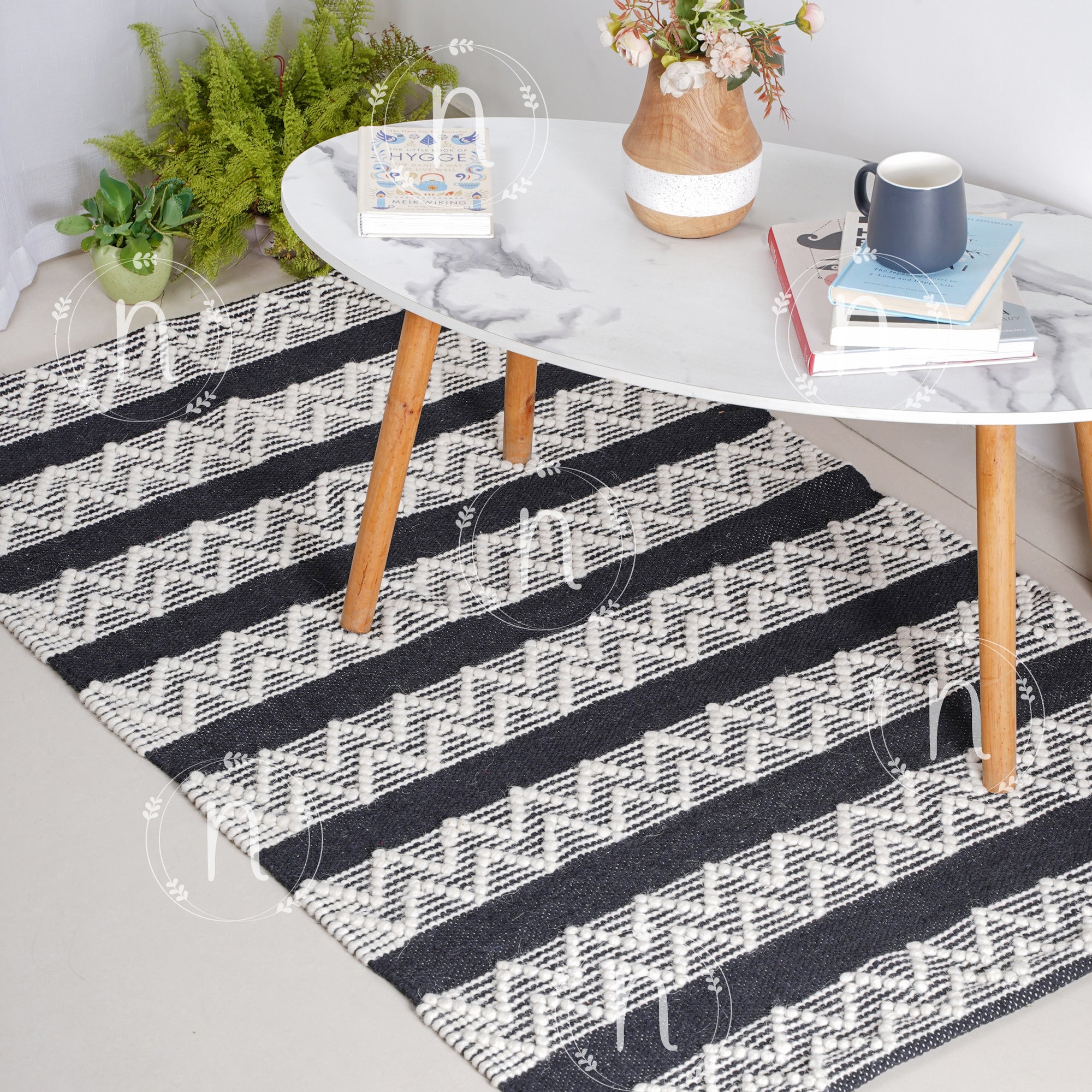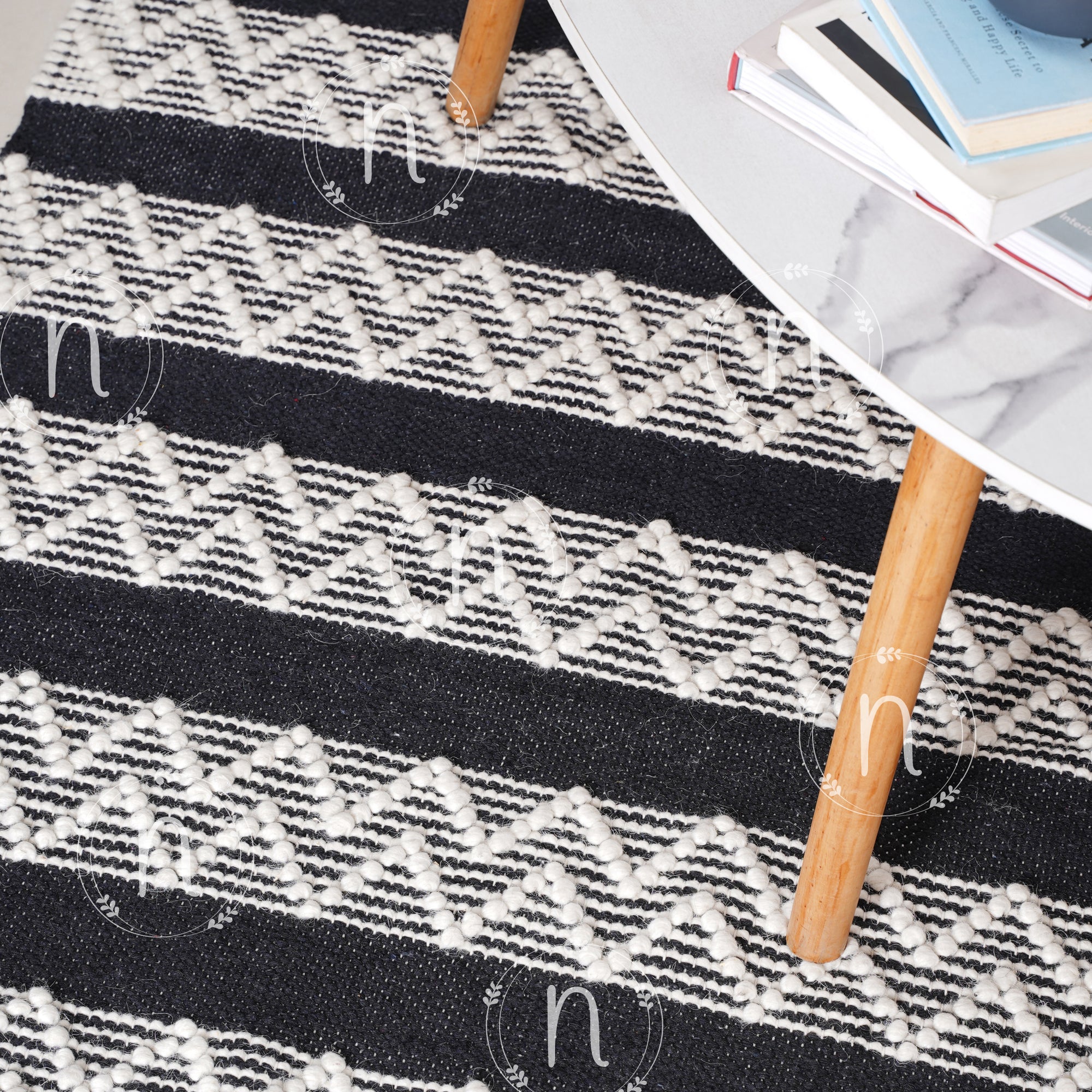 Black and white patterened rug which is handwoven makes for a chic area rug. The black and white zig zag patterns add to the cozy atmosphere of any room.