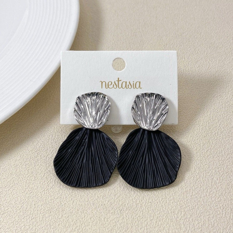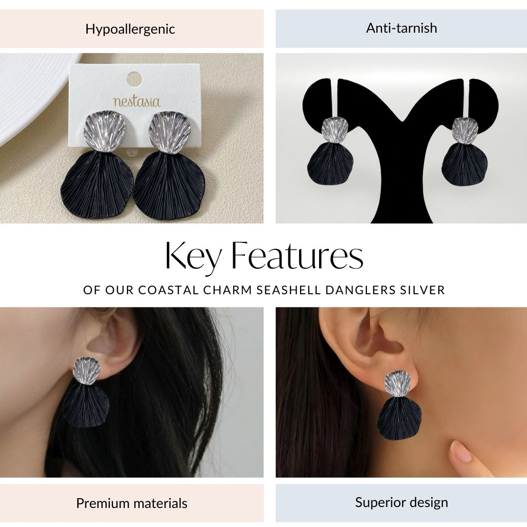 Embrace the beach vibes with these exquisite dangler earrings, where elegance meets nature. The gold-toned metal top is shaped like a small seashell, attached to a back pin, while a larger black seashell dangler cascades beneath. Both elements feature a textured finish, enhancing their intricate design. Inspired by the graceful flow of the sea, these earrings capture the essence of coastal treasures, bringing a touch of nature’s allure to your look with every movement. Perfect for those who love a blend of sophistication and earthy charm.