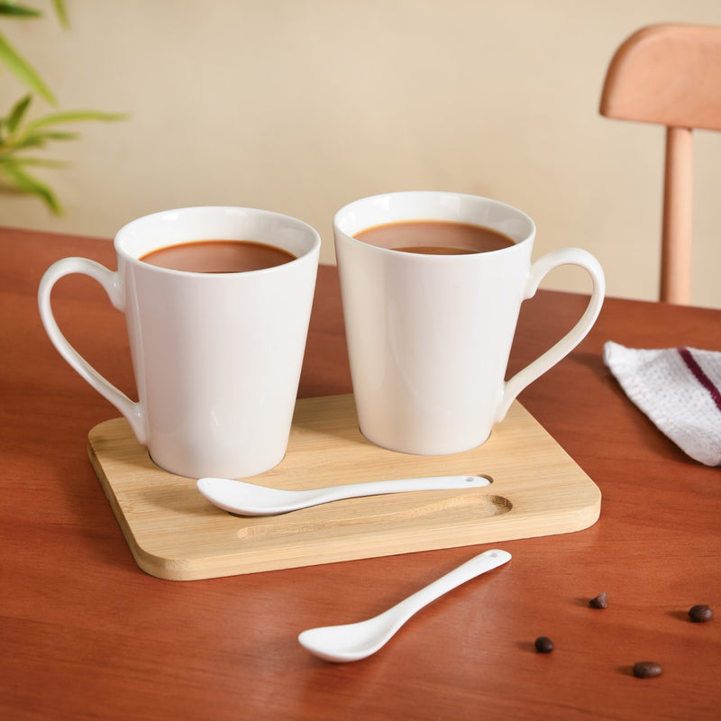 Design: The set features two ceramic coffee mugs with easy-grip handles for comfortable use, accompanied by two sleek ceramic small spoons. The smooth, glossy finish and pristine white hue of both the mugs and spoons add a touch of elegance to any setting. The included wooden tray not only holds the set securely but also enhances its natural, organic aesthetic, making it perfect for serving tea or coffee.