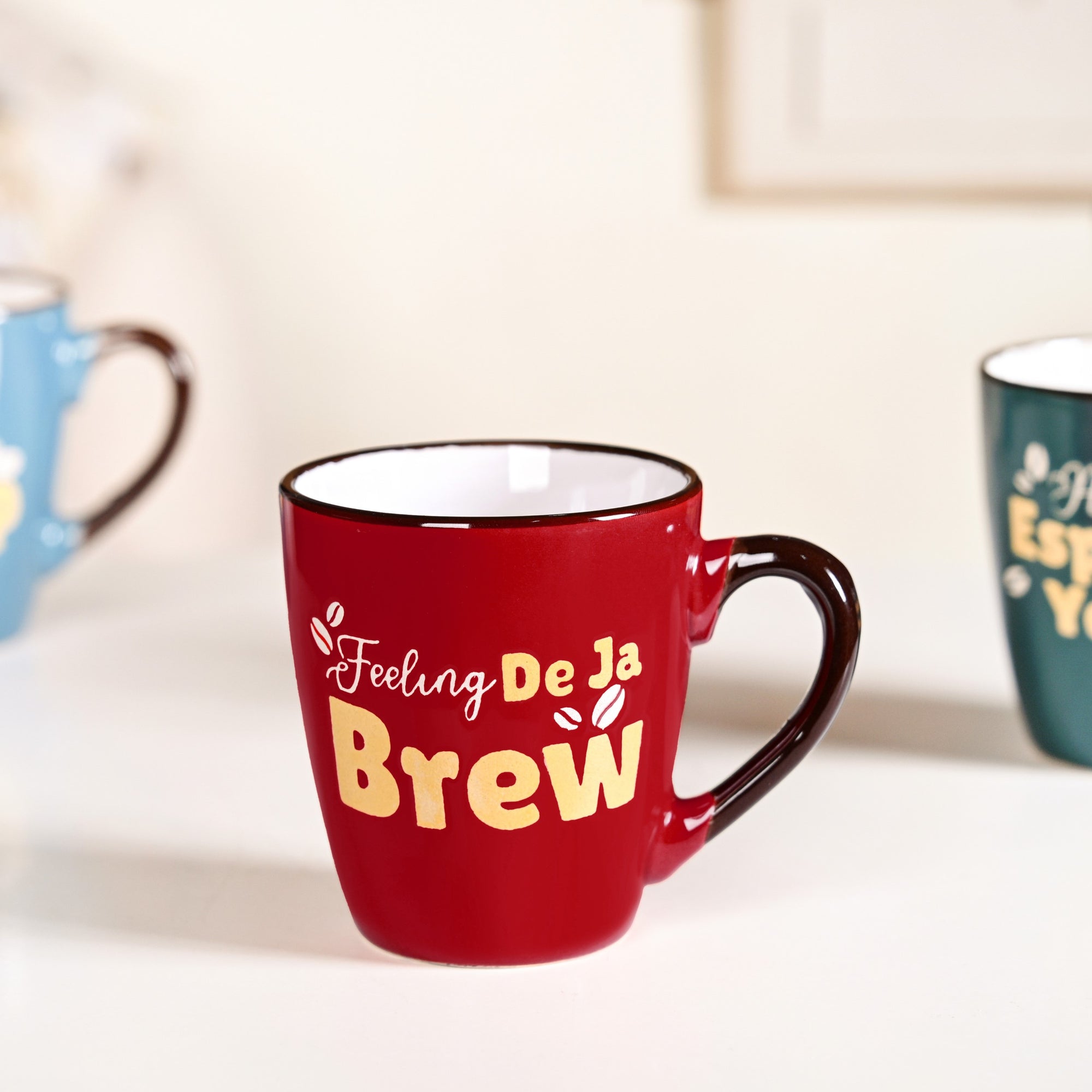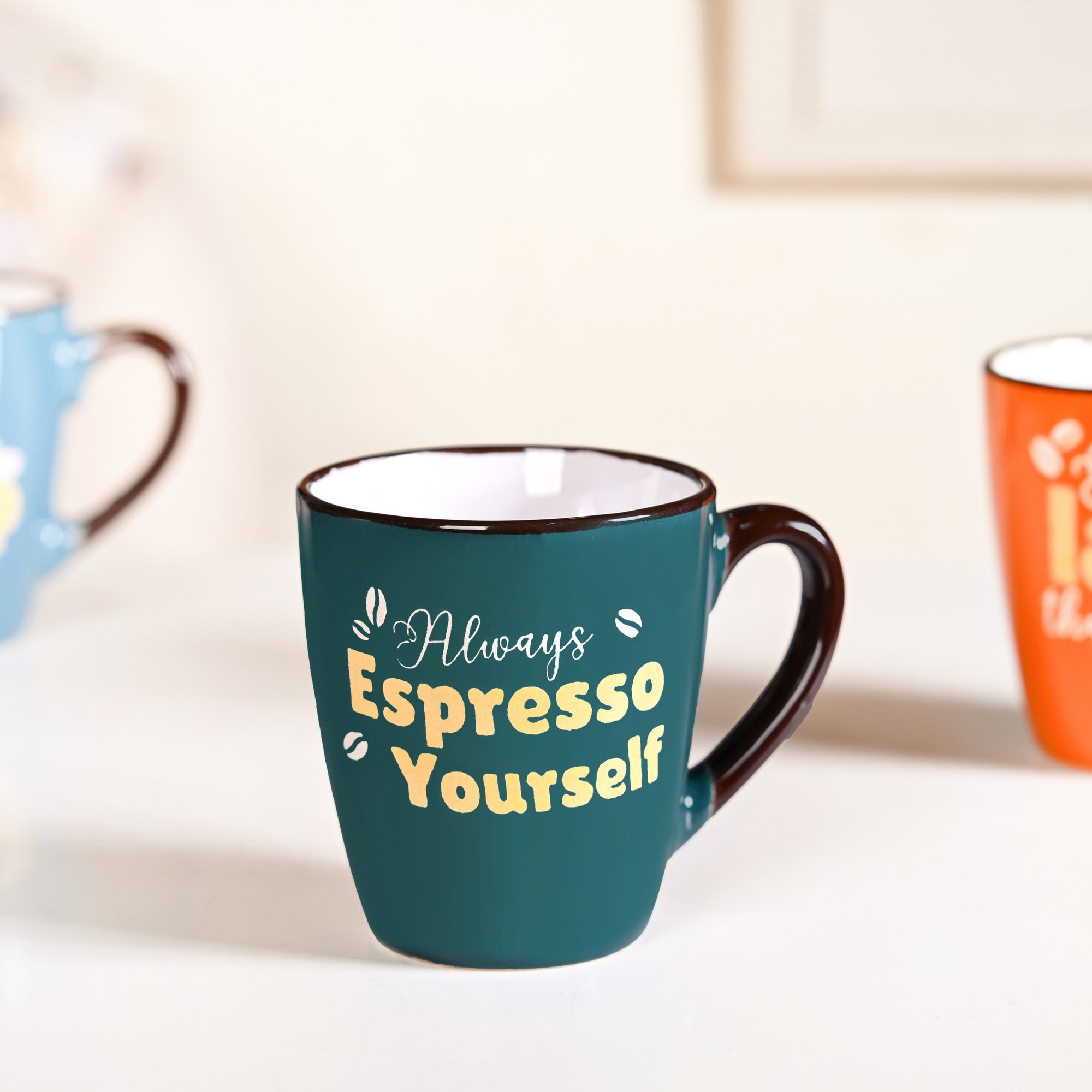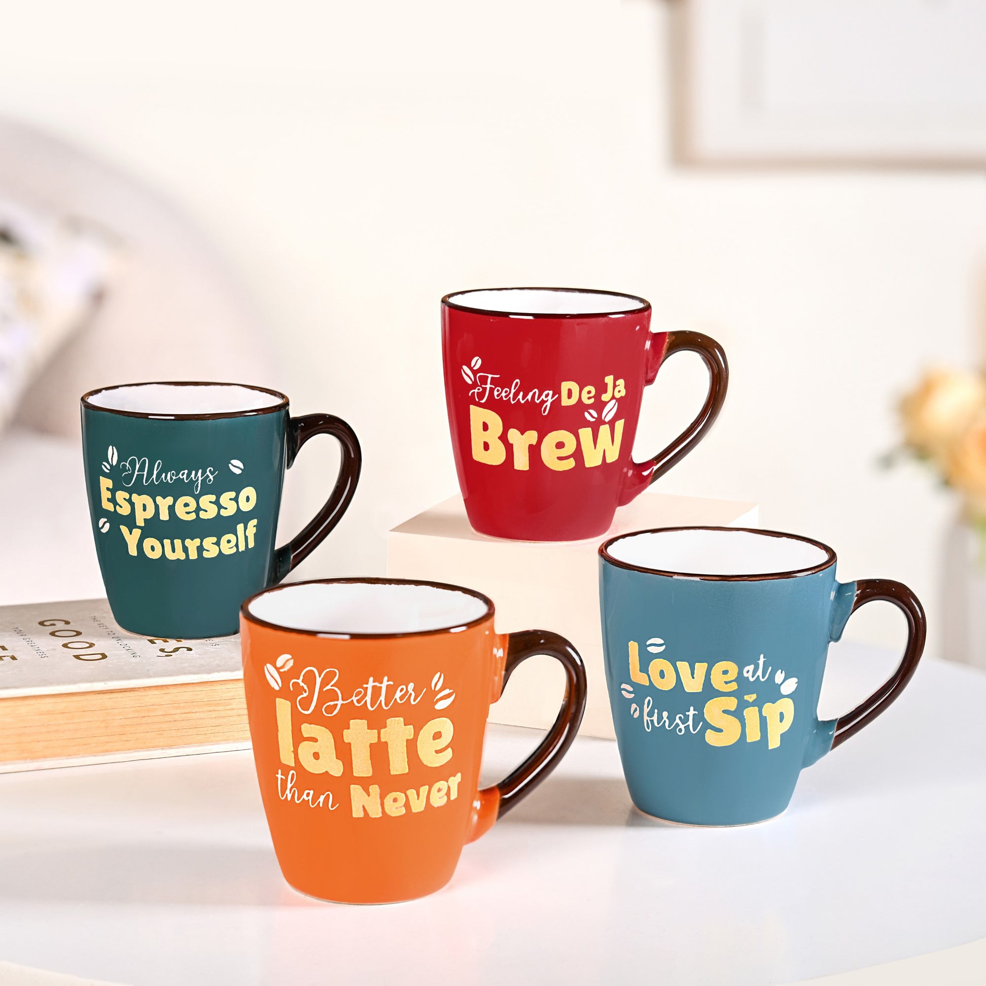 Design: This vibrant ceramic mug set of four brings colour and character to your table. Each glossy mug, finished with a deep brown rim and crisp white interior, comes in rich hues of orange, green, blue, and red. Featuring coffee quotes, “Better latte than never,” “Love at first sip,” “Always espresso yourself,” and “Feeling déjà brew”, these mugs are made for the witty and the woke(pun intended). With sturdy handles, flat bases, and subtly textured bottoms, they strike the perfect balance between playful and practical.