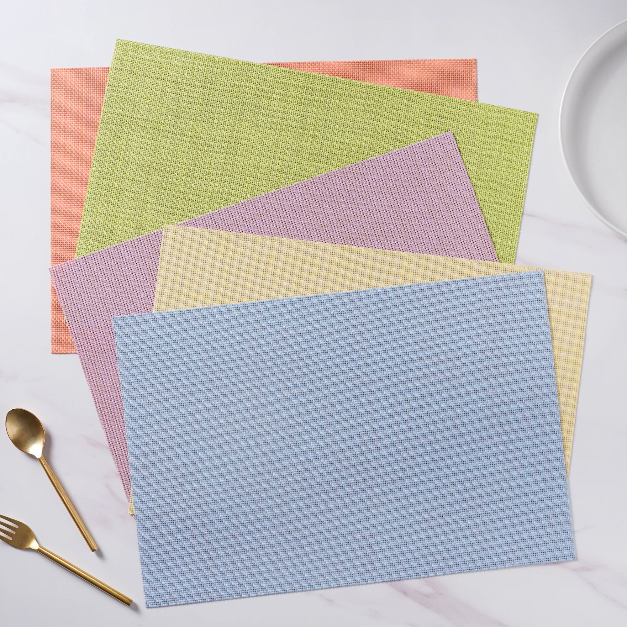 Rectangular table mat or placemat available in five refreshing pastel shades. The mats are easy to place, clean and store and protect the table against heat damage, scratches and food and water spills. They can also be placed on the dresser to keep showpieces or utility organizers. The anti-slip surface assists in keeping the crockery in place while the radiant colours make the dining space lively. Nestip: Use a single tone dinnerware with the mats. The mats can also be placed in different colour combinations to add fun to the dinner table setting. Pair up these single-hued mats with Nestasia's BEADS Butterfly/Flowers Coasters to create a complete spring-summer ambience for an outdoor brunch/dinner plan. Size: 45cm x 30cm Colour: Orange, yellow, blue, pink, green Material: PVC Products included: 1 set of 6 same table mats Style: Orange- RGM95A43 Yellow- RGM95A44 Blue- RGM95A45 Pink- RGM95A46 Green- RGM95A47 Care: Dampen a cloth or sponge with warm water and use a few drops of mild soap to wipe clean any food residue. Rinse the mat with water and allow it to air dry.