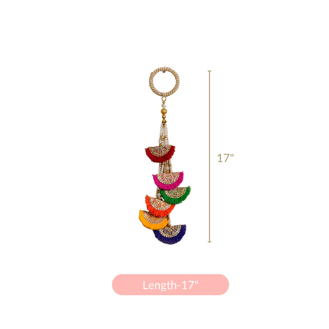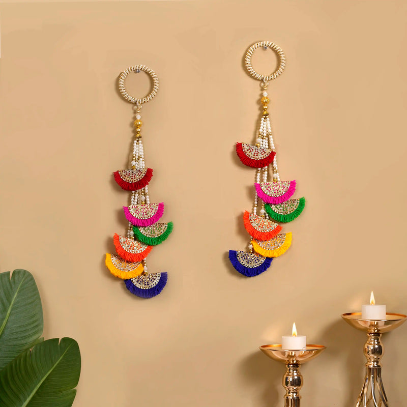 You can hang these door hangings on your main entrance doors to create a warm and welcoming atmosphere during festive occasions. They can also be used as wall decor in your living room or any other space where you want to infuse a touch of traditional charm and opulence. The golden metalwork and vibrant pom-pom hangings will add a burst of colour and joyful energy to your festive setup.