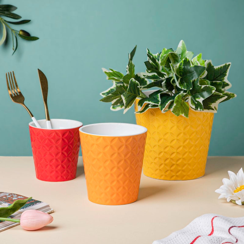Long lasting and durable, the set of 3 bright planters comes in 3 distinctive colours and sizes. The ceramic planters feature a textured surface that will brighten up the dull & drab corners of the room. The planter set can be used in the bathroom, or as flower pots and plant pots for gardening. The bright red, yellow, and orange colours of the ceramic planters add a splash of colour to the monotonous surroundings.