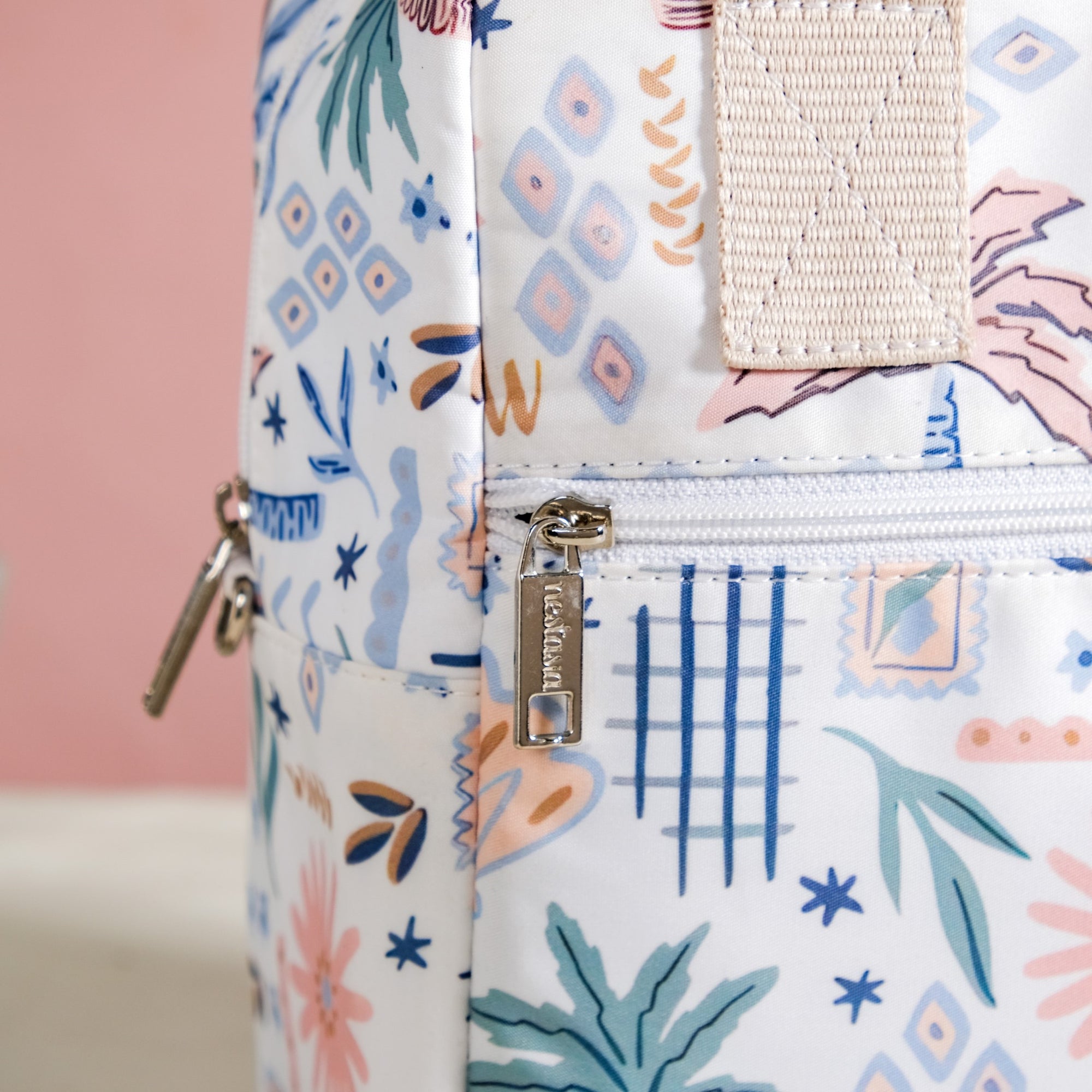 Design: Featuring an abstract tropical print, this nylon lunch bag blends charm with practicality. The water-resistant exterior ensures easy cleaning and protection from spills, while the beige woven handles offer a comfortable grip. A front zipper pocket keeps cutlery organised, and sturdy stitching supports long use. Rounded corners, soft lining and a reinforced bottom complete its sleek structure.