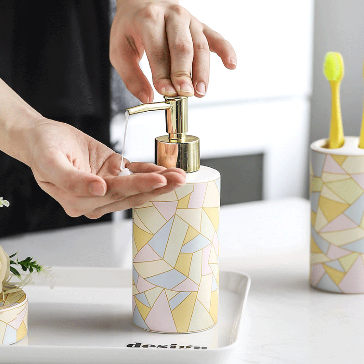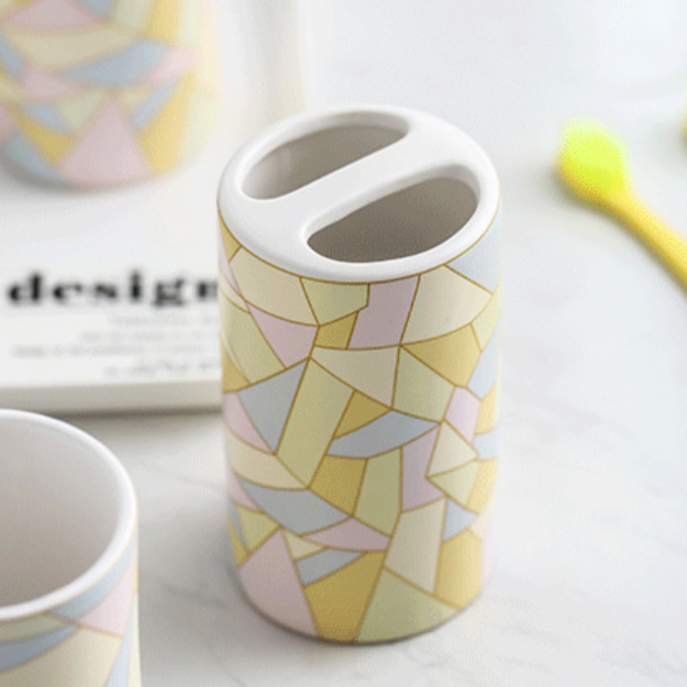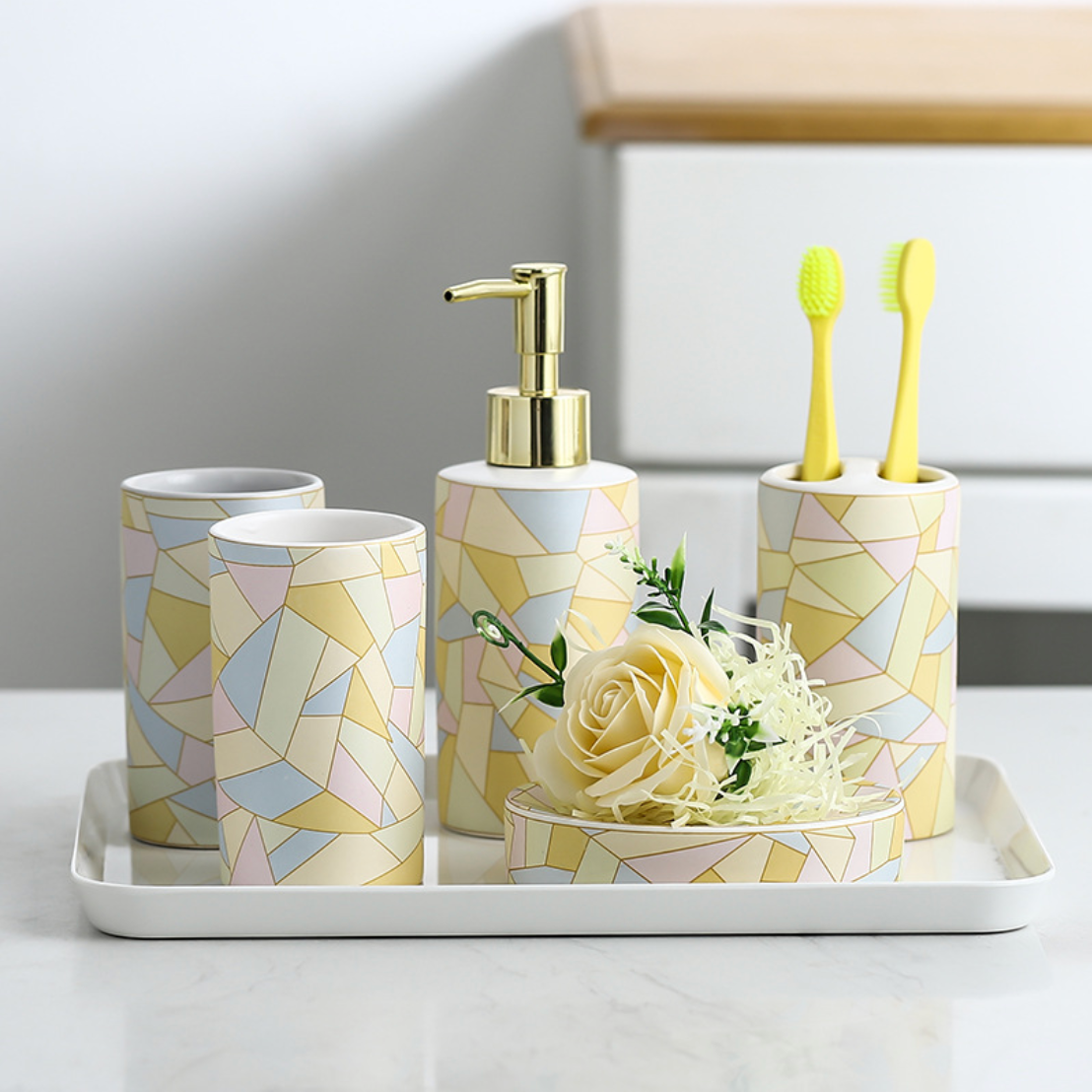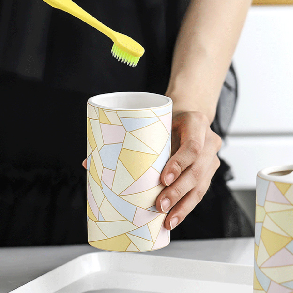 Give your washroom a stunning makeover with the multicolored bathroom set. The subtle shades of pastel tones with gold details will illuminate the bath setting with charm. The ceramic bath set consists of two mouthwash cups, a toothbrush tumbler, a soap dish, and a soap dispenser. One can use the tumblers for storing any bath essentials. The bath set is a perfect gift hamper for loved ones.