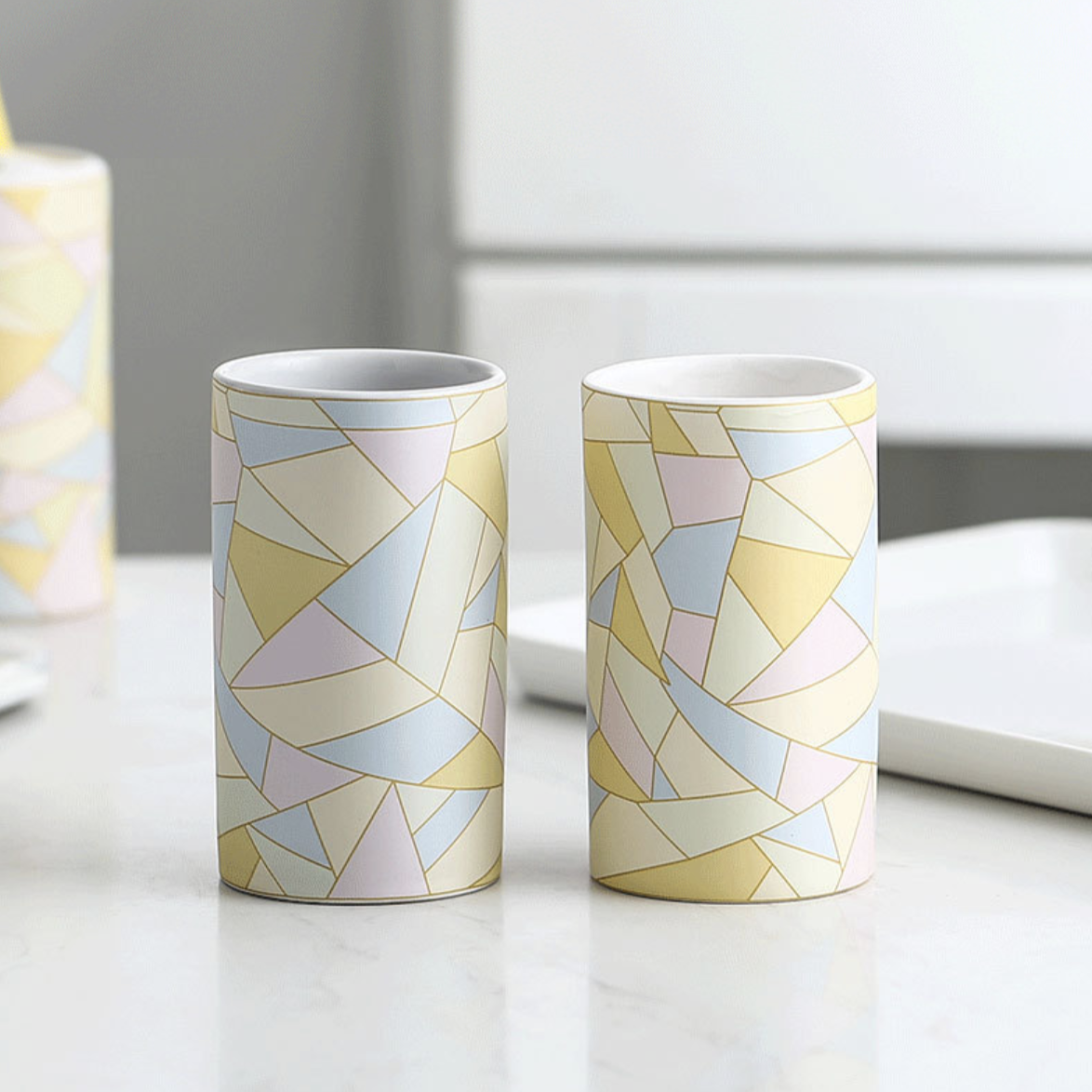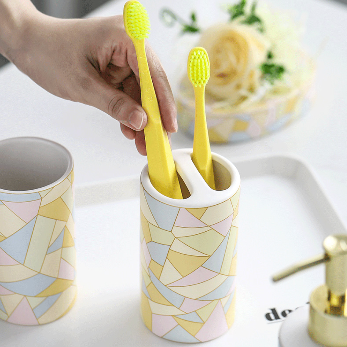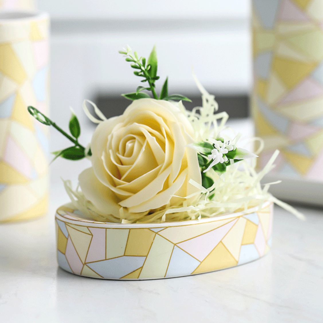 Give your washroom a stunning makeover with the multicolored bathroom set. The subtle shades of pastel tones with gold details will illuminate the bath setting with charm. The ceramic bath set consists of two mouthwash cups, a toothbrush tumbler, a soap dish, and a soap dispenser. One can use the tumblers for storing any bath essentials. The bath set is a perfect gift hamper for loved ones.