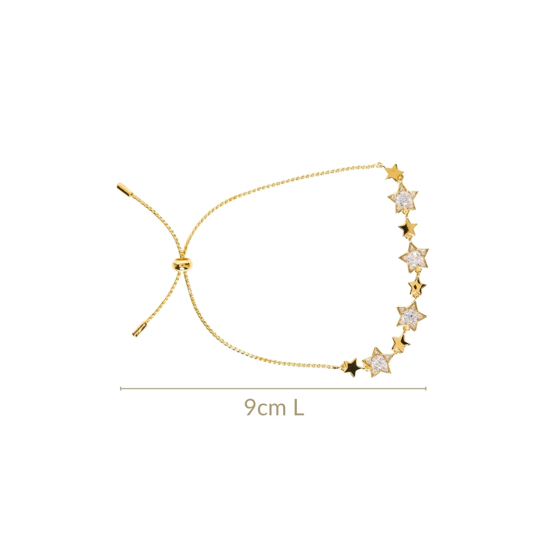 Stars on your wrist, sparkle in your stride - let your style shine with this gold-toned metal chain bracelet. Delicately adorned with star charms, it brings a touch of celestial elegance to any look. The larger stars twinkle with round-cut sparkling stones, catching the light beautifully with every movement. Designed for comfort and effortless charm, the lightweight chain drapes gracefully, making it perfect for both everyday wear and special occasions. Whether worn solo for a minimalist statement or layered for added brilliance, this charm bracelet is a dreamy addition to any accessory collection.