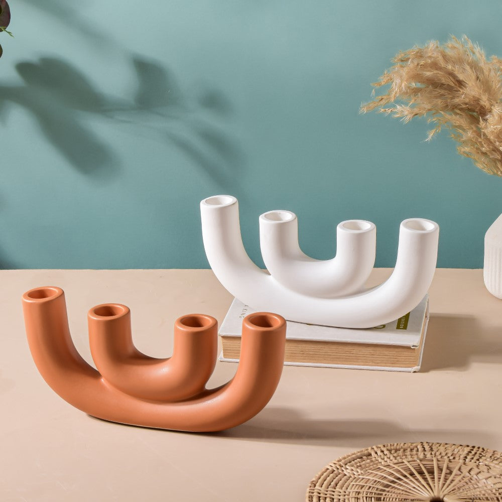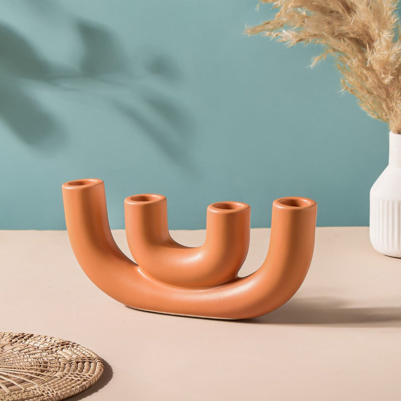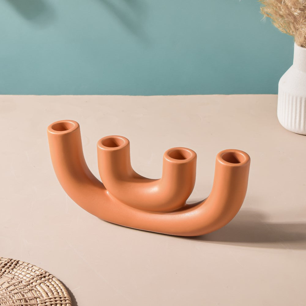 The modern contemporary designed candle stand makes for a stylish way to illuminate the space when decorated with tapered candle sticks. Crafted of chic ceramic material, the candle holder features a soothing peach colour that blends seamlessly with other vibrant decor elements. The candle holder is equipped with an anti-skid foam base that can be safely placed on table tops. The candle holder has 4 slots to place tapered candles to effortlessly beautify the interior.