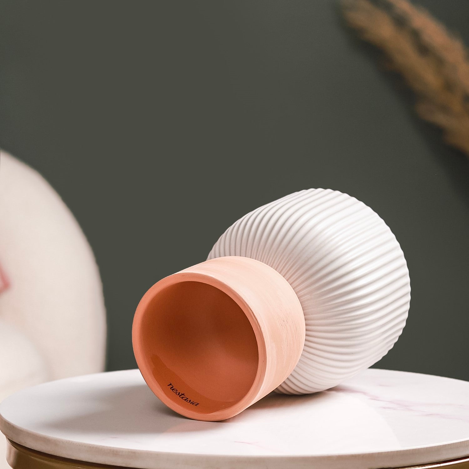 Our durable and stylish ceramic vase strikes the perfect balance between artistic expression and functionality. It features a pristine ribbed bowl-shaped white top elegantly placed above a soft beige-coloured base. Crafted with meticulous attention to detail, this abstract flower vase showcases a harmonious fusion of form and colour, creating a visual masterpiece that is sure to captivate any observer. The bowl-shaped white top evokes a sense of serenity, while the earthen beige colour induces warmth and depth to the overall composition.
