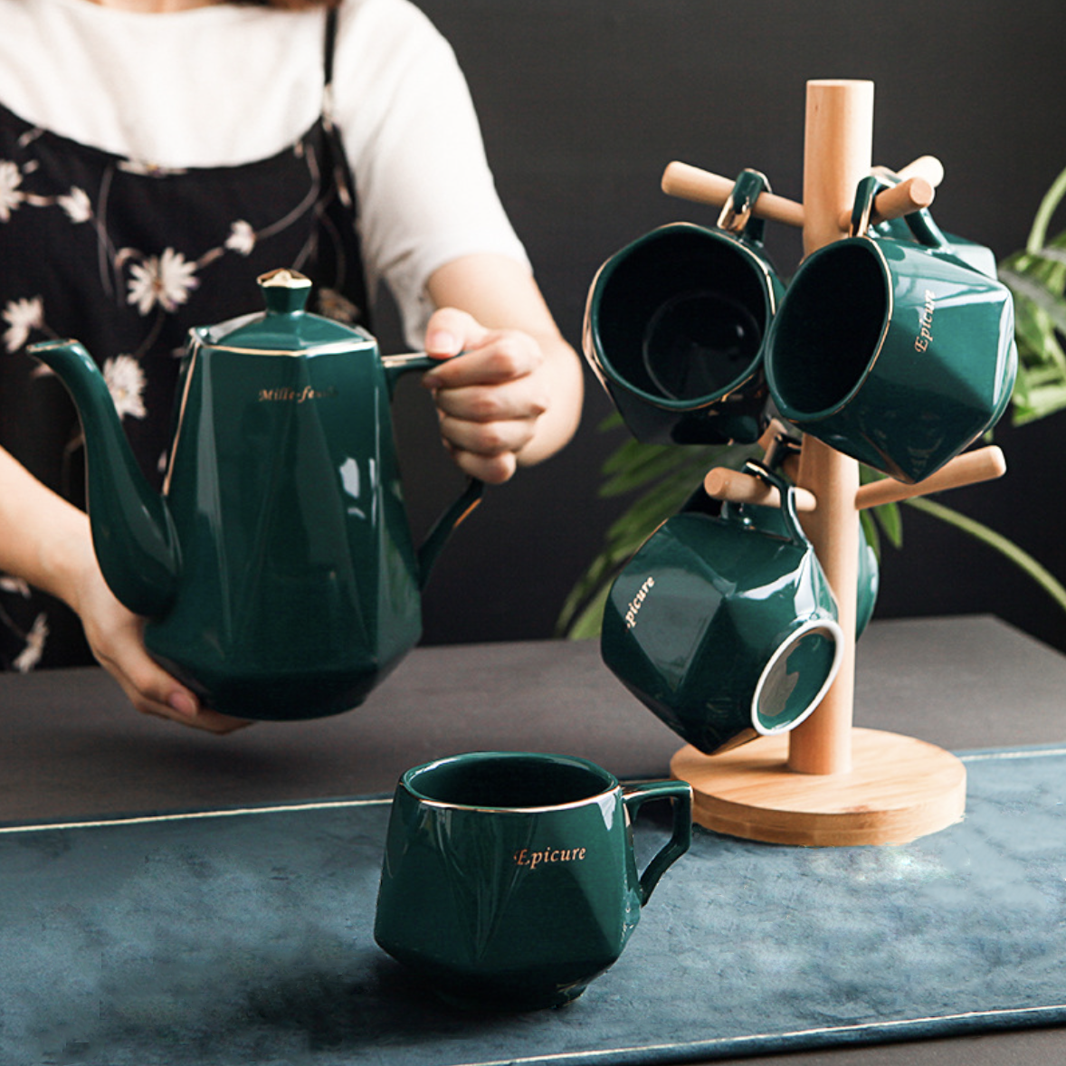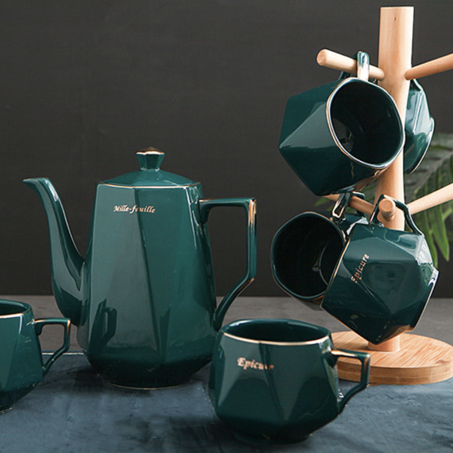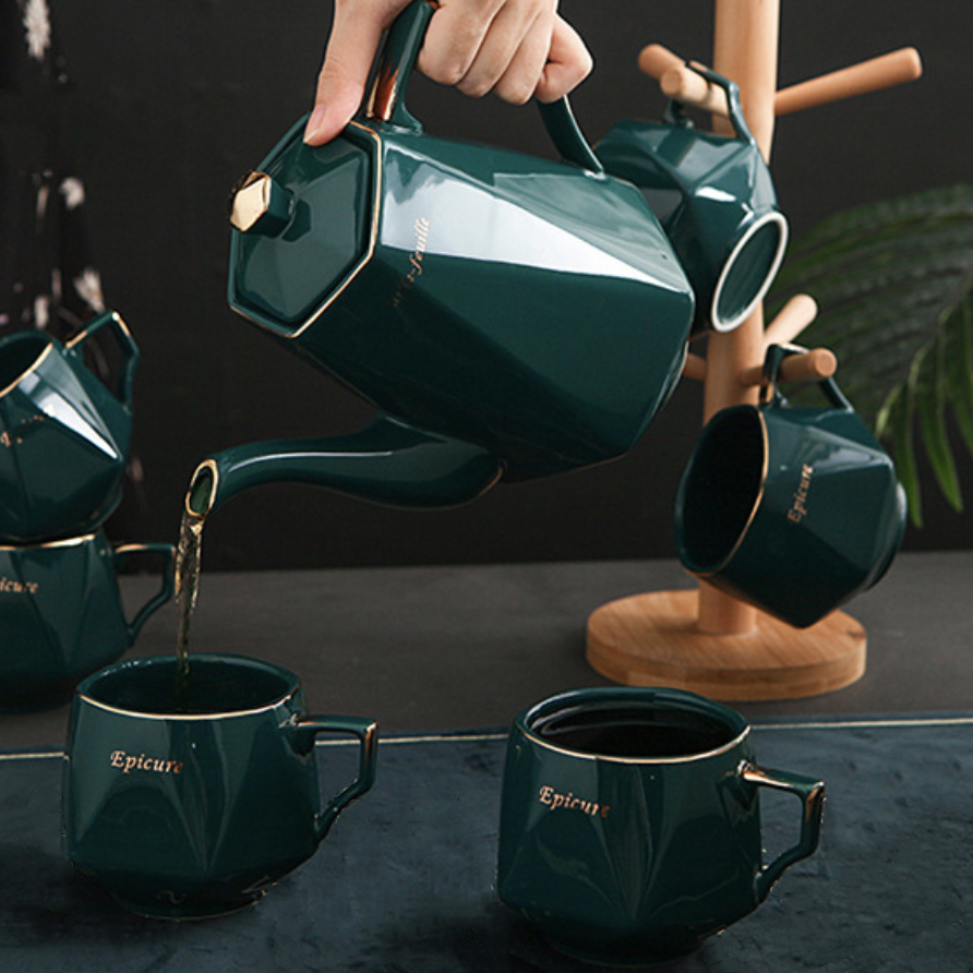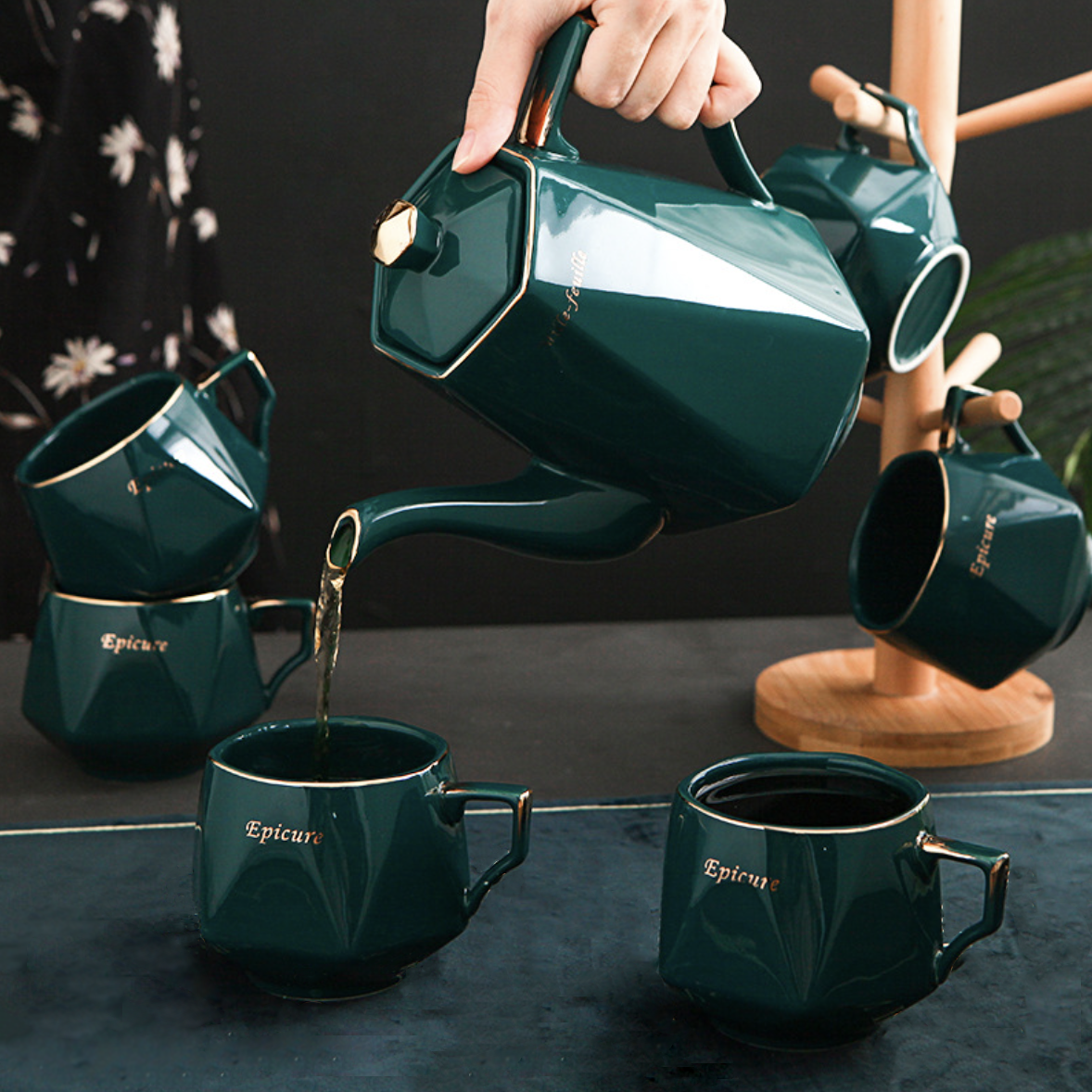 Welcome guests into the comfort of one's home with a chic tea set consisting of a versatile teapot and six teacups with a contemporary feel in its look and texture. The teacups, made of ceramic and given a smooth polish, come in handy when entertaining a few guests at home. The dark green tea set would make a thoughtful gift for any chai lover. One could serve all types of tea, be it black, green, oolong, white, or dark tea, in the modern design tea set. The clay used in making the mugs and pot is non-porous and therefore does not interfere with the unfolding of the aromas and flavors. Because the material used is neutral, it does not leach (transfer molecules from the cup), or trap residues of the tea's components in its small pockets of space.