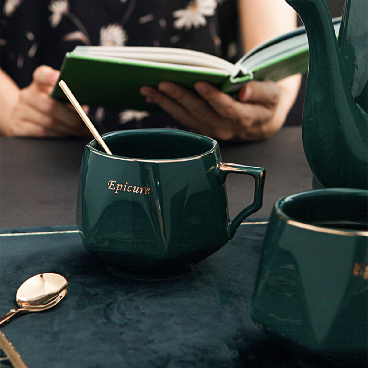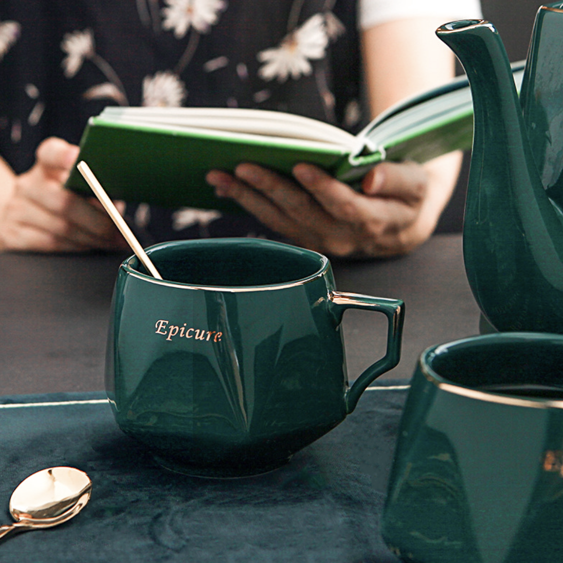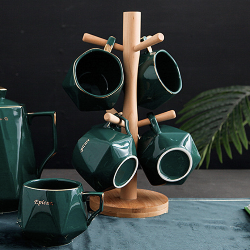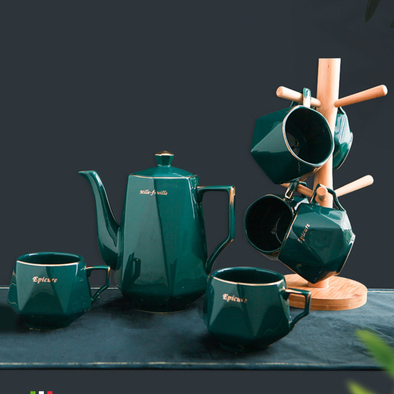 Welcome guests into the comfort of one's home with a chic tea set consisting of a versatile teapot and six teacups with a contemporary feel in its look and texture. The teacups, made of ceramic and given a smooth polish, come in handy when entertaining a few guests at home. The dark green tea set would make a thoughtful gift for any chai lover. One could serve all types of tea, be it black, green, oolong, white, or dark tea, in the modern design tea set. The clay used in making the mugs and pot is non-porous and therefore does not interfere with the unfolding of the aromas and flavors. Because the material used is neutral, it does not leach (transfer molecules from the cup), or trap residues of the tea's components in its small pockets of space.