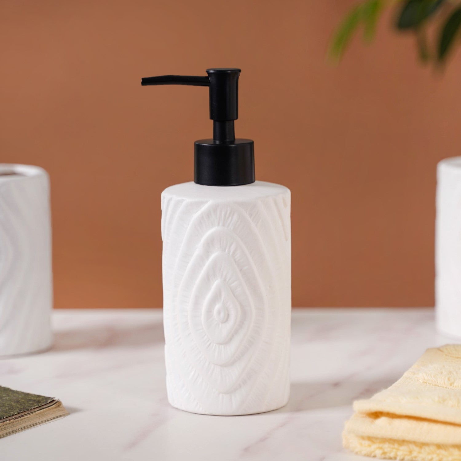The ceramic bath set includes a liquid soap dispenser, a toothbrush holder, and a tumbler.