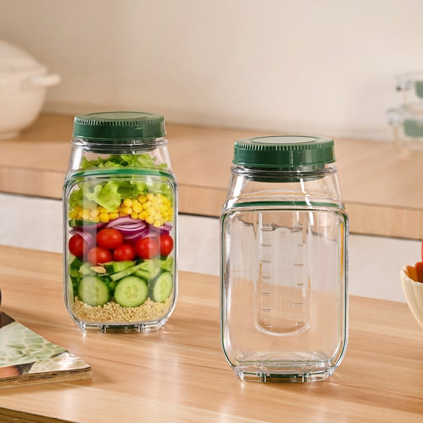 Design: Made from durable PET, each jar features a clear body with green accents for easy visibility of layered ingredients. The side-opening structure unfolds into a bowl-like form, while a bottom clip lock keeps the container securely closed. Each jar also comes with a leakproof lid and a separate dressing cup.
