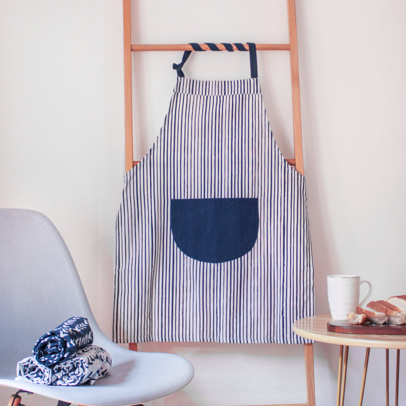 Cooking aprons in a classic striped print pattern and a solid color pocket in the front that are available in 4 different variants. The aprons have an adjustable strap at the back and neck which can be tied to adjust as per the fittings. The kitchen aprons are apt to be used while cooking and cleaning. The fabric of the aprons can be hand washed easily and is super soft. The aprons can be bought together for a cooking party experience.